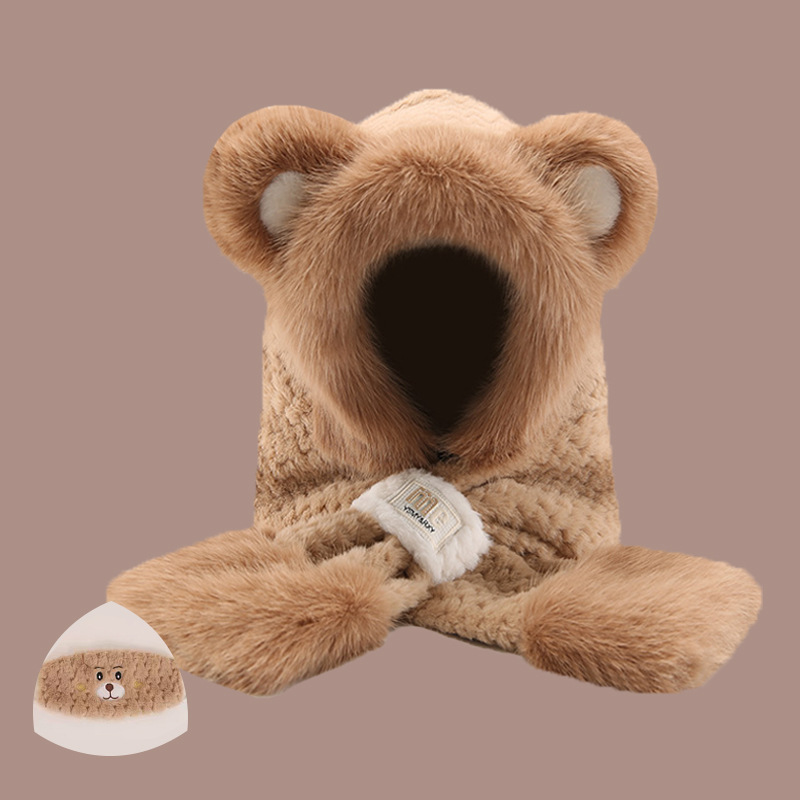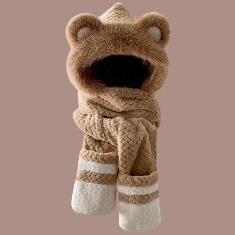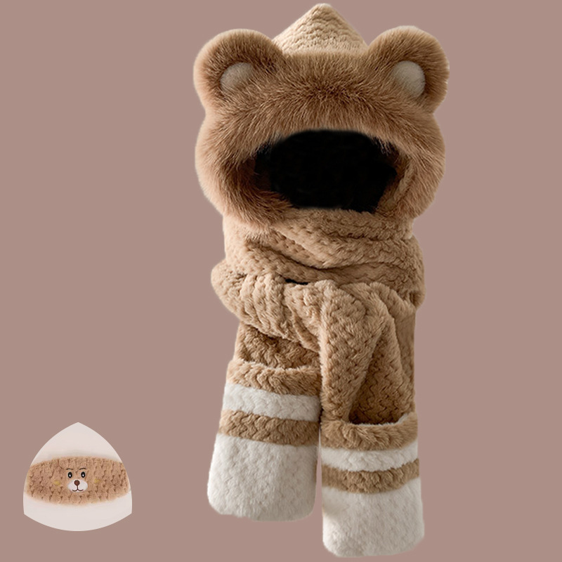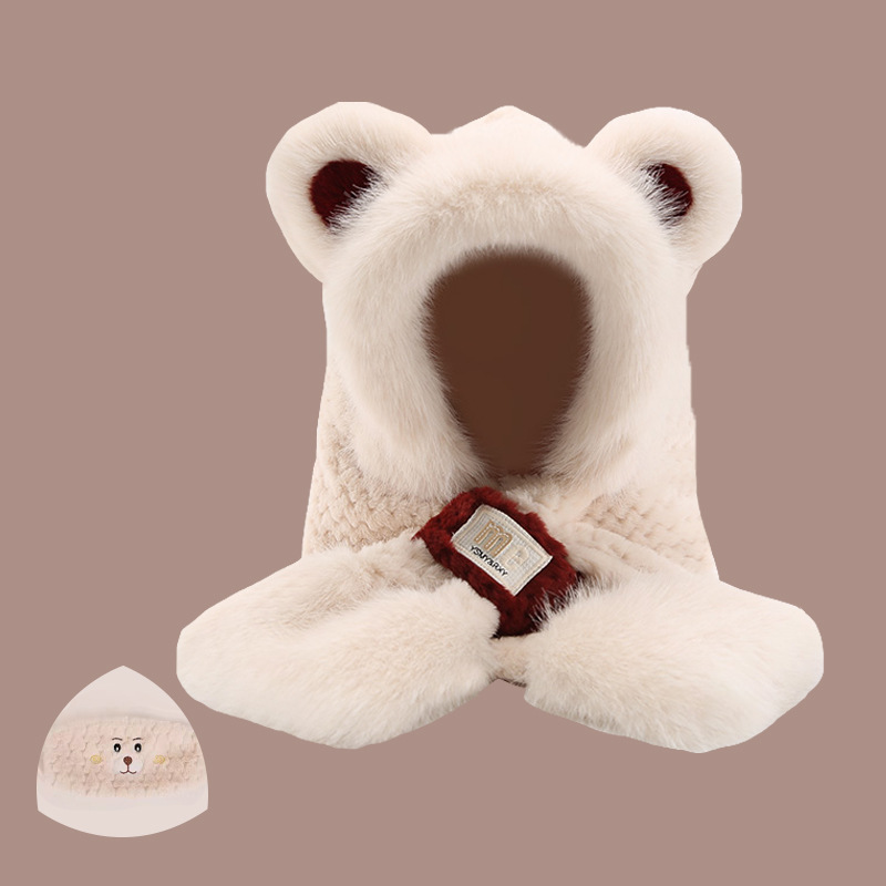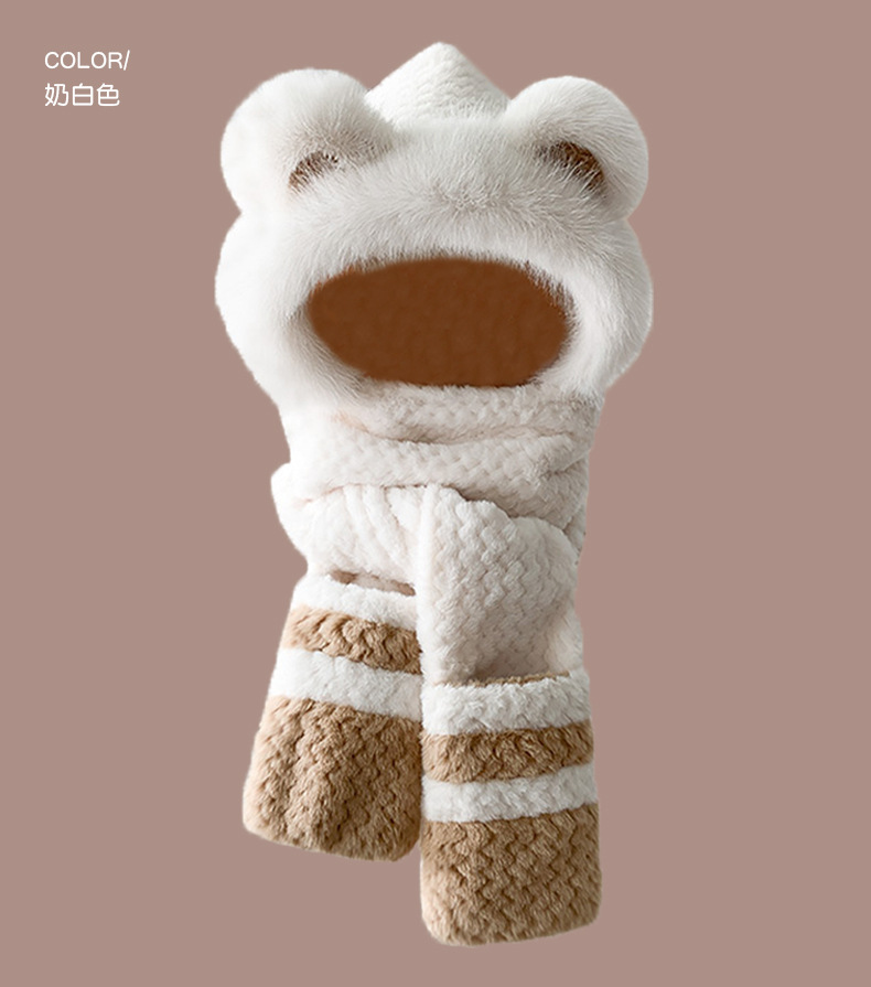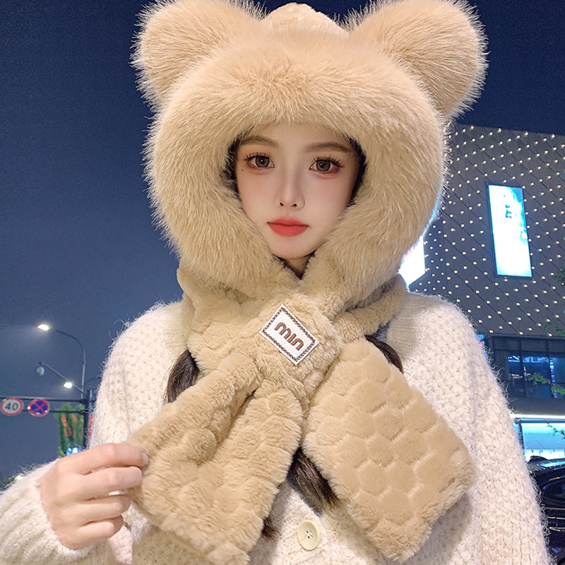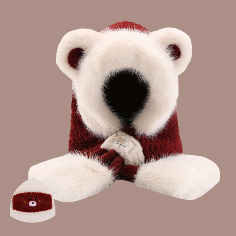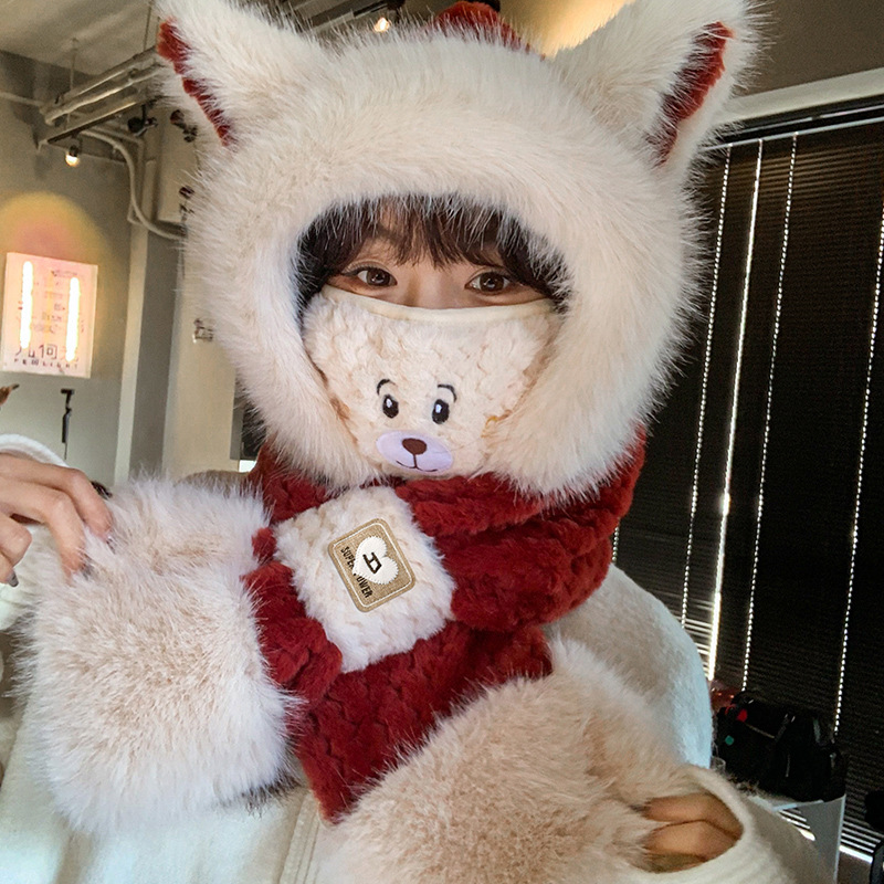 2024 새로운 방한 따뜻한 곰 플러시 모자 스카프 장갑 올인원 여성 겨울 두꺼운 귀 보호 사이클링 모자