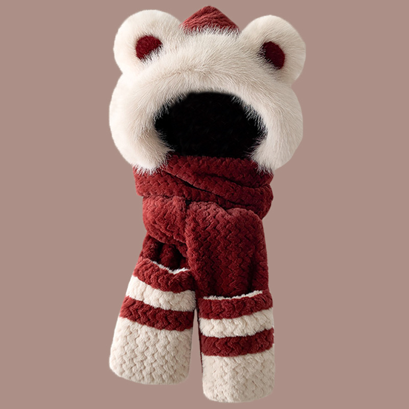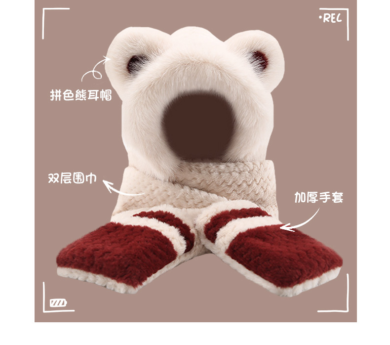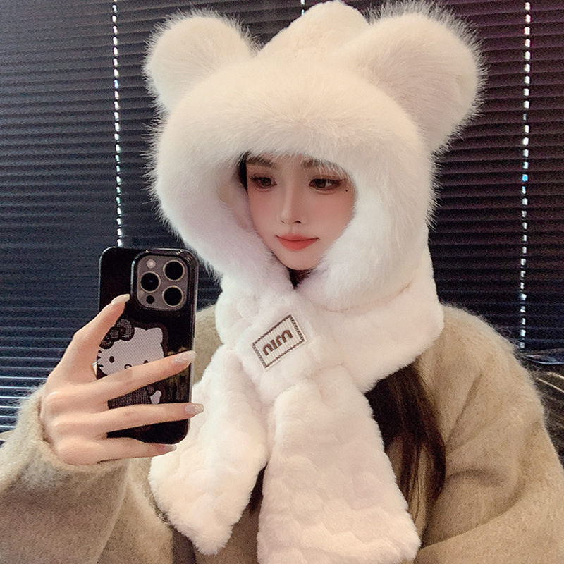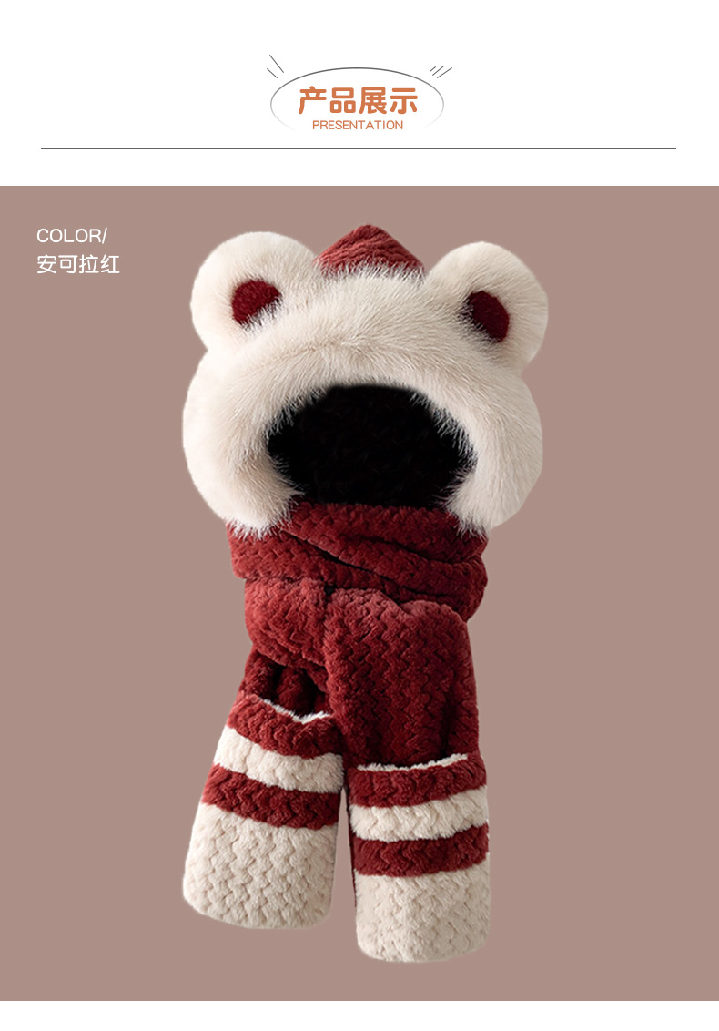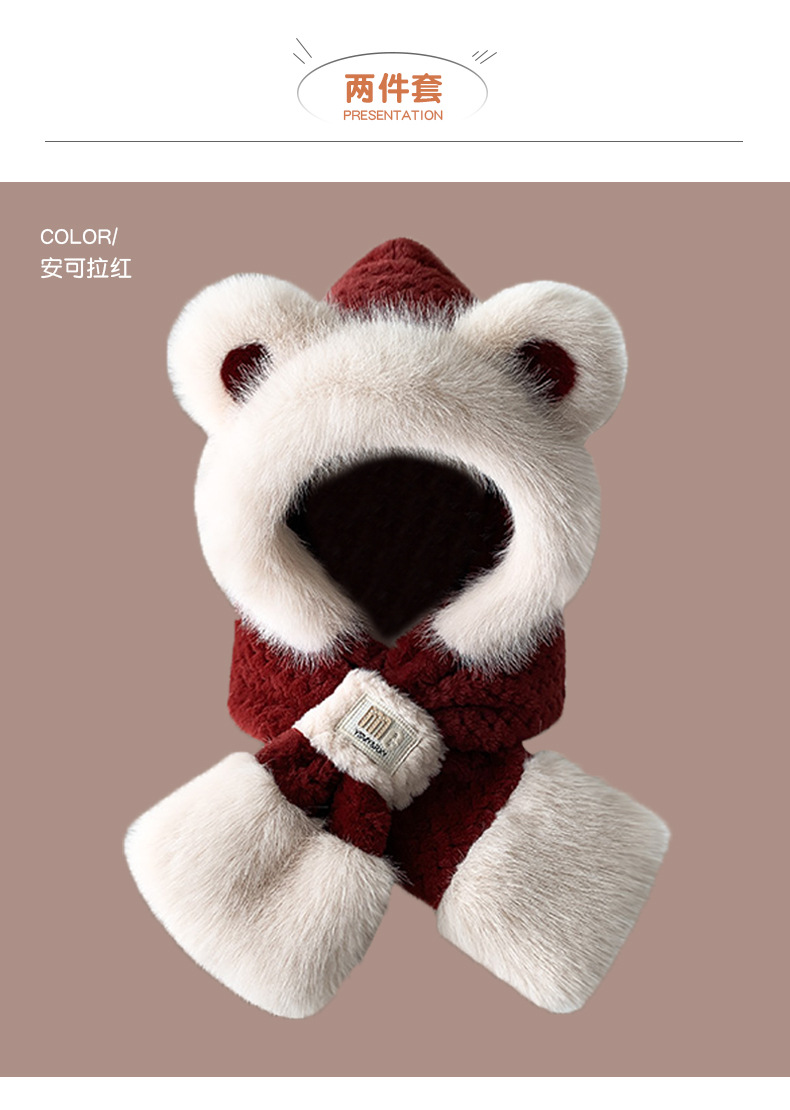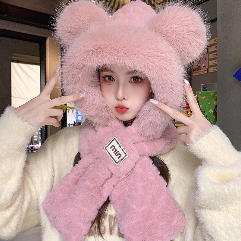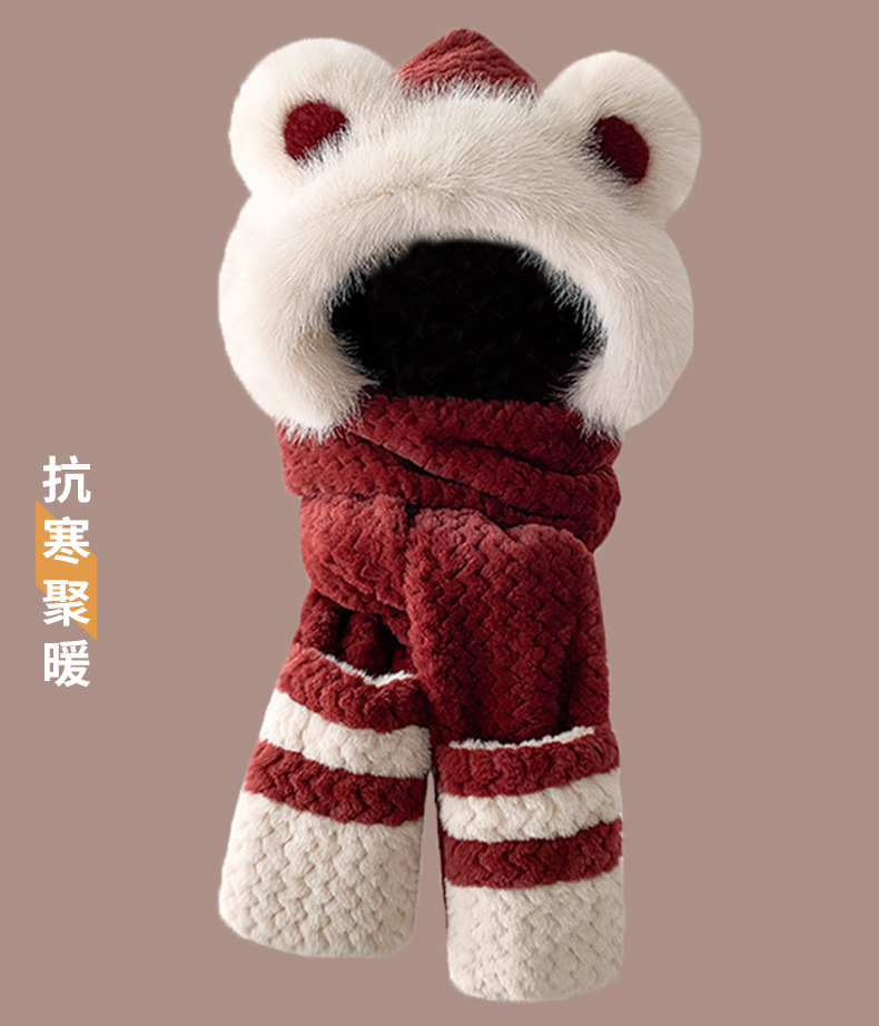 2024 새로운 방한 따뜻한 곰 플러시 모자 스카프 장갑 올인원 여성 겨울 두꺼운 귀 보호 사이클링 모자