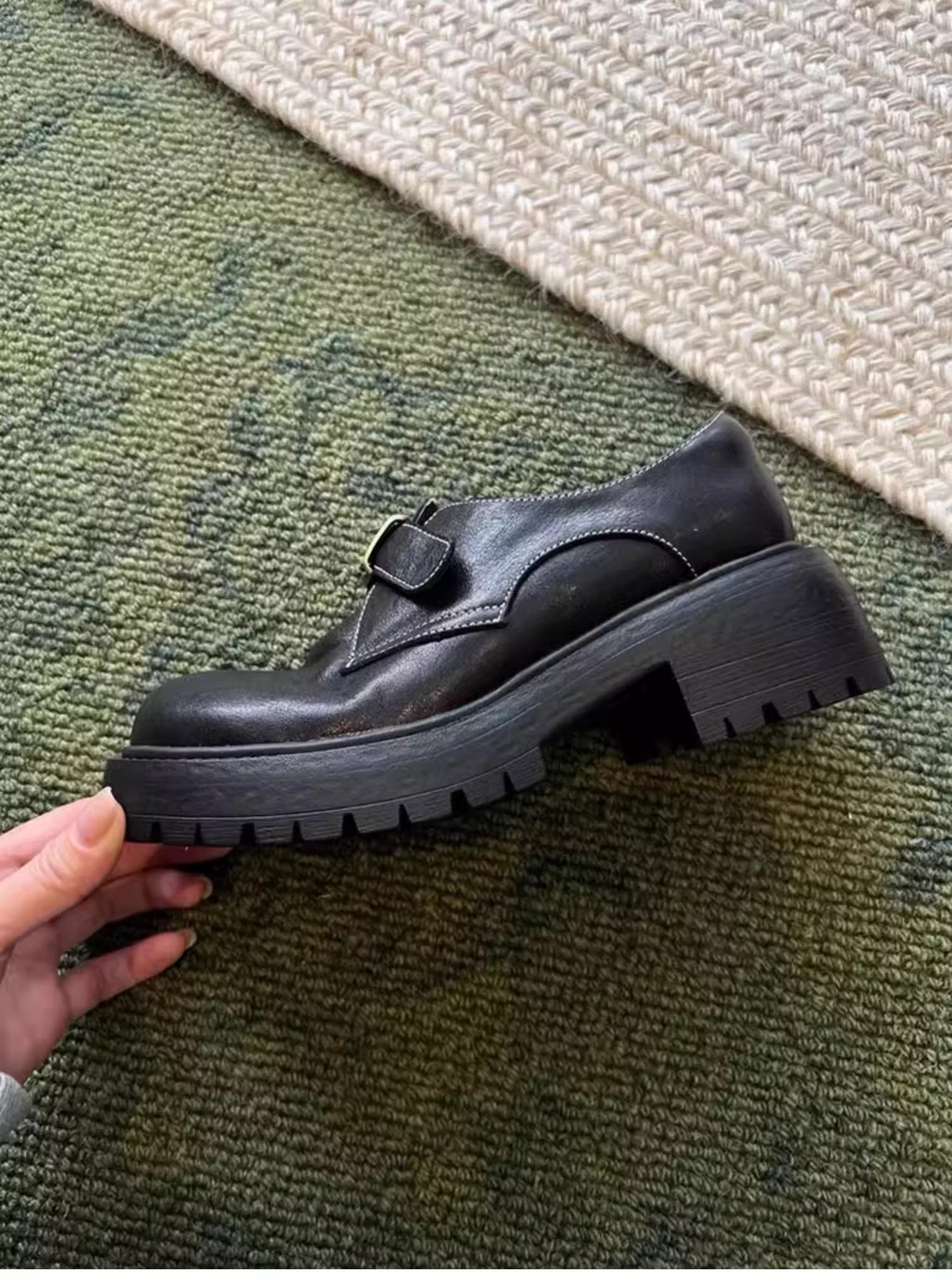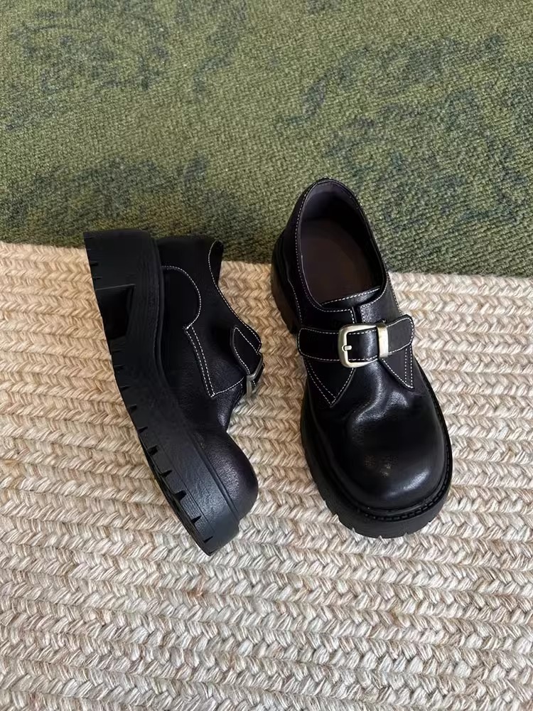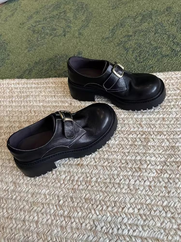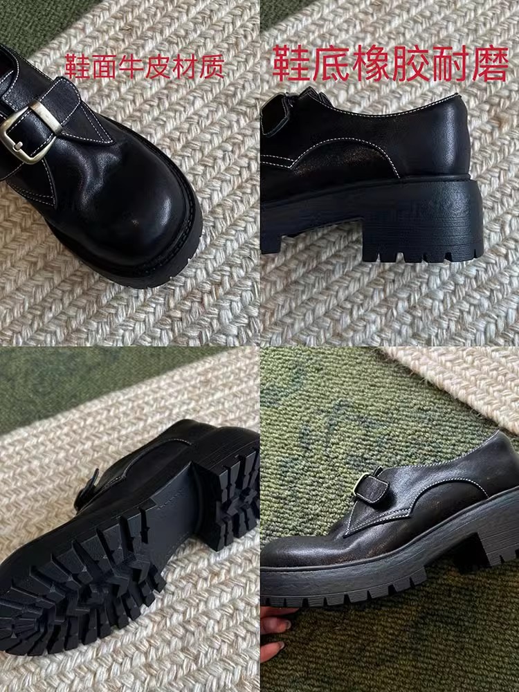 [재고 있음] 여성용 천연 가죽 두꺼운 밑창 두꺼운 굽 작은 가죽 신발 봄, 가을 새로운 벨트 버클 로퍼 영국 다용도 신발스토어 가기