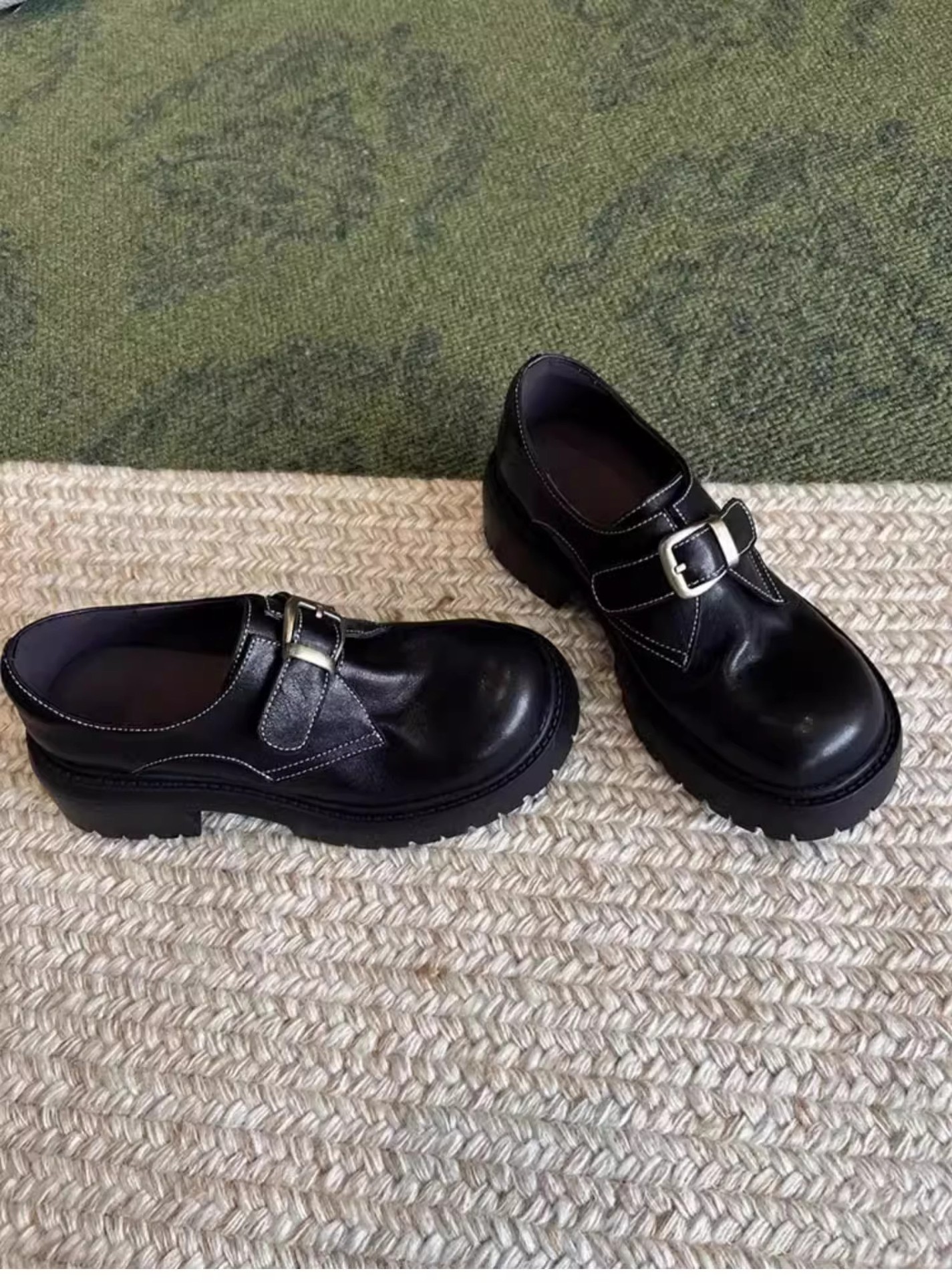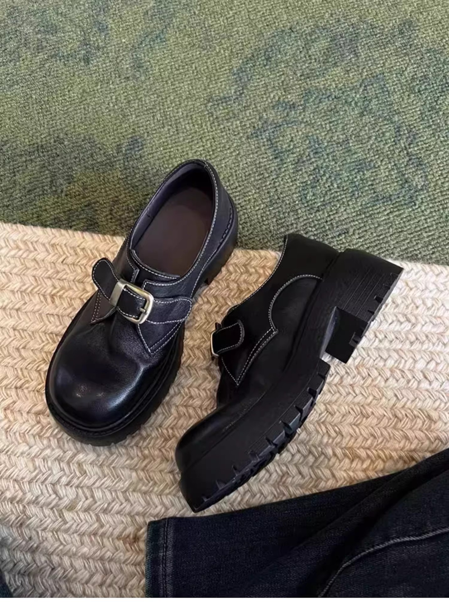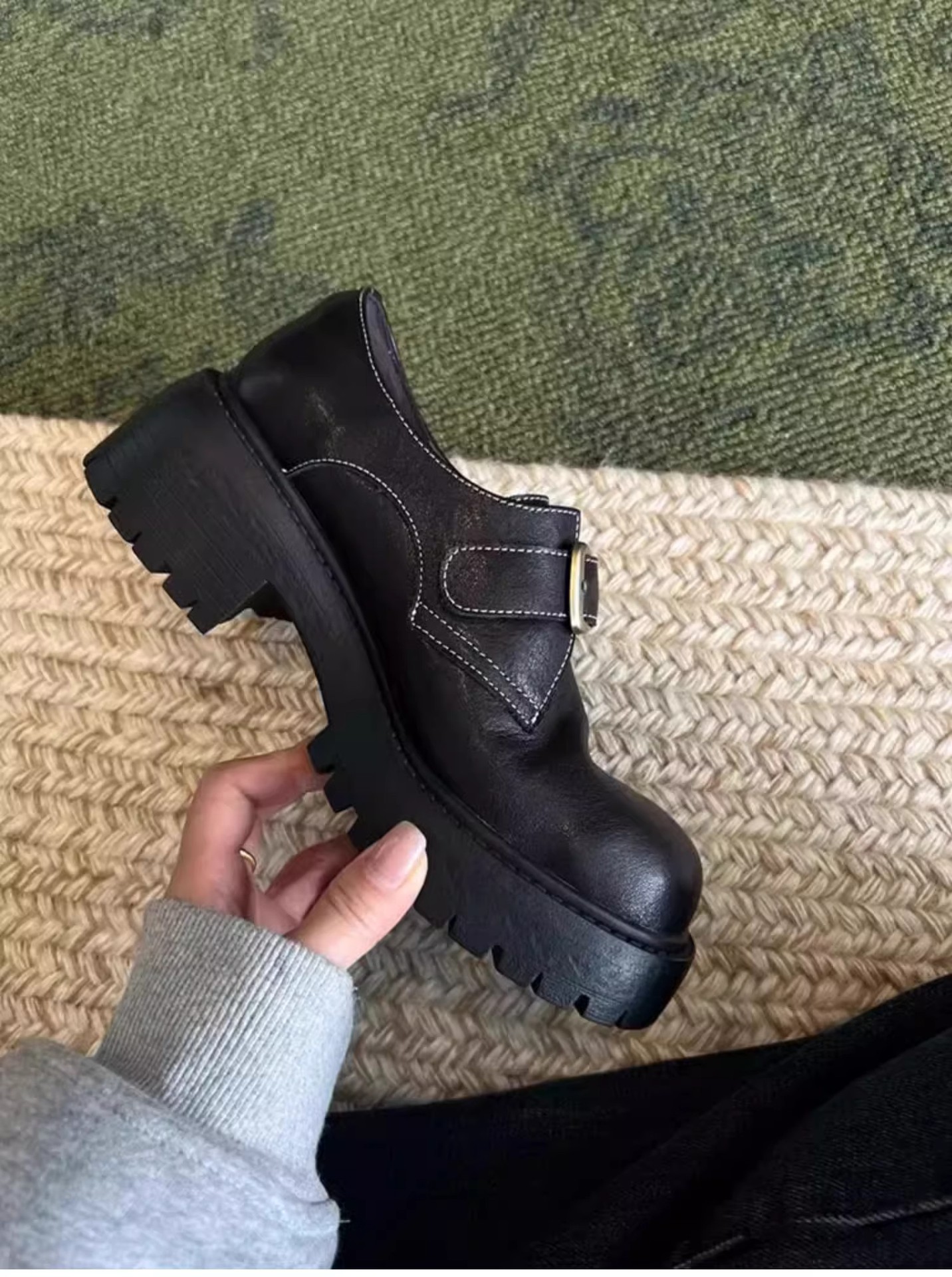 [재고 있음] 여성용 천연 가죽 두꺼운 밑창 두꺼운 굽 작은 가죽 신발 봄, 가을 새로운 벨트 버클 로퍼 영국 다용도 신발스토어 가기