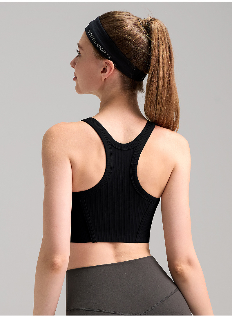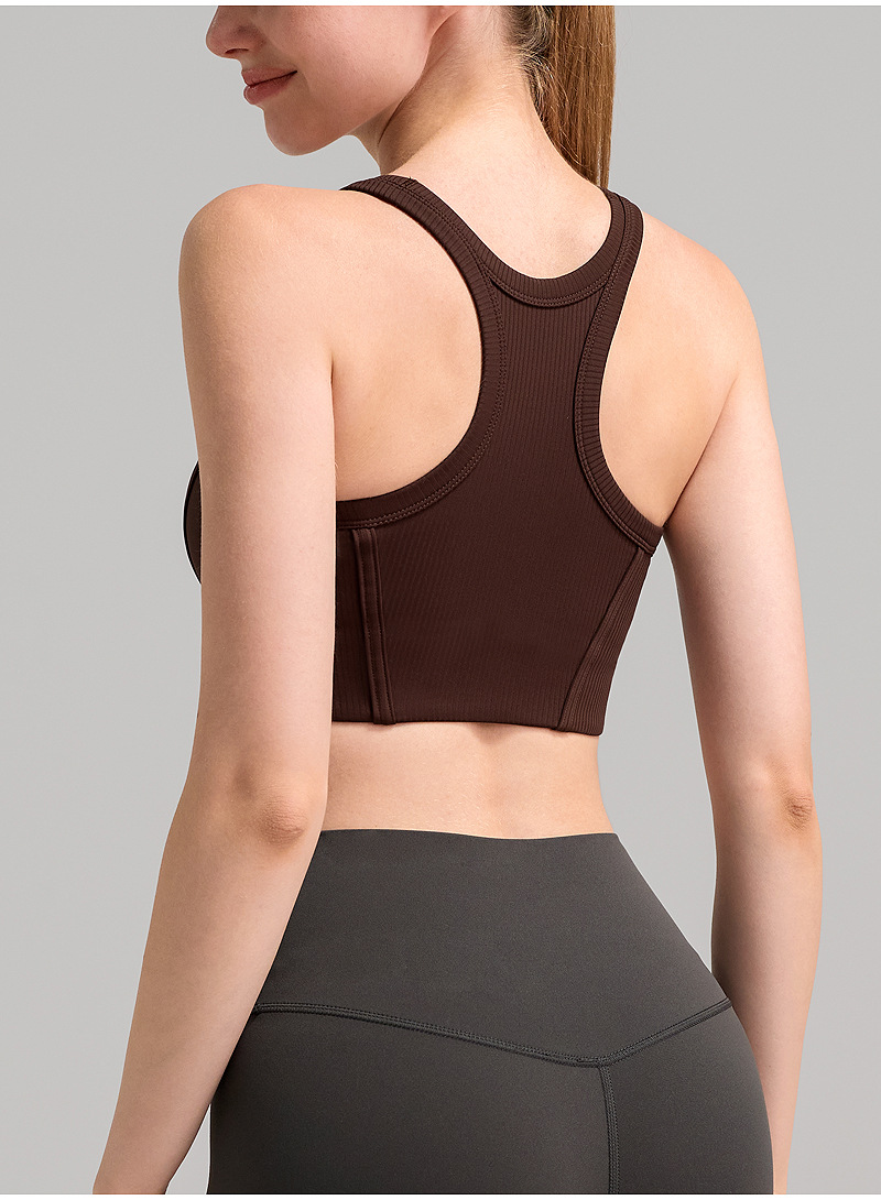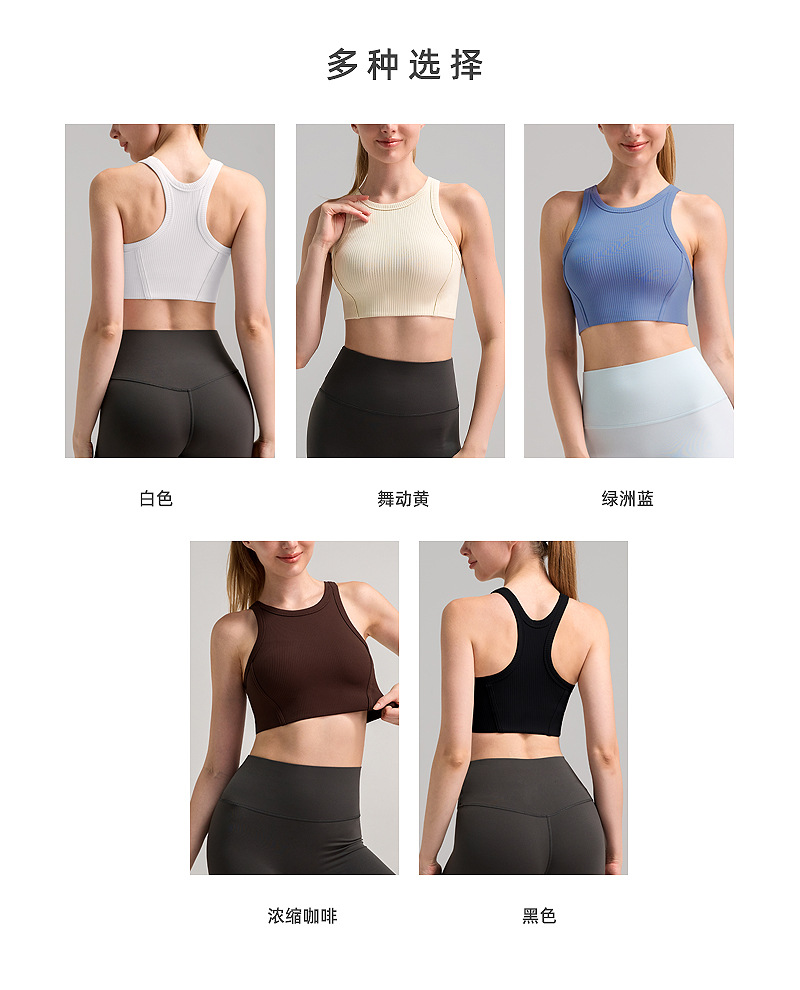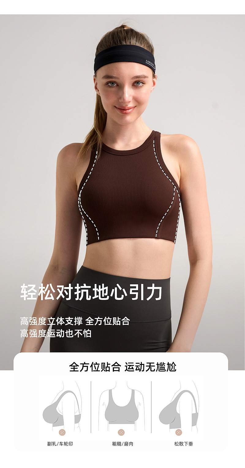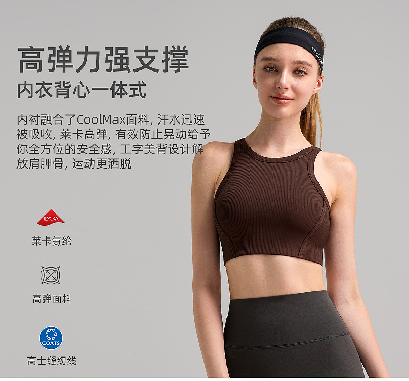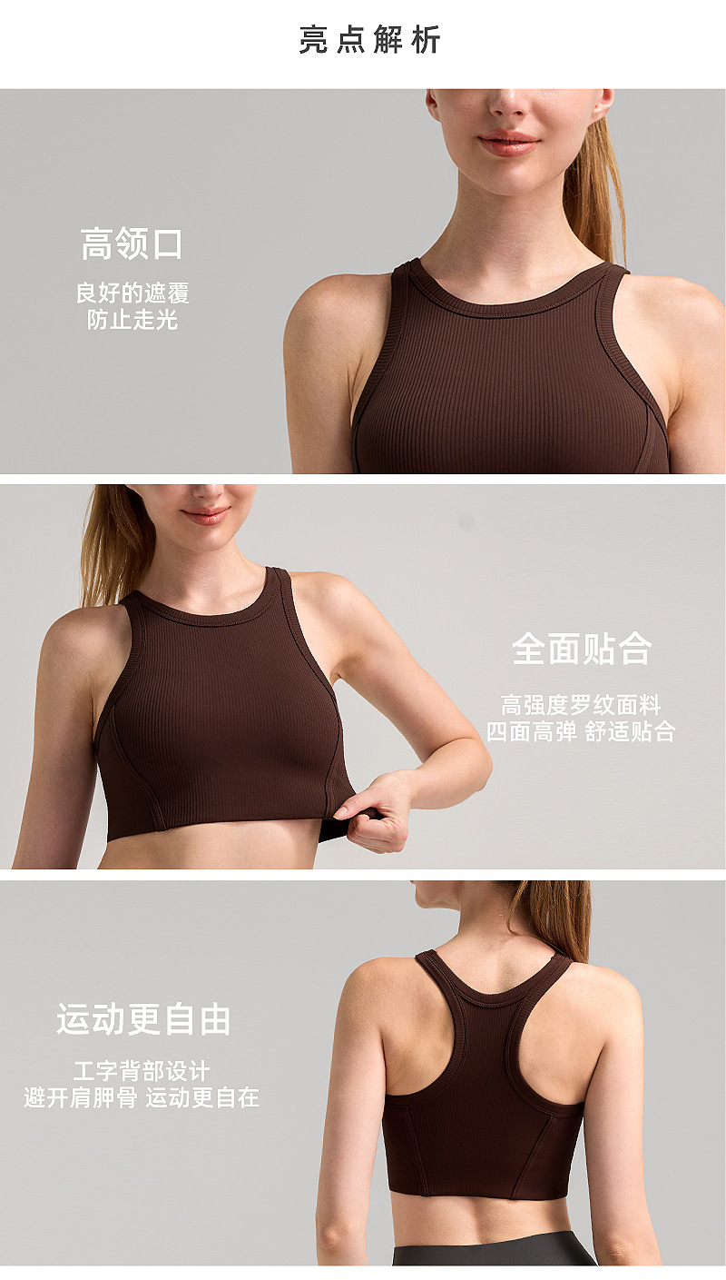 가슴 패드 높은 목 탄성 피부 친화적 인 스포츠 속옷 높은 강도 충격 방지 상부 브래지어를 가진 수직 리브 2.0스토어 가기