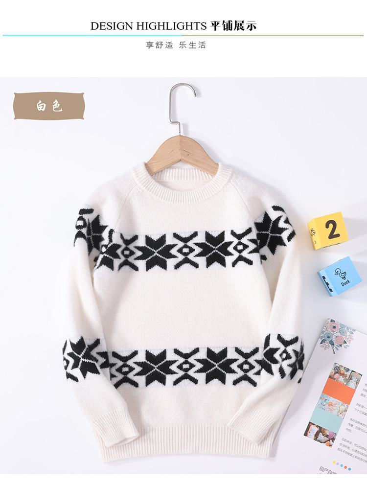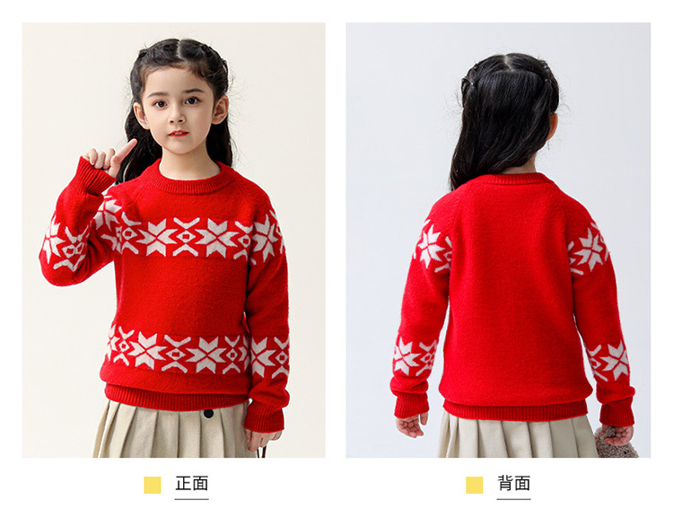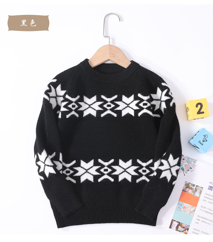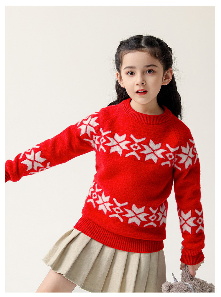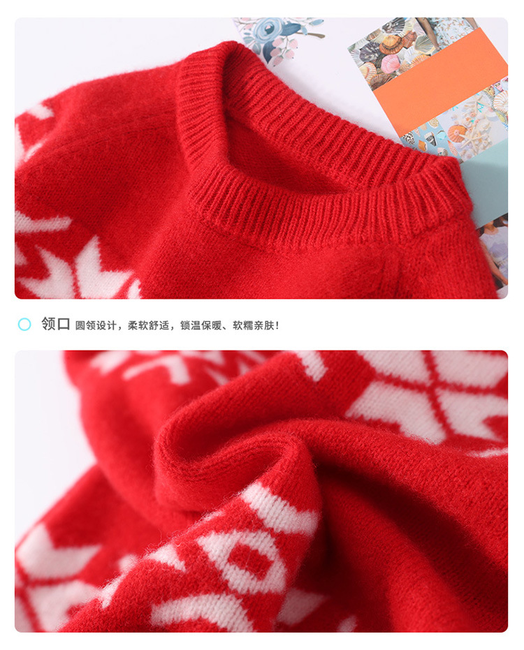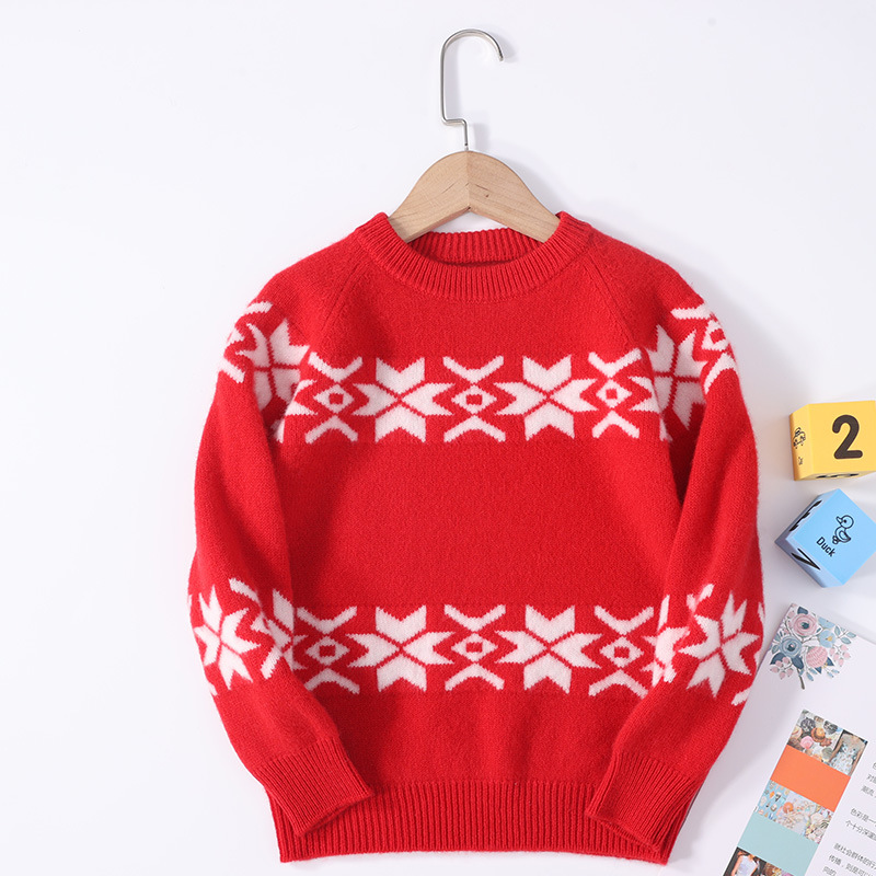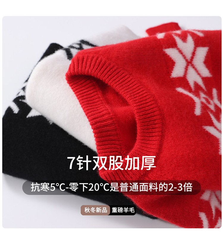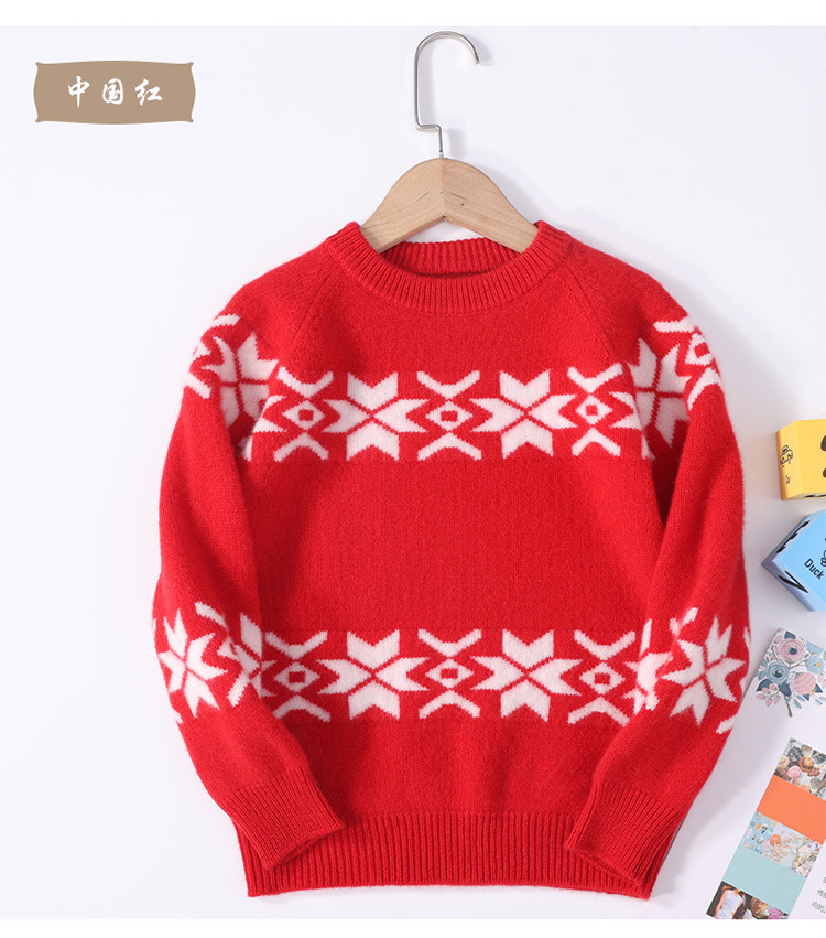 가을과 겨울 2024 새로운 순수한 양모 크리스마스 롤 순수한 양모 크루 넥 스웨터 눈송이 컬러 스플 라이징 스웨터 소년 소녀스토어 가기