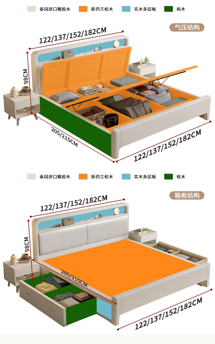 흰색 모든 단단한 나무 침대 현대 간단한 1.5 m 높은 상자 침대 1.2m/1.35m 다기능 침대 1.8 m 저장 침대