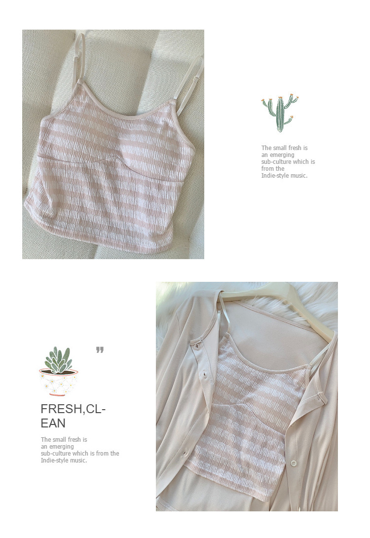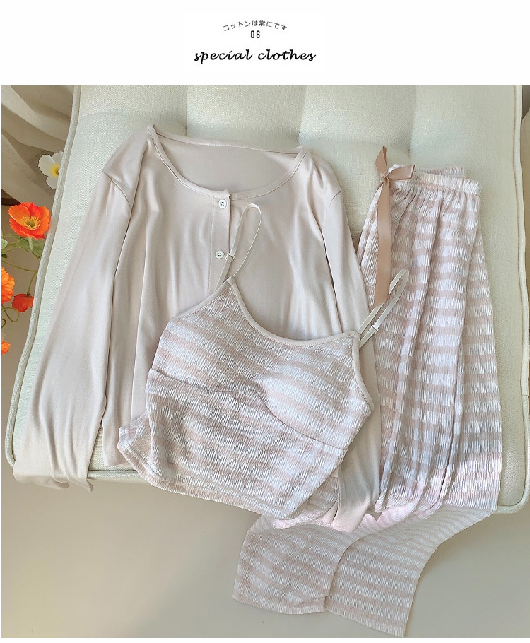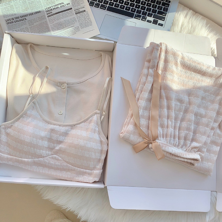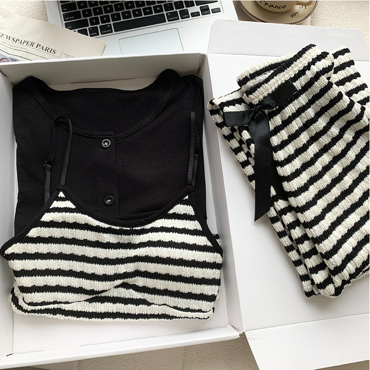 가슴 패드가 달린 프랑스 잠옷 여성의 봄과 가을 순수한 섹시한 줄무늬 인터넷 핫 스타일 3 피스 아우터 세트 입고스토어 가기