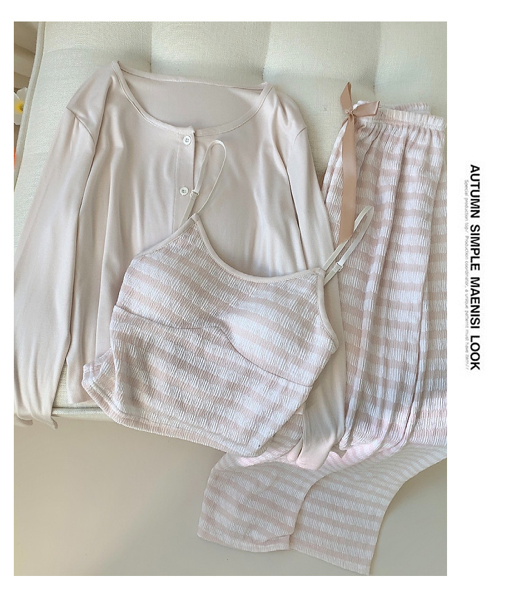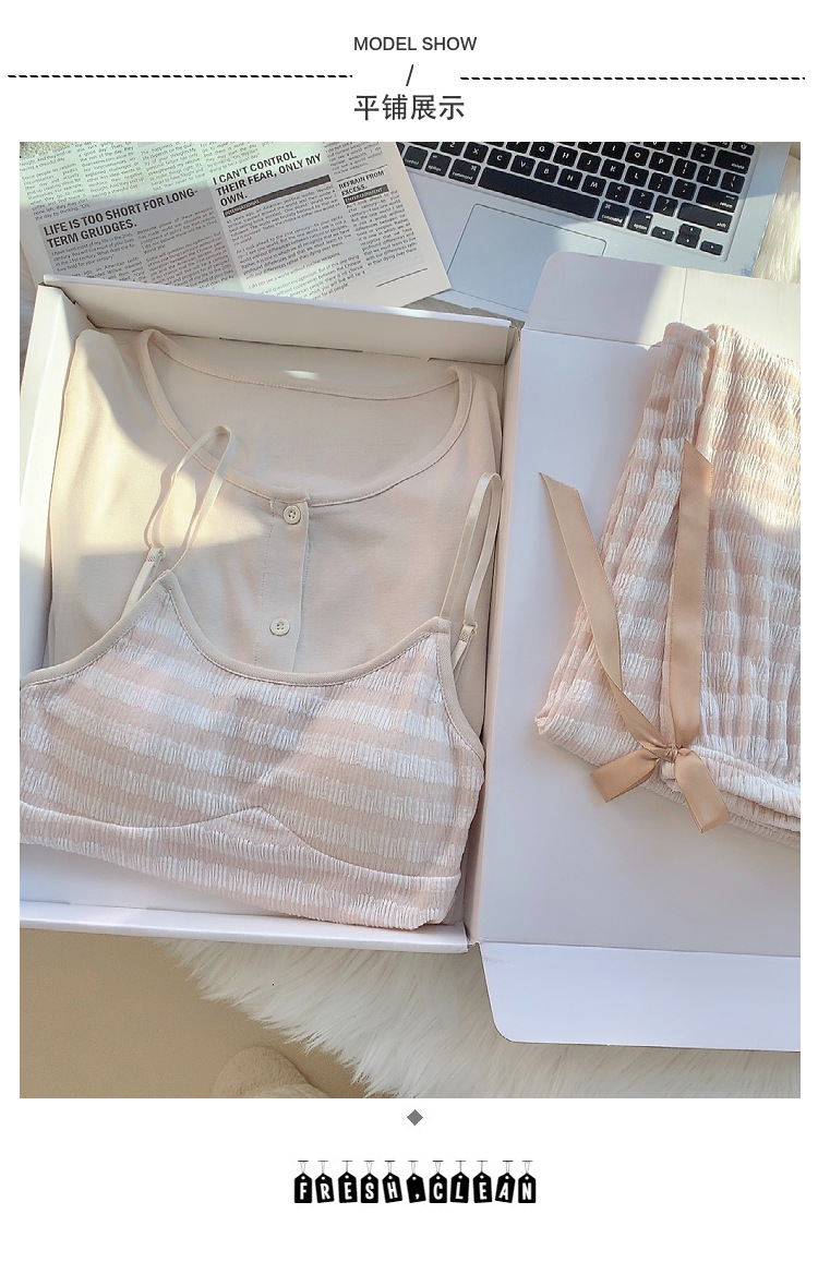 가슴 패드가 달린 프랑스 잠옷 여성의 봄과 가을 순수한 섹시한 줄무늬 인터넷 핫 스타일 3 피스 아우터 세트 입고