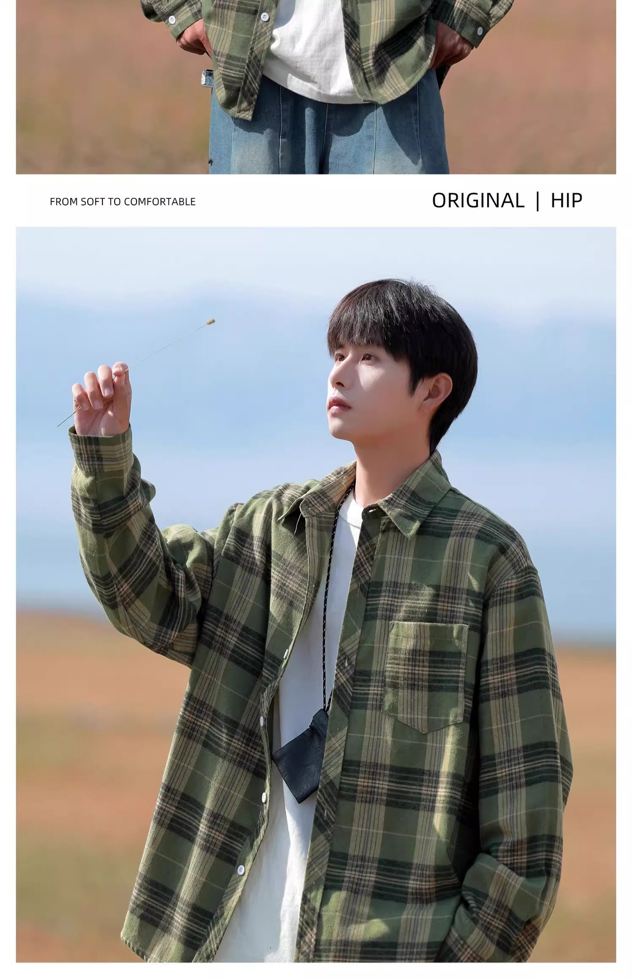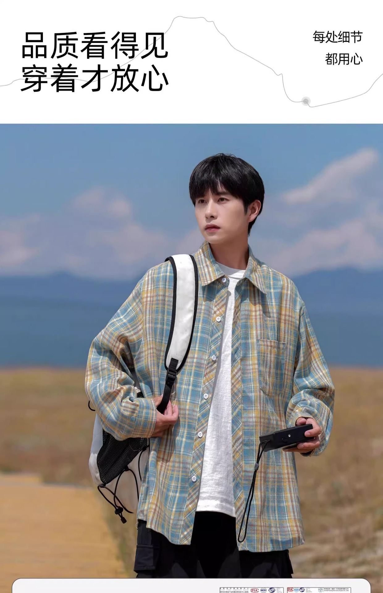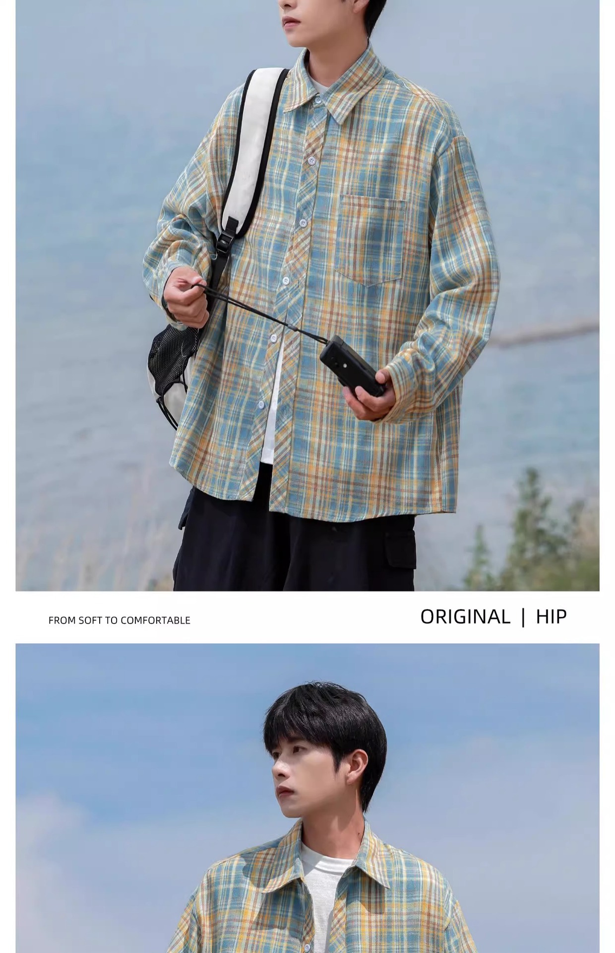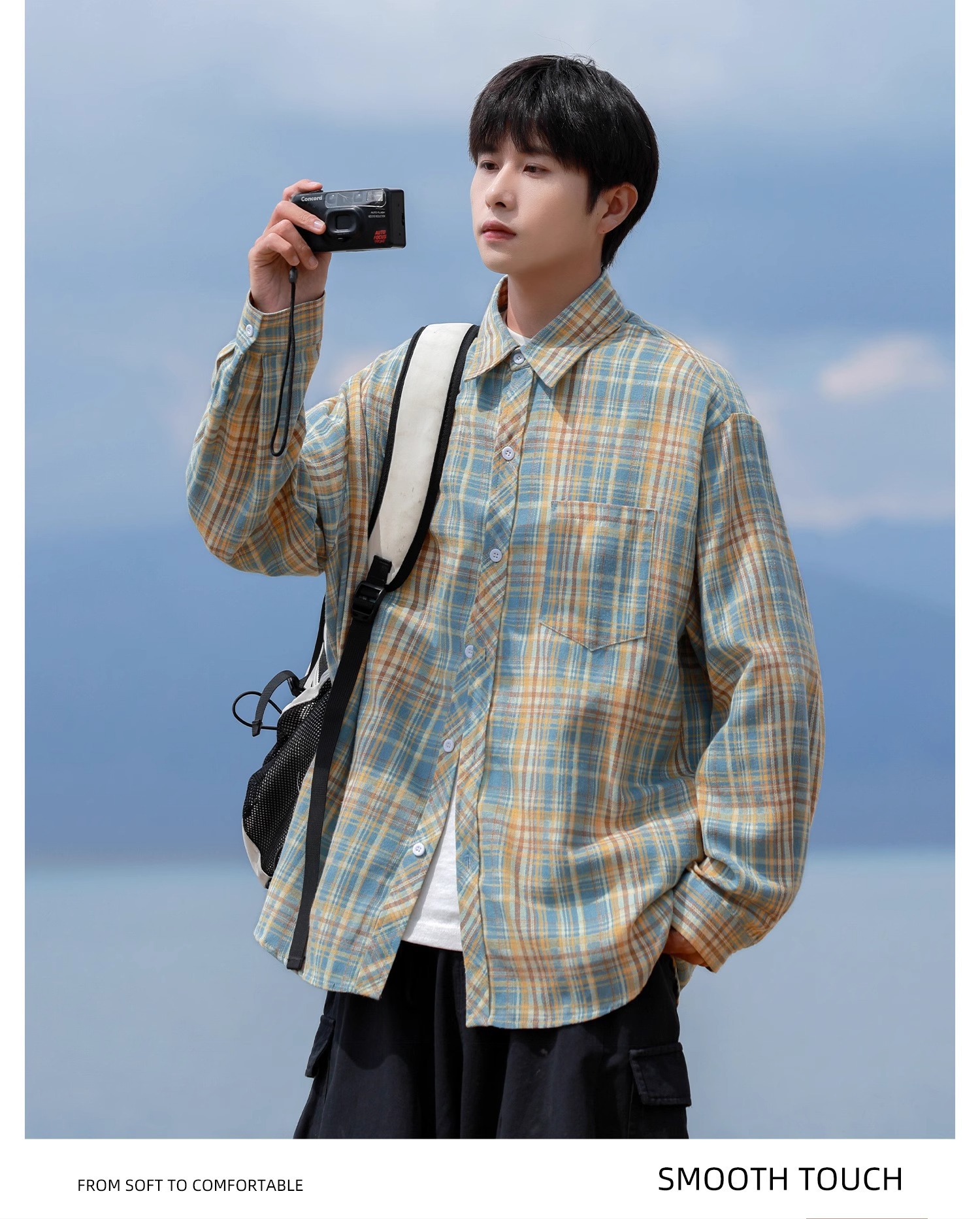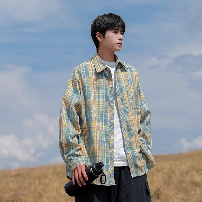 NASA 노란색 격자 무늬 셔츠 남성용 긴팔 2025 봄, 가을 새로운 느슨한 캐주얼 벨벳 셔츠 재킷 남성용스토어 가기