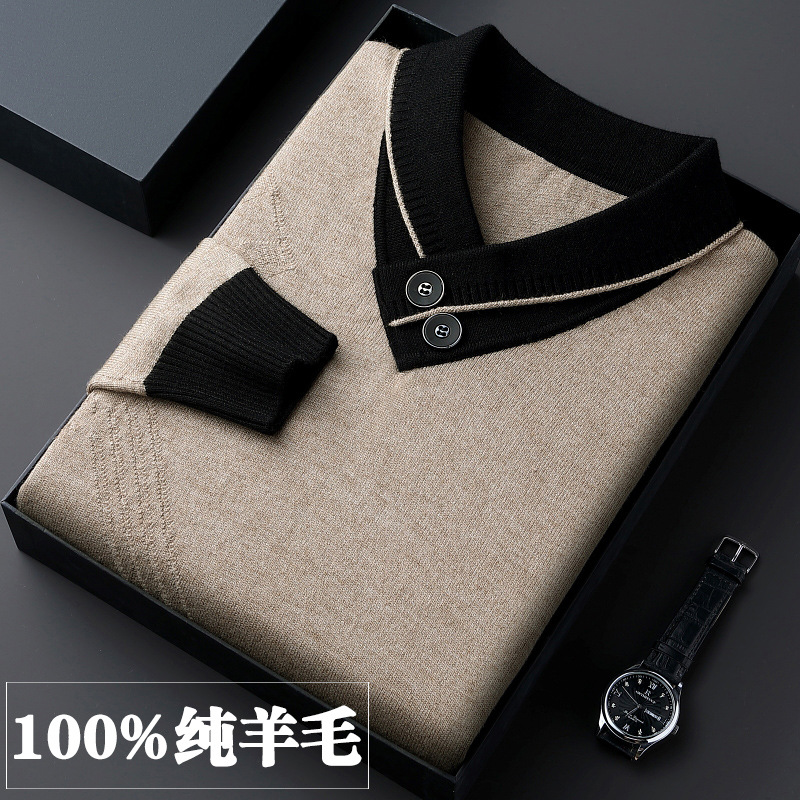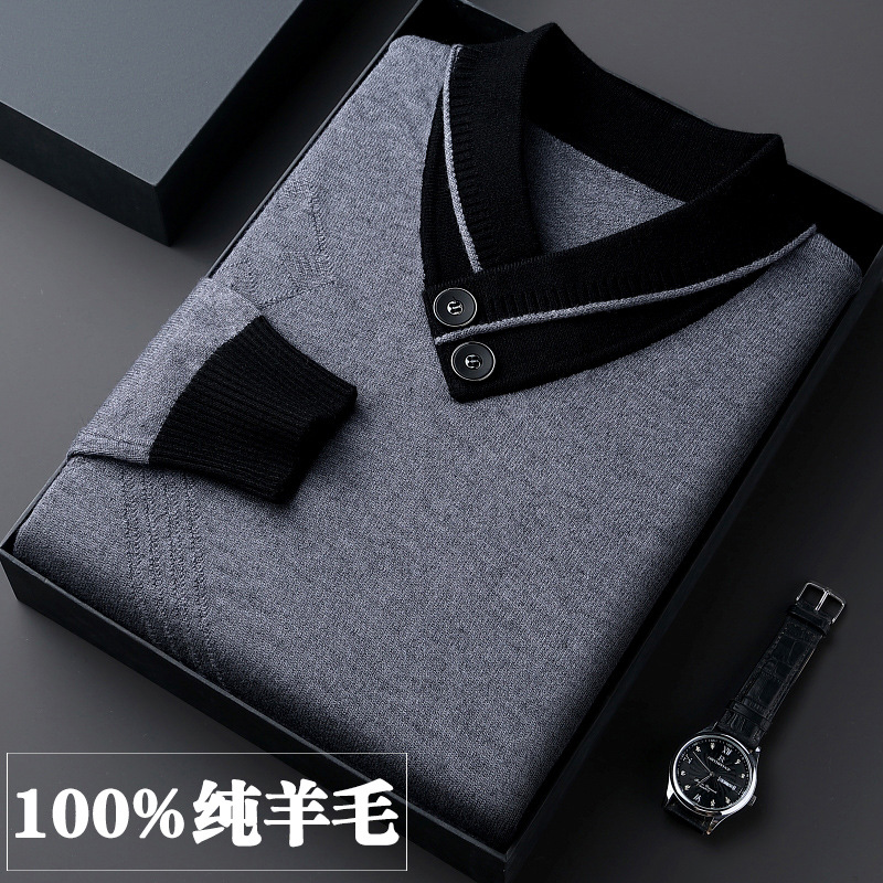 100% 순수 울 스웨터 남성용 두꺼운 V넥 스웨터 겨울 신상품 중년 남성용 베이스 레이어 풀오버 따뜻한 캐시미어 스웨터