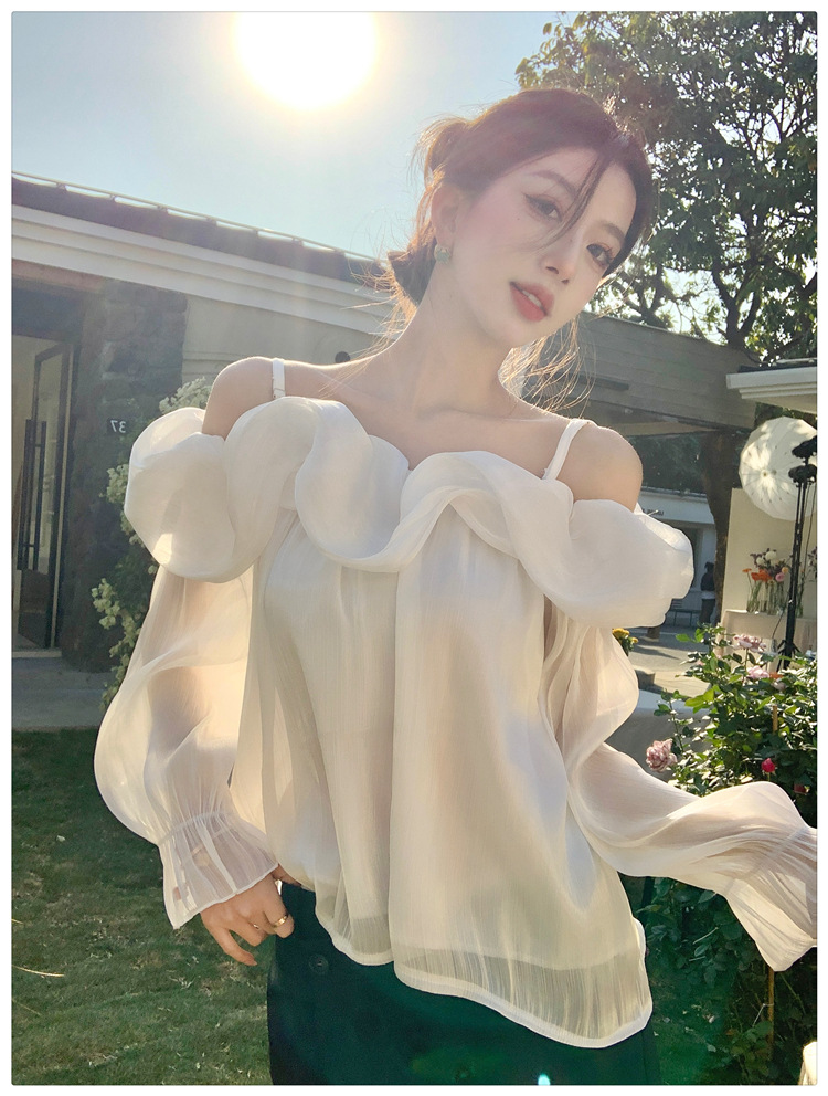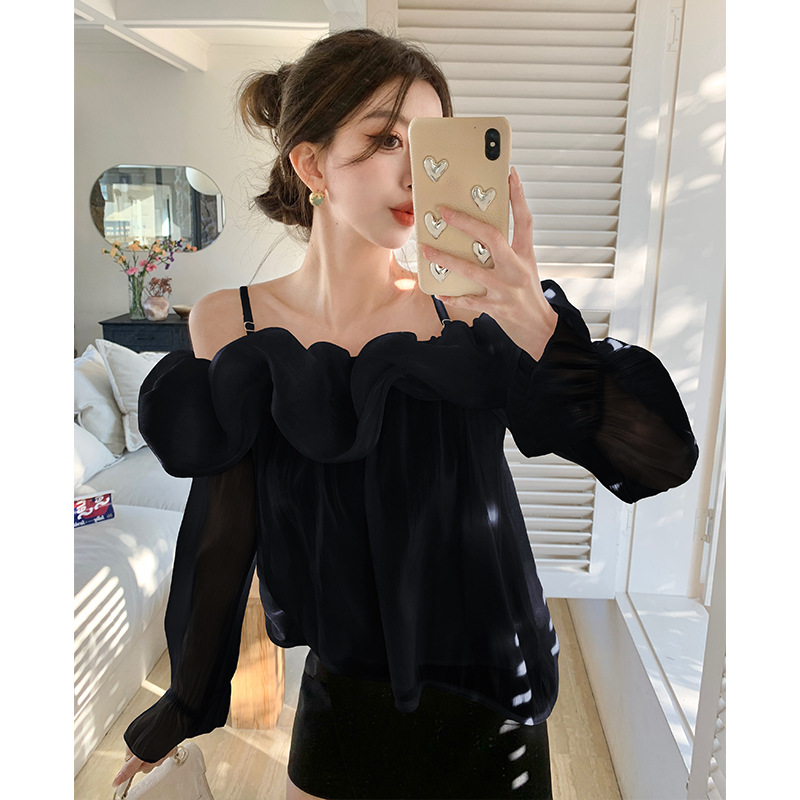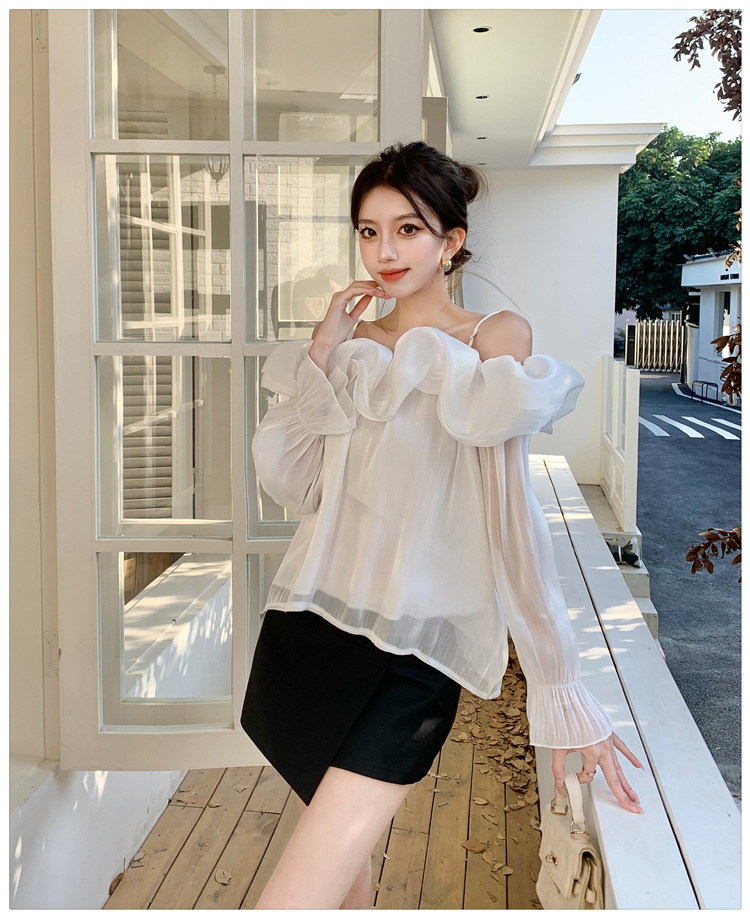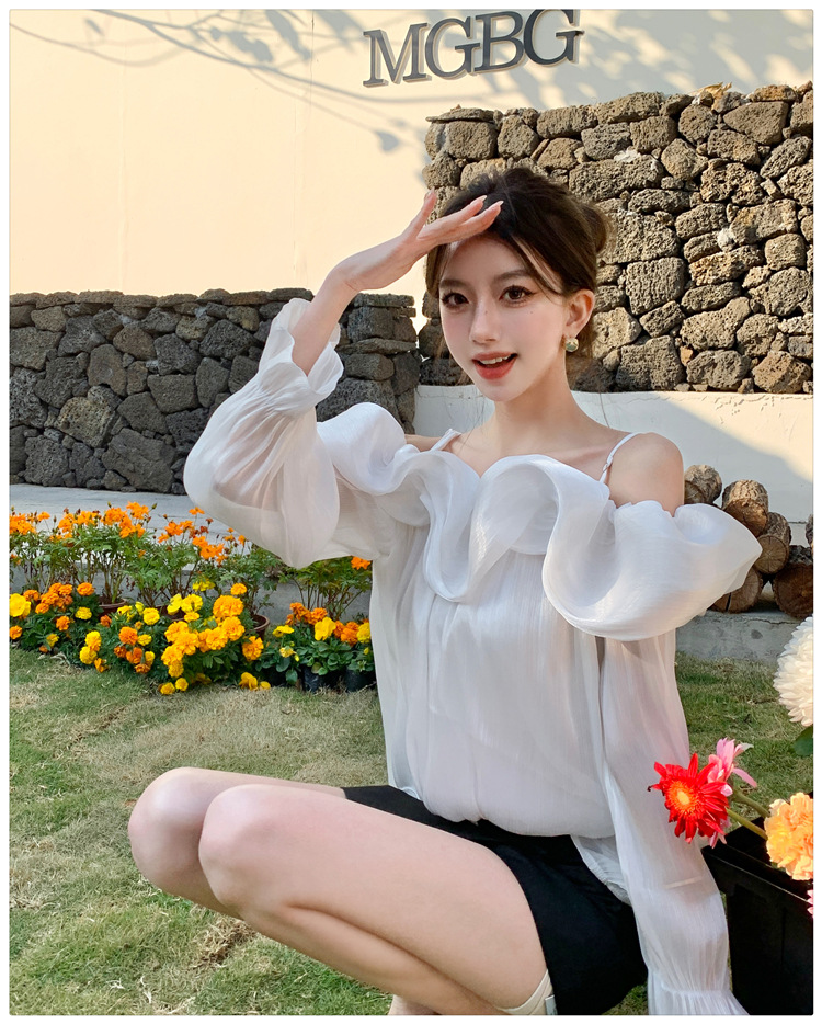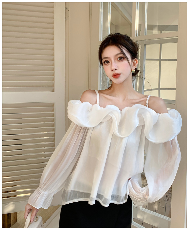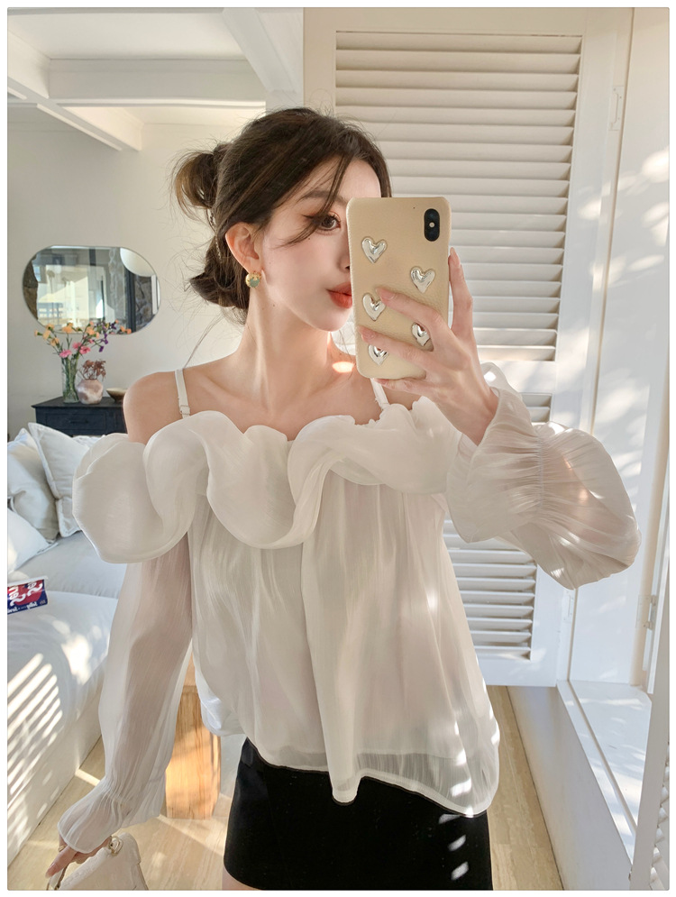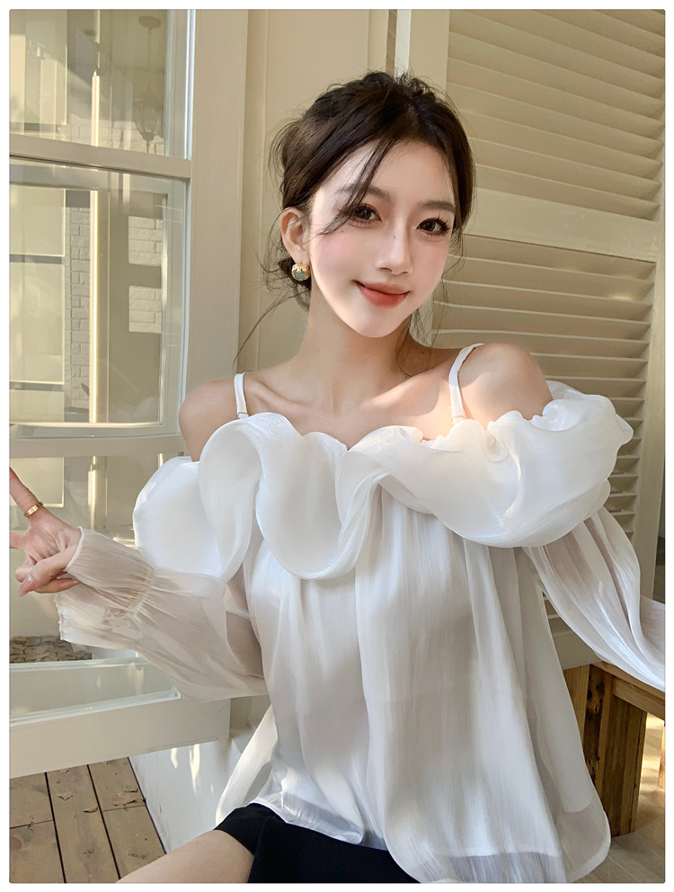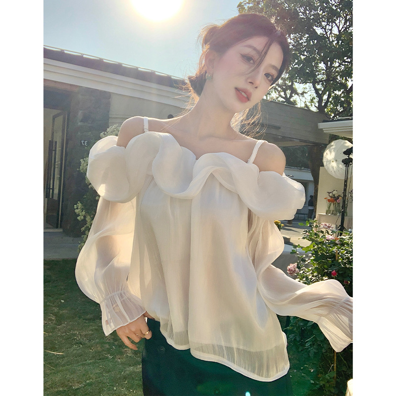달콤한 우아한 러플 쉬폰 셔츠 2025 봄 새로운 아름다운 쇄골 어깨 슈퍼 페어리 러플 여성