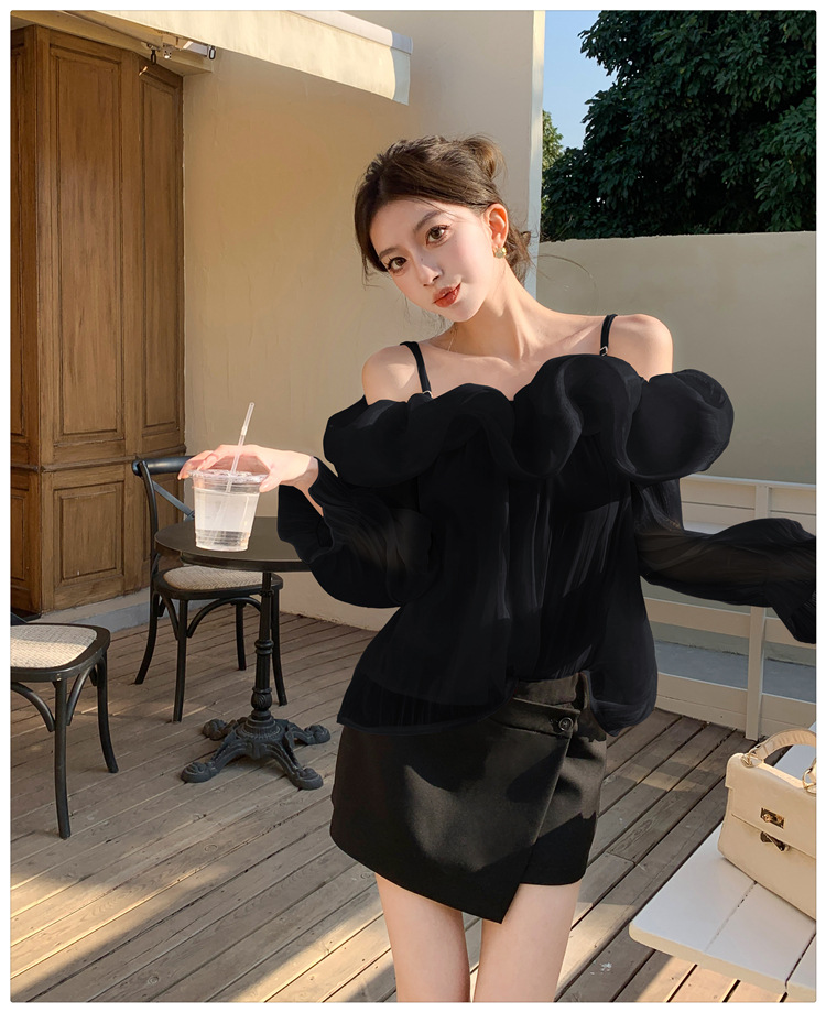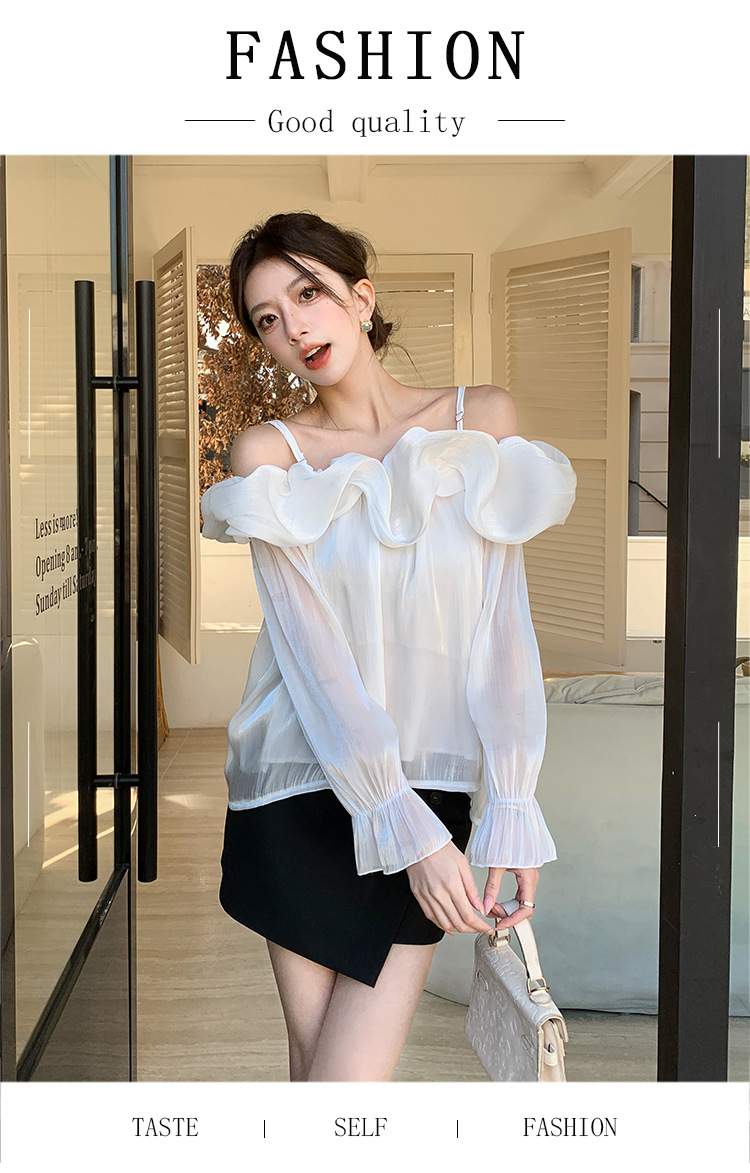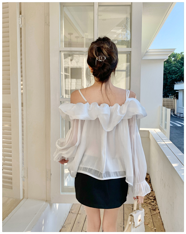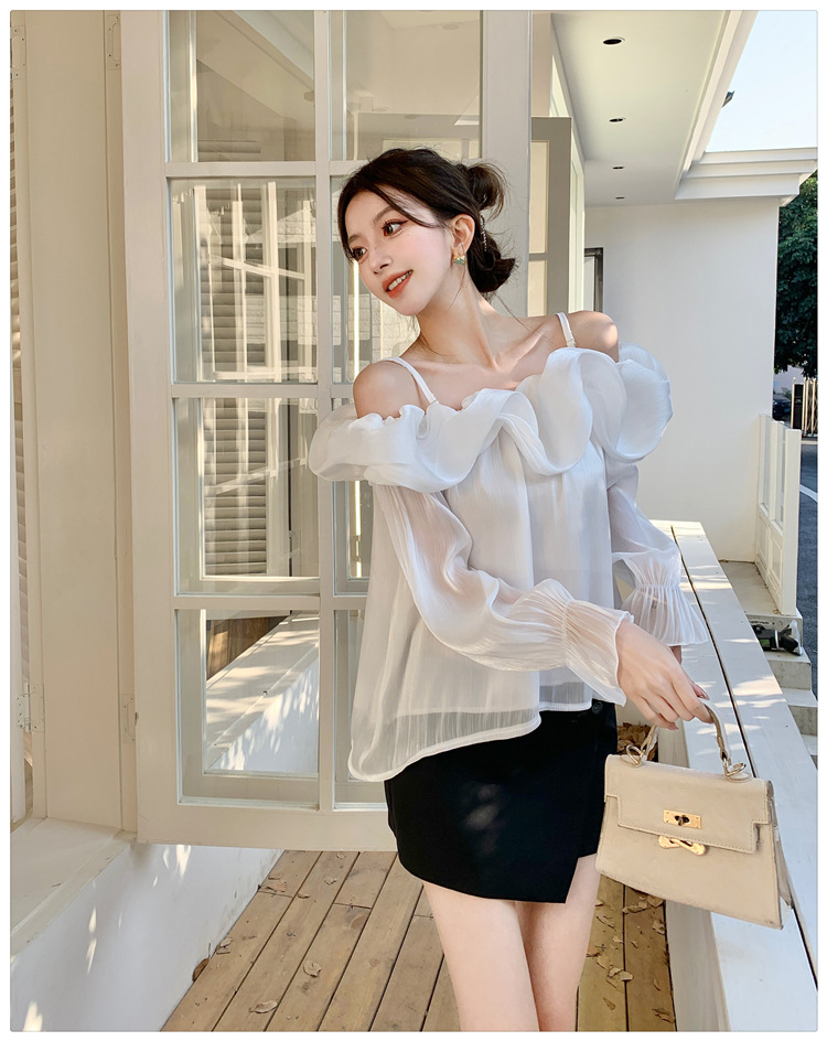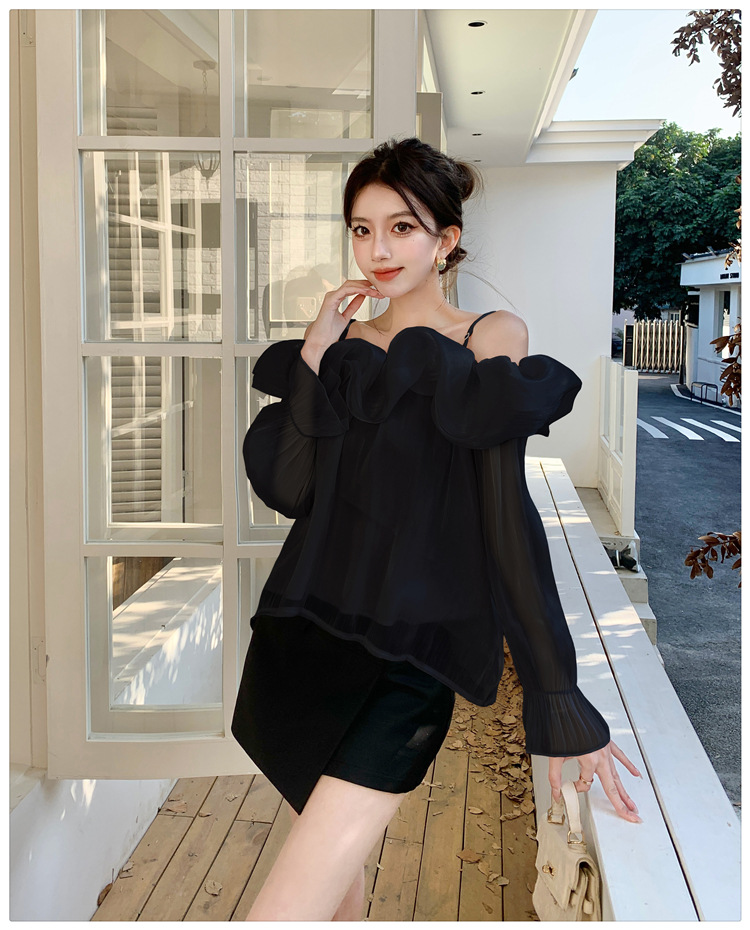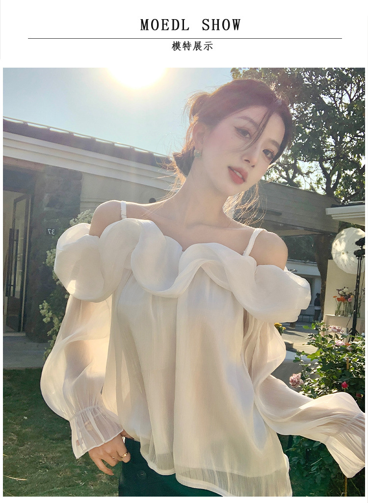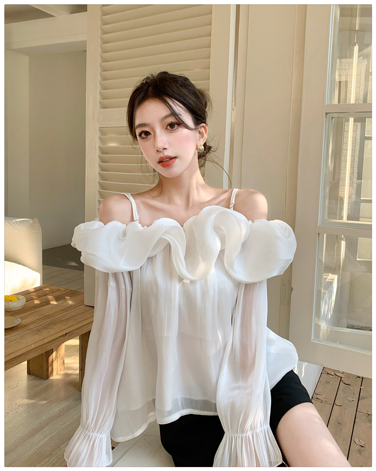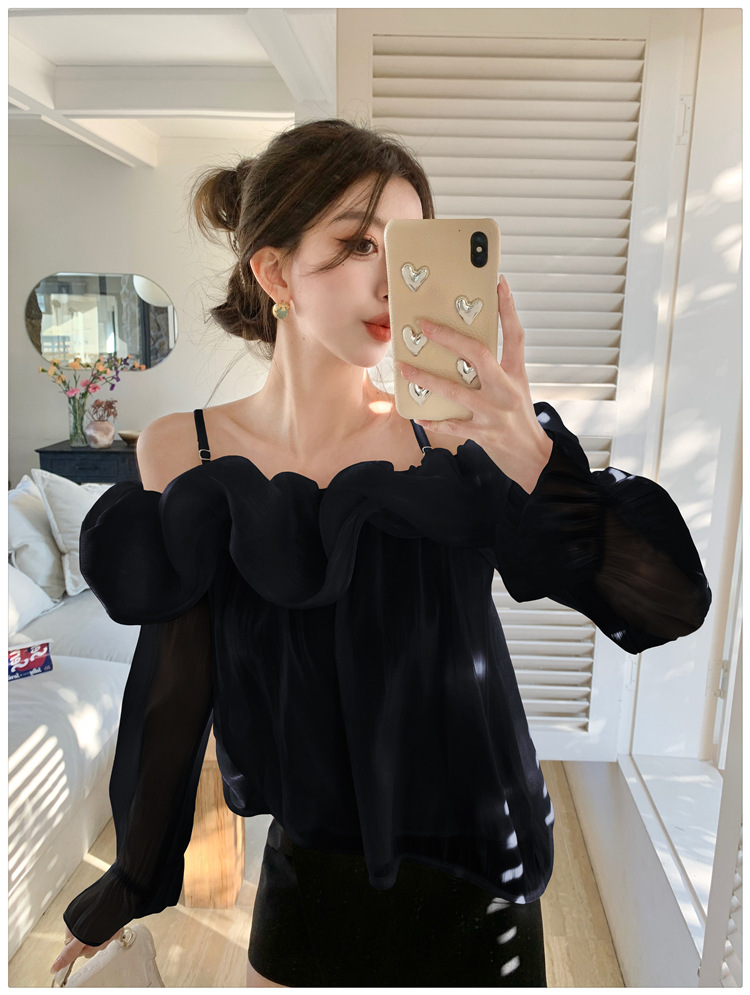 달콤한 우아한 러플 쉬폰 셔츠 2025 봄 새로운 아름다운 쇄골 어깨 슈퍼 페어리 러플 여성