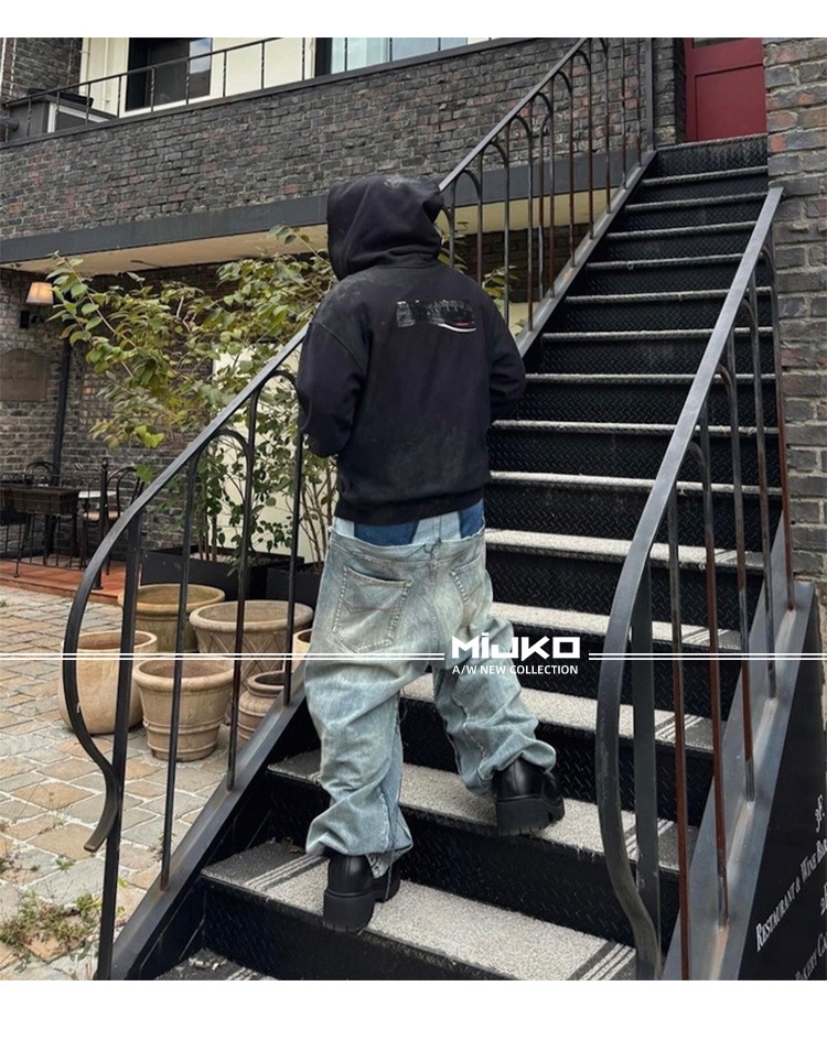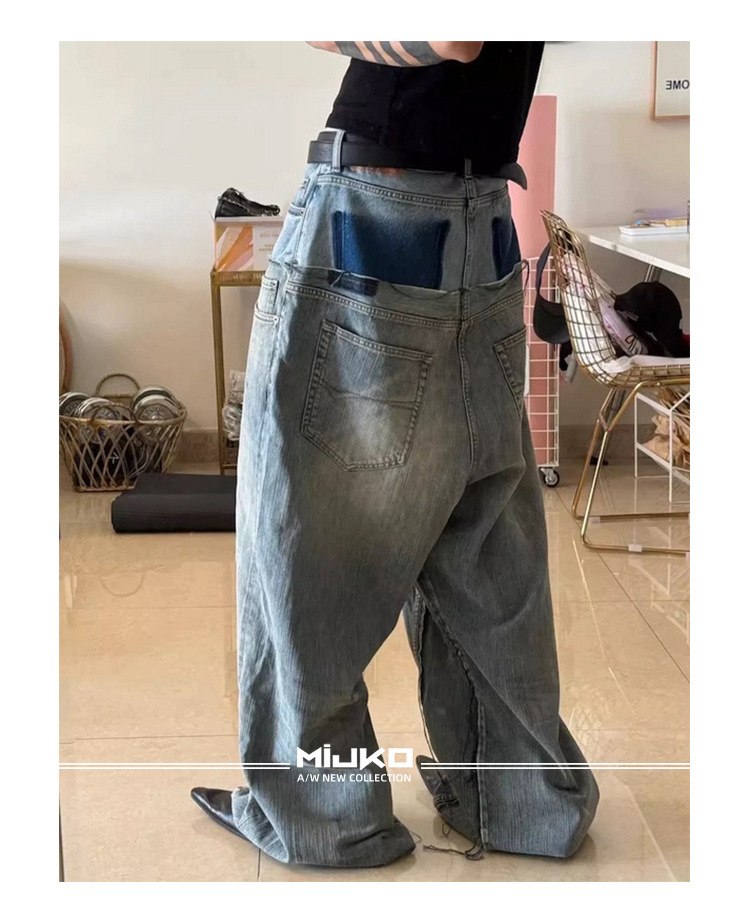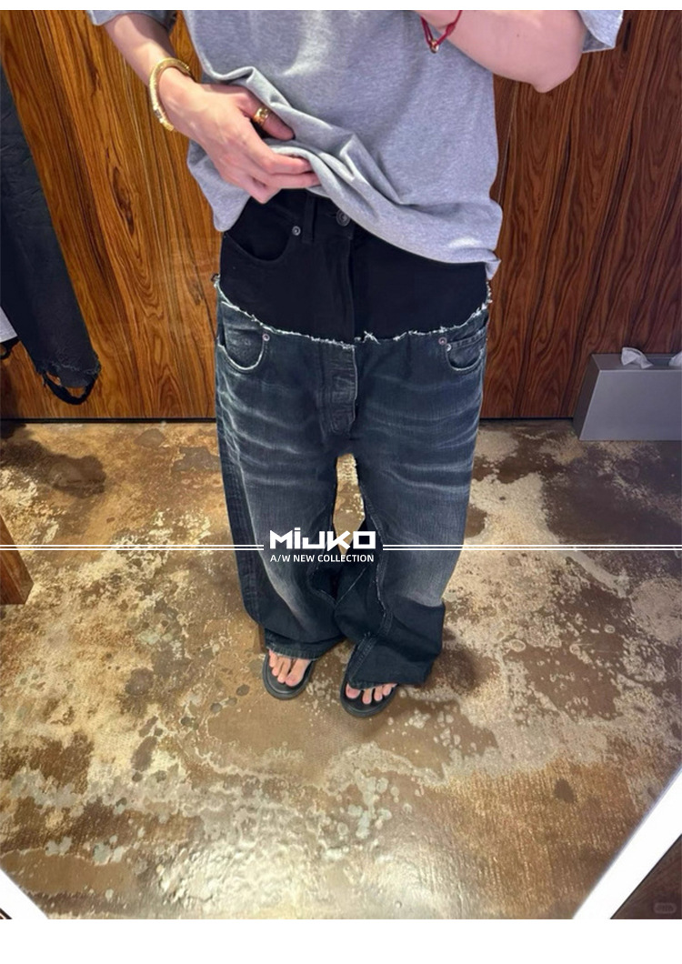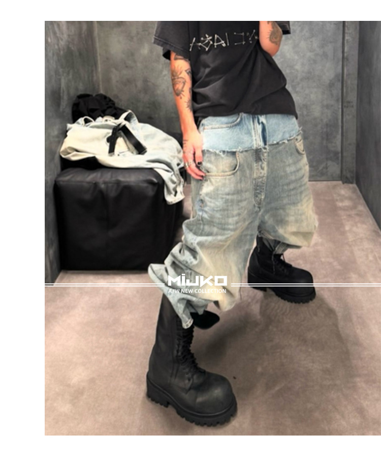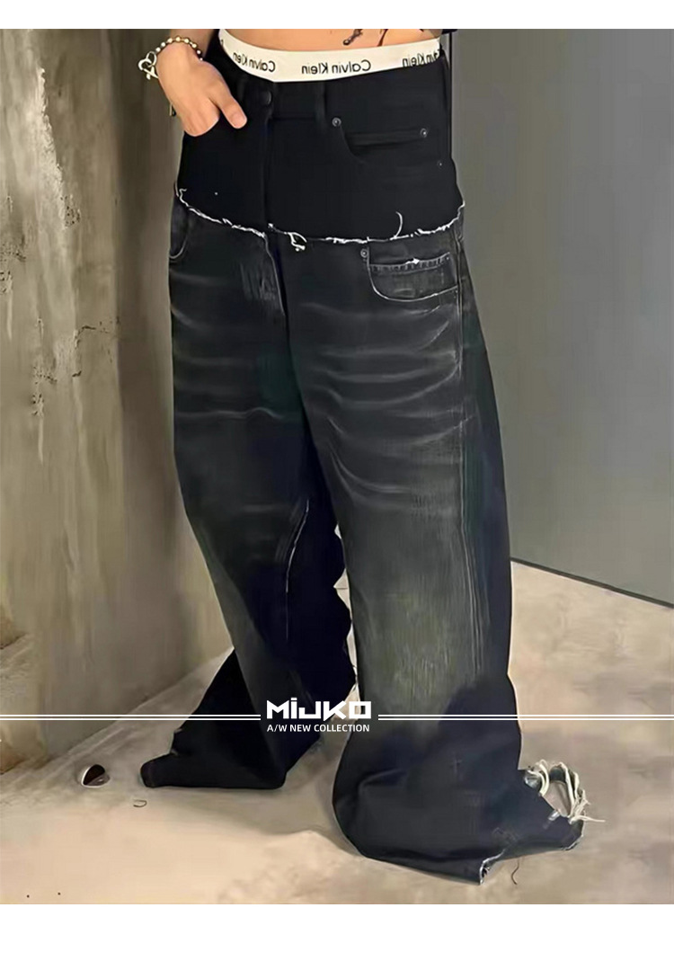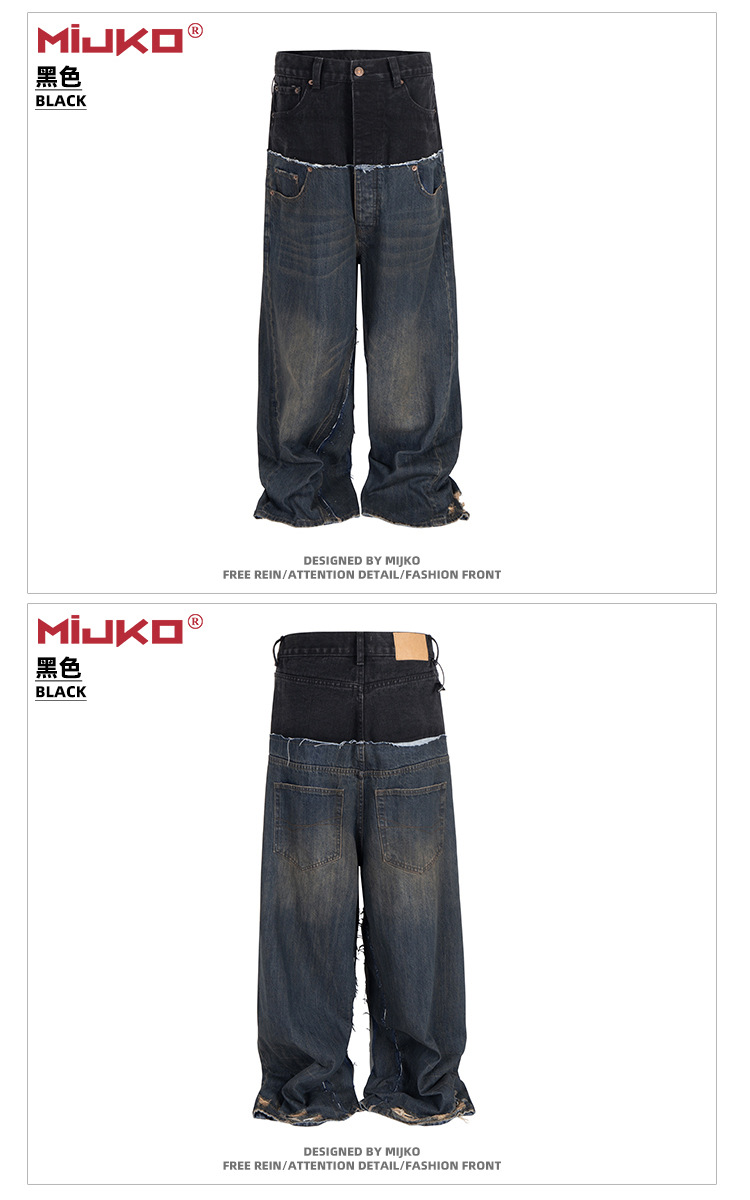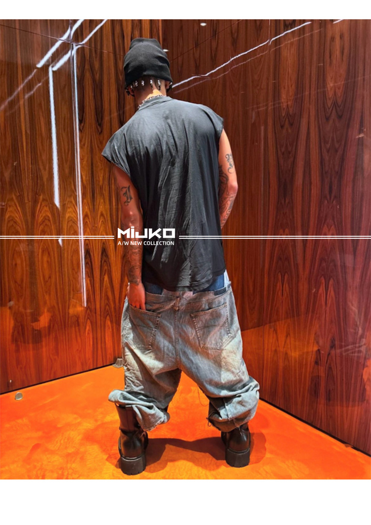 MIJKO 남자 여자 고양이는 바지를 파괴해야합니다. 남자와 여자의 컷 업 더블 허리 스티칭 헐렁한 청바지스토어 가기