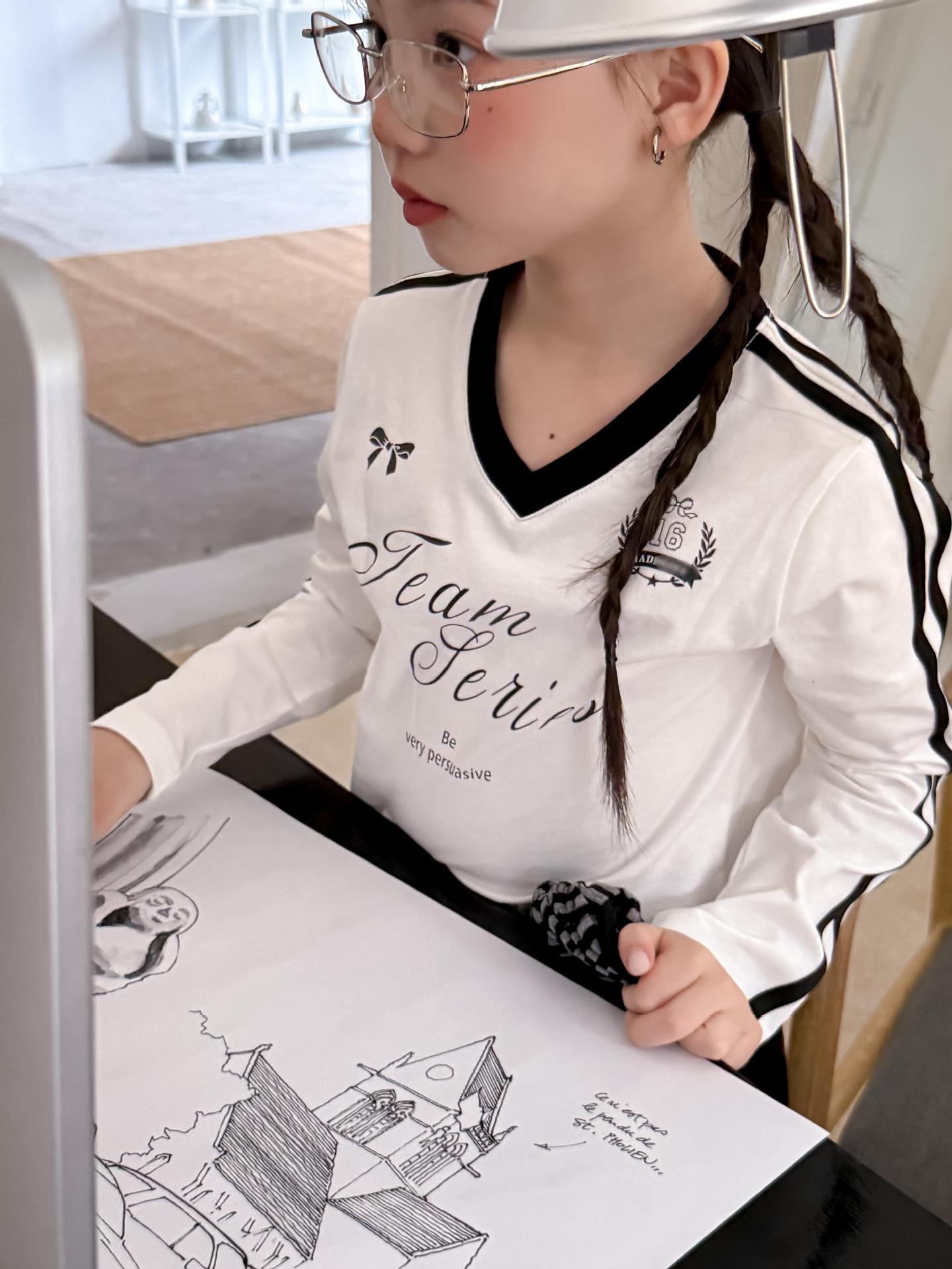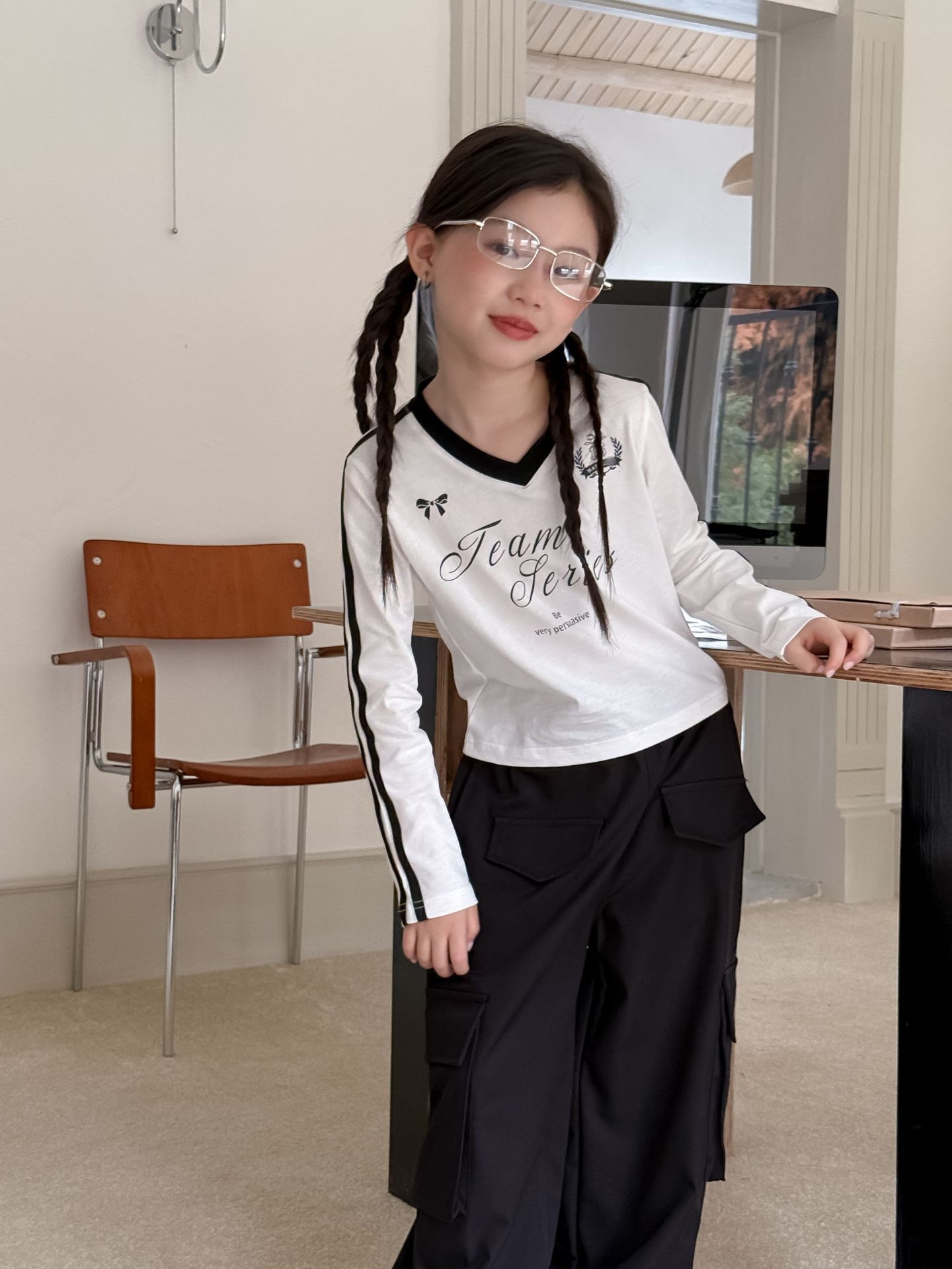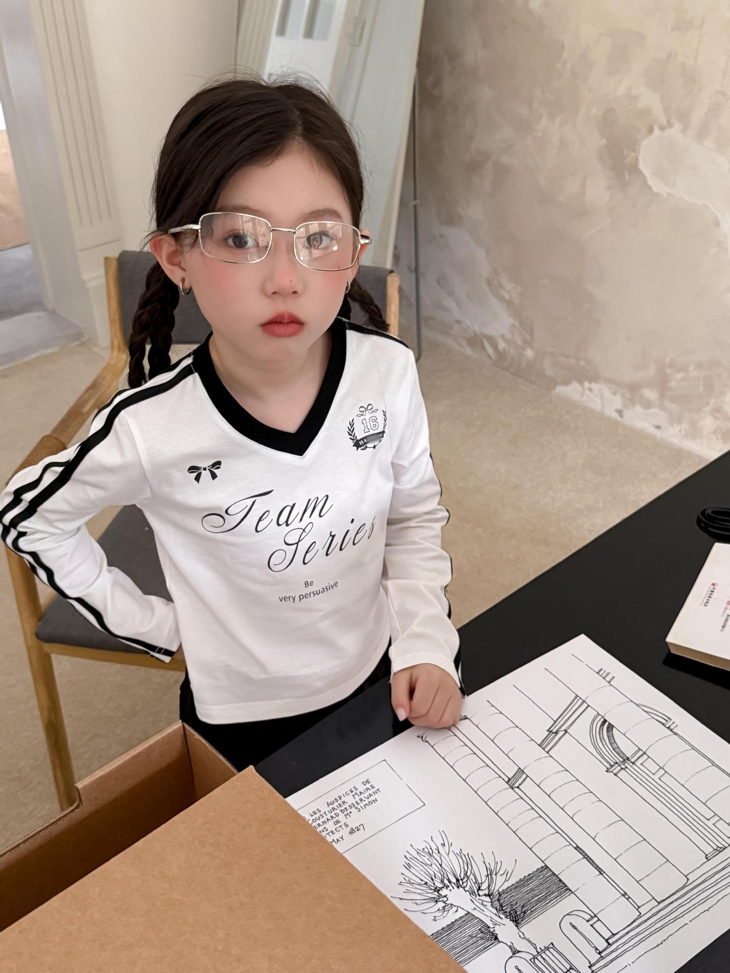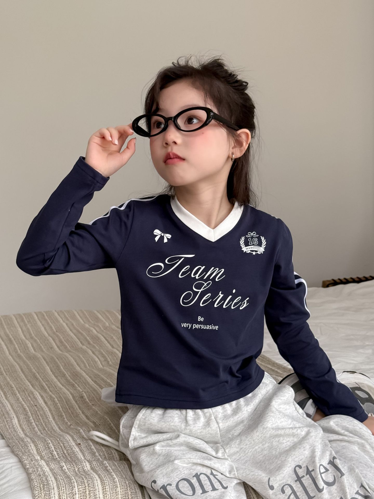 어린이 티셔츠 2025 봄 소녀 긴팔 V 넥 슬림 핏 내면베이스 셔츠 중 어린이 보물 인쇄 티셔츠 탑스토어 가기