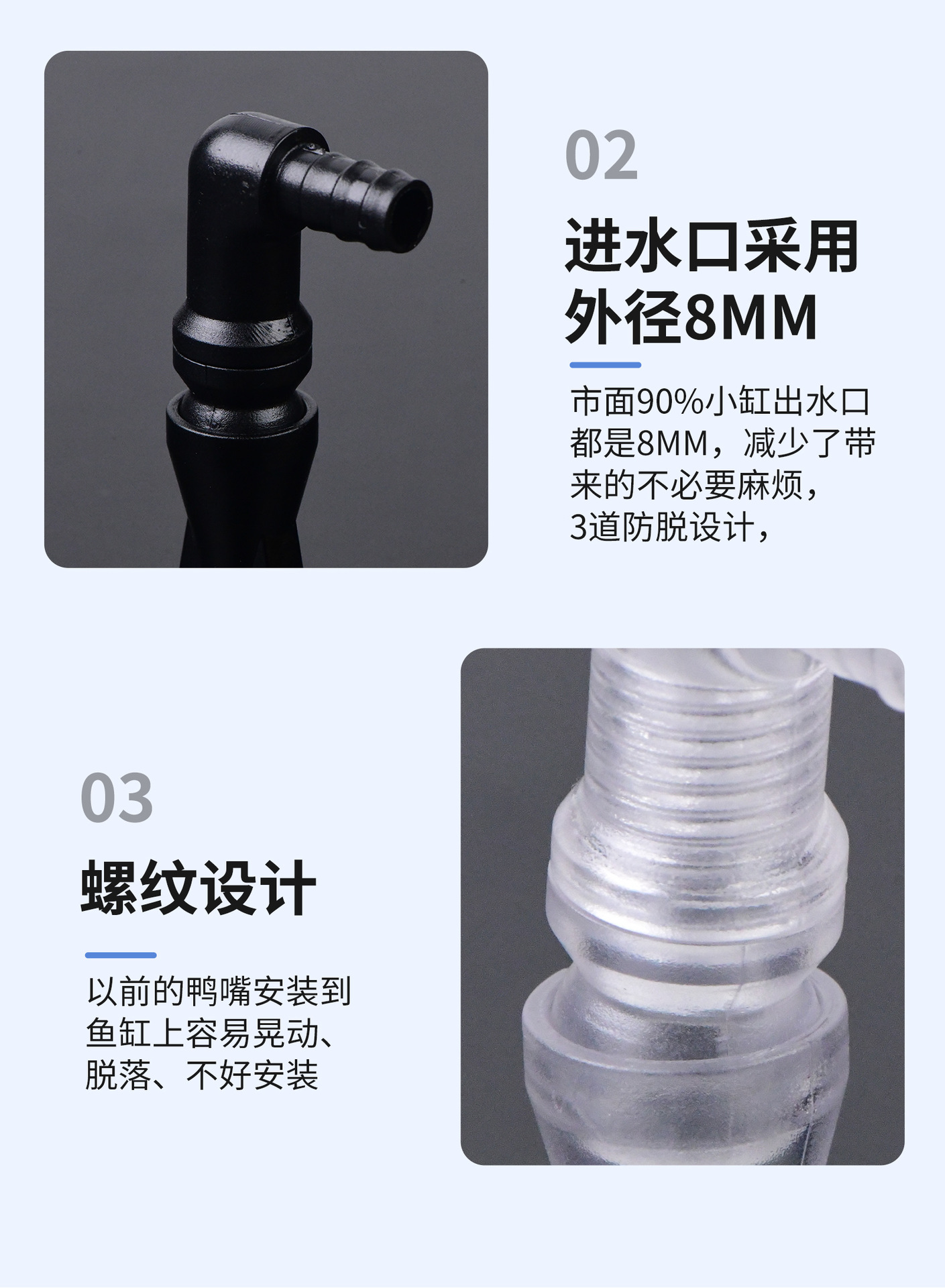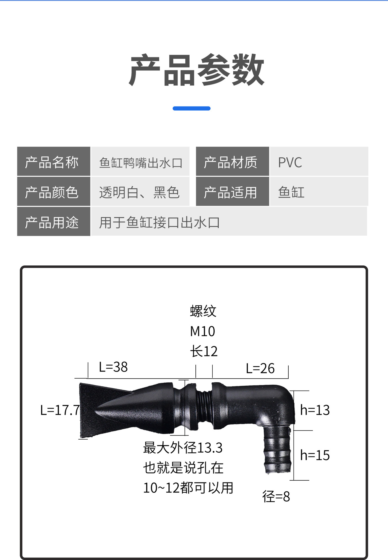 백필터 어항용 오리주둥이형 입출수구, 앞뒤에 구멍이 있는 외부 나사산, 10mm 구멍에 맞는 8mm 호스 연결 가능