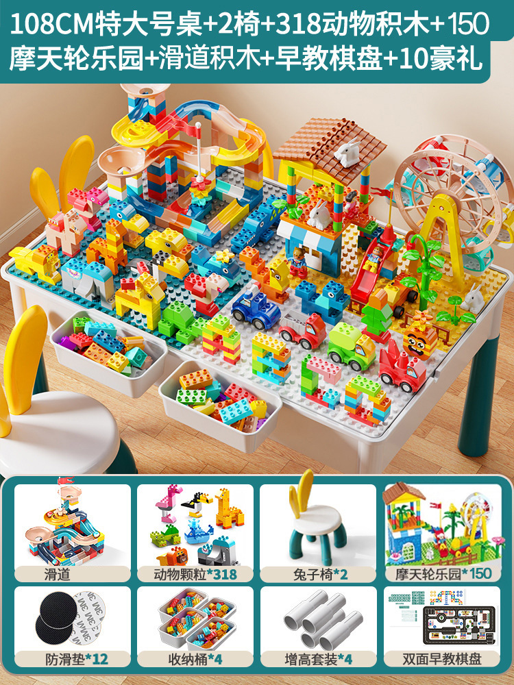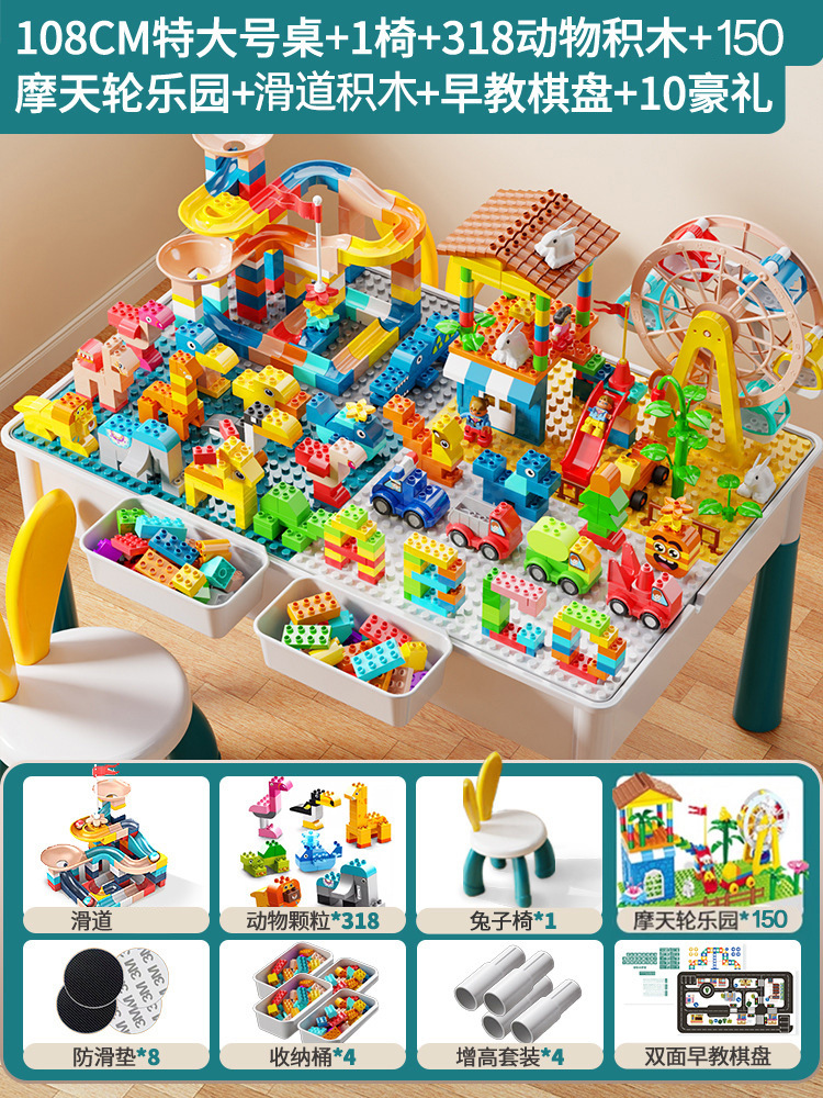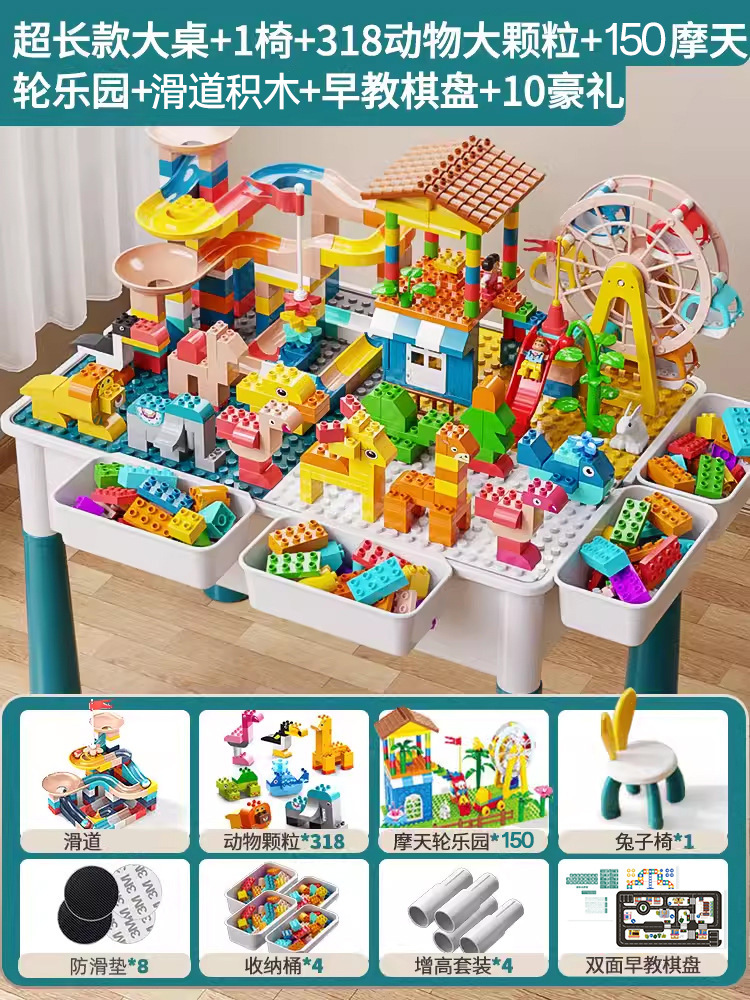 • 【108cm 특대형 테이블】 의자 1개 + 318피스 동물 블록 + 150피스 놀이공원 세트 + 미끄럼틀 + 재미있는 체스판 + 10가지 특별 선물