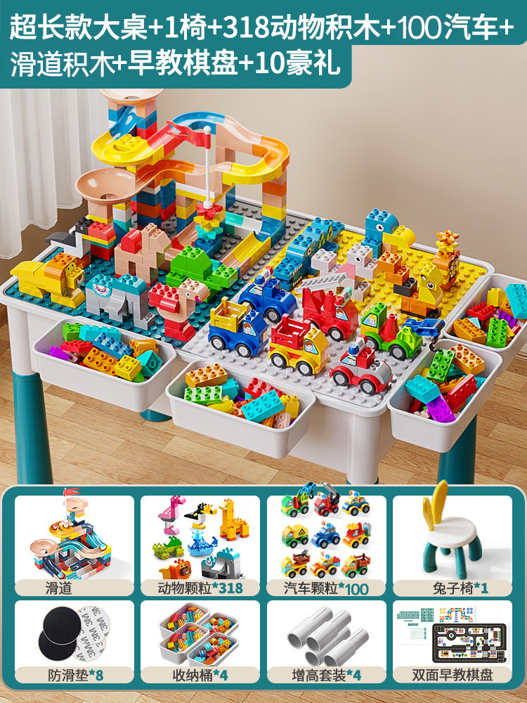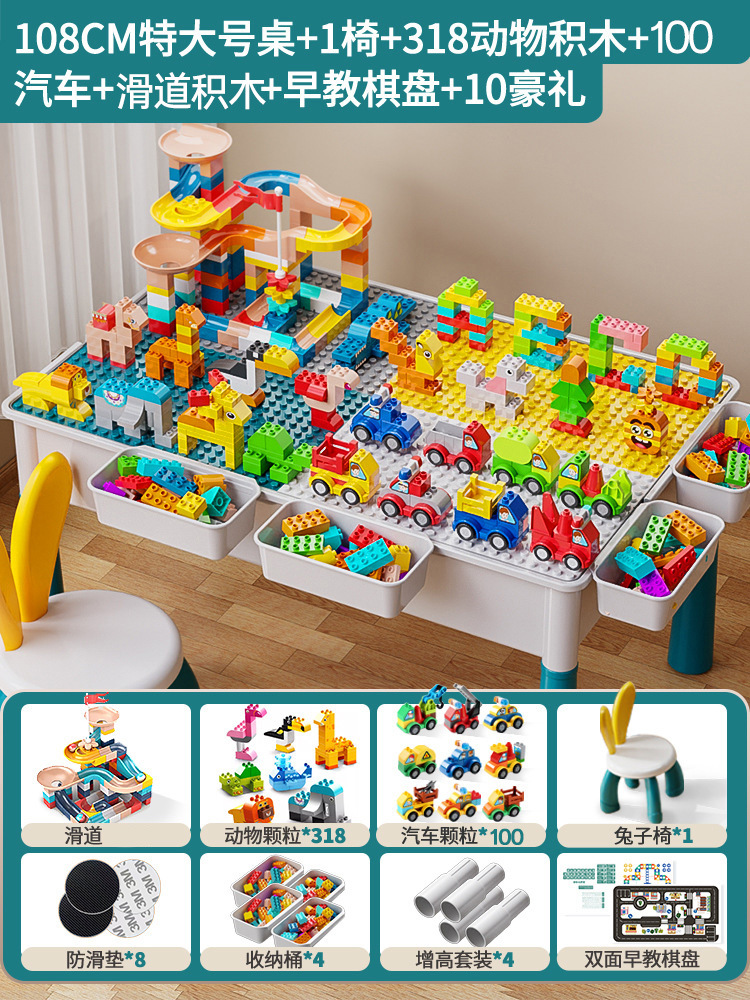 • 【108cm 초대형 테이블】 의자 1개 + 318피스 동물 블록 + 자동차 10대 + 슬라이드 + 재미있는 체스판 + 10가지 특별 선물