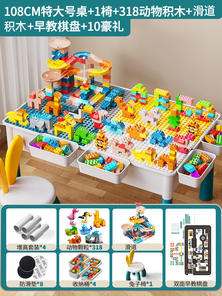 • 【108cm 초대형 테이블】 의자 1개 + 318피스 동물 블록 + 미끄럼틀 + 재미있는 체스판 + 10가지 특별 선물