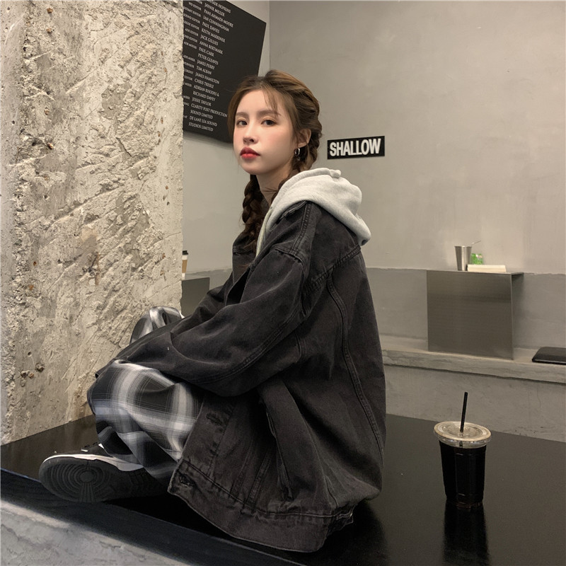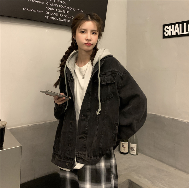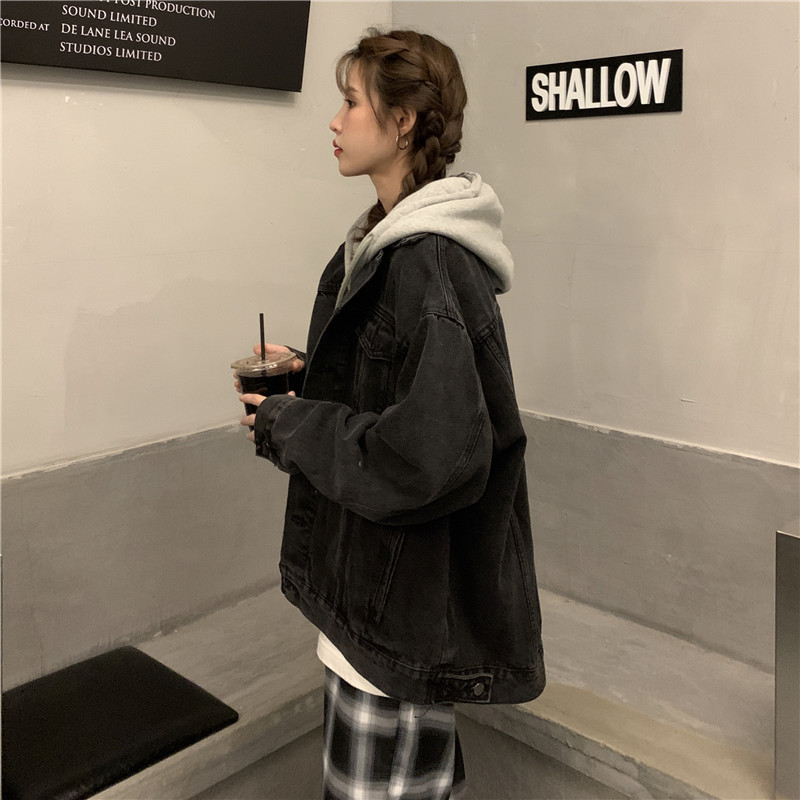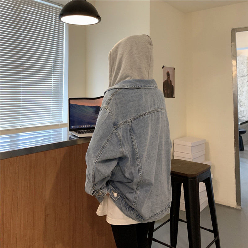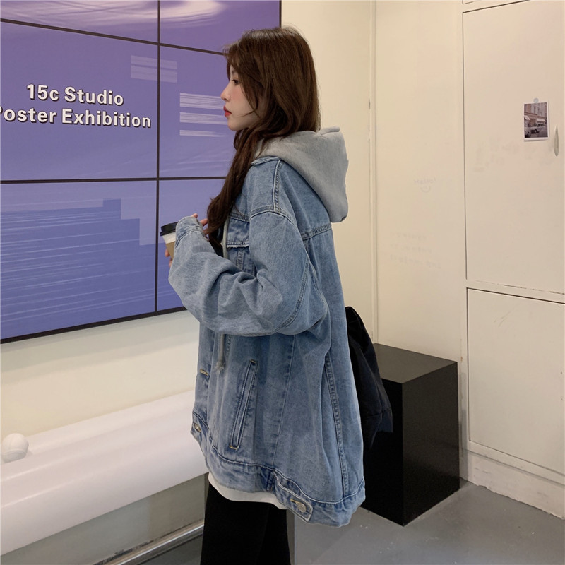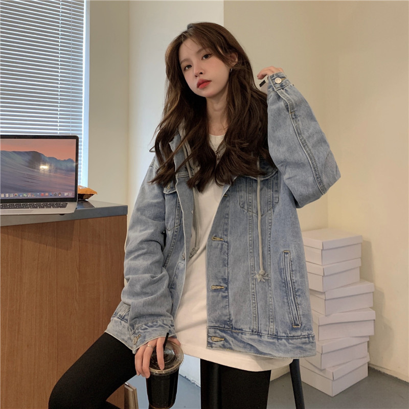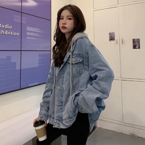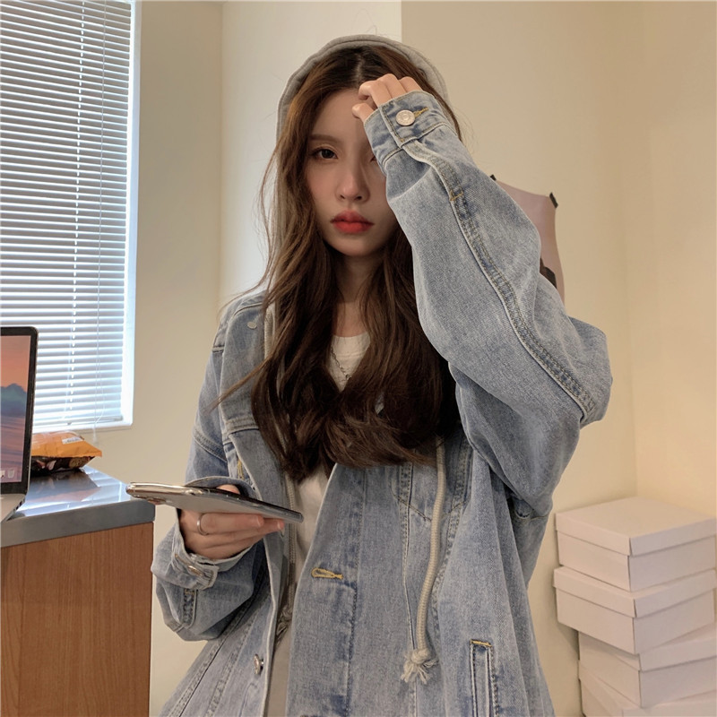 리얼 샷 후드 데님 재킷 여성 봄과 가을 2024 뉴 라이트 컬러 한국 루즈 캐주얼 자켓 탑스토어 가기