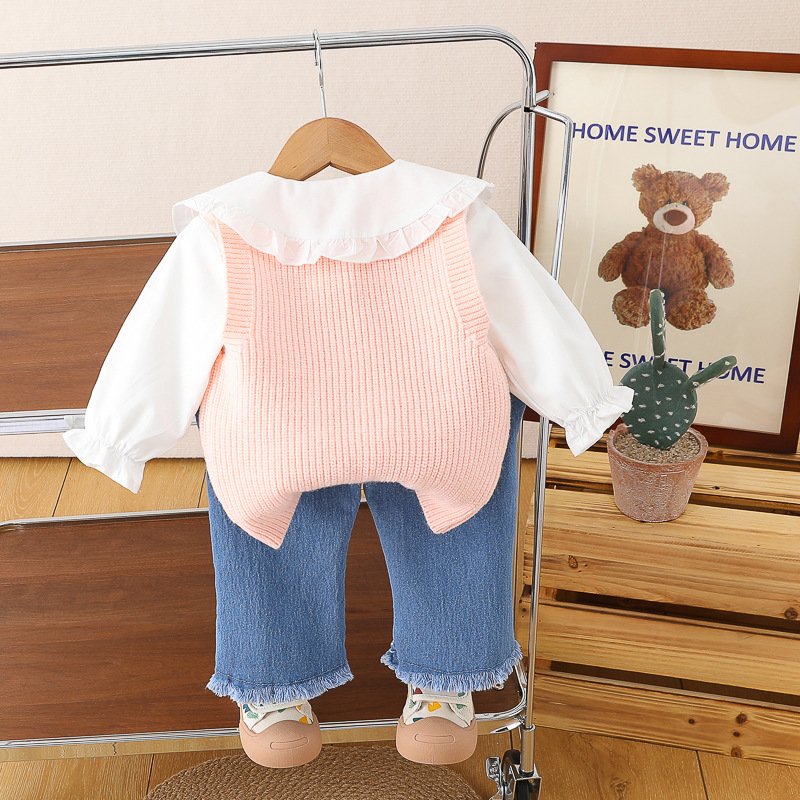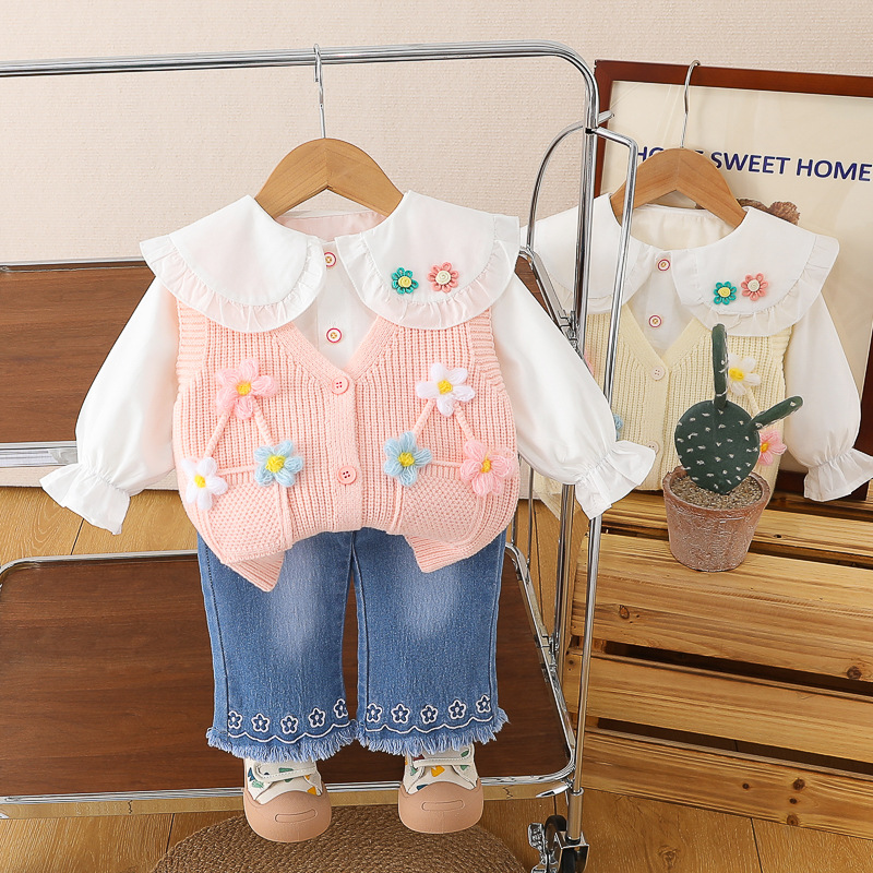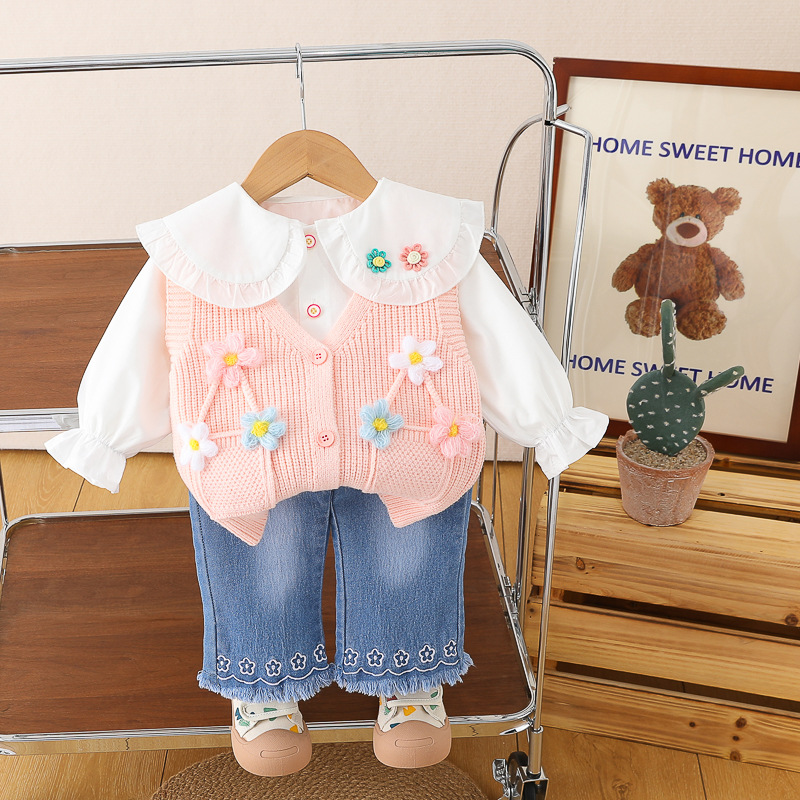 봄 2025 새로운 여자 스웨터 조끼 셔츠 긴 소매 3 조각 세트 여성 아기 캐주얼 데님 바지 세트스토어 가기