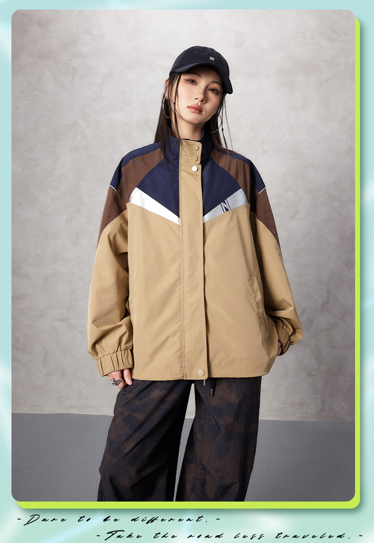 Tuogu 봄 신상품 스탠드 칼라 배색 카키색 윈드브레이커 여성용 루즈핏 캐주얼 긴팔 재킷 야구 점퍼