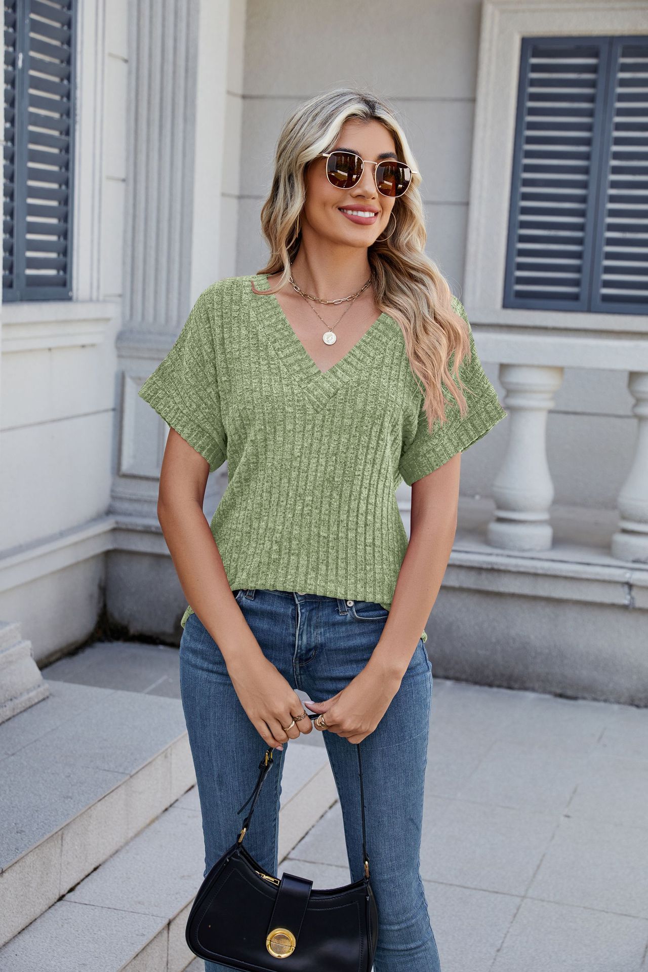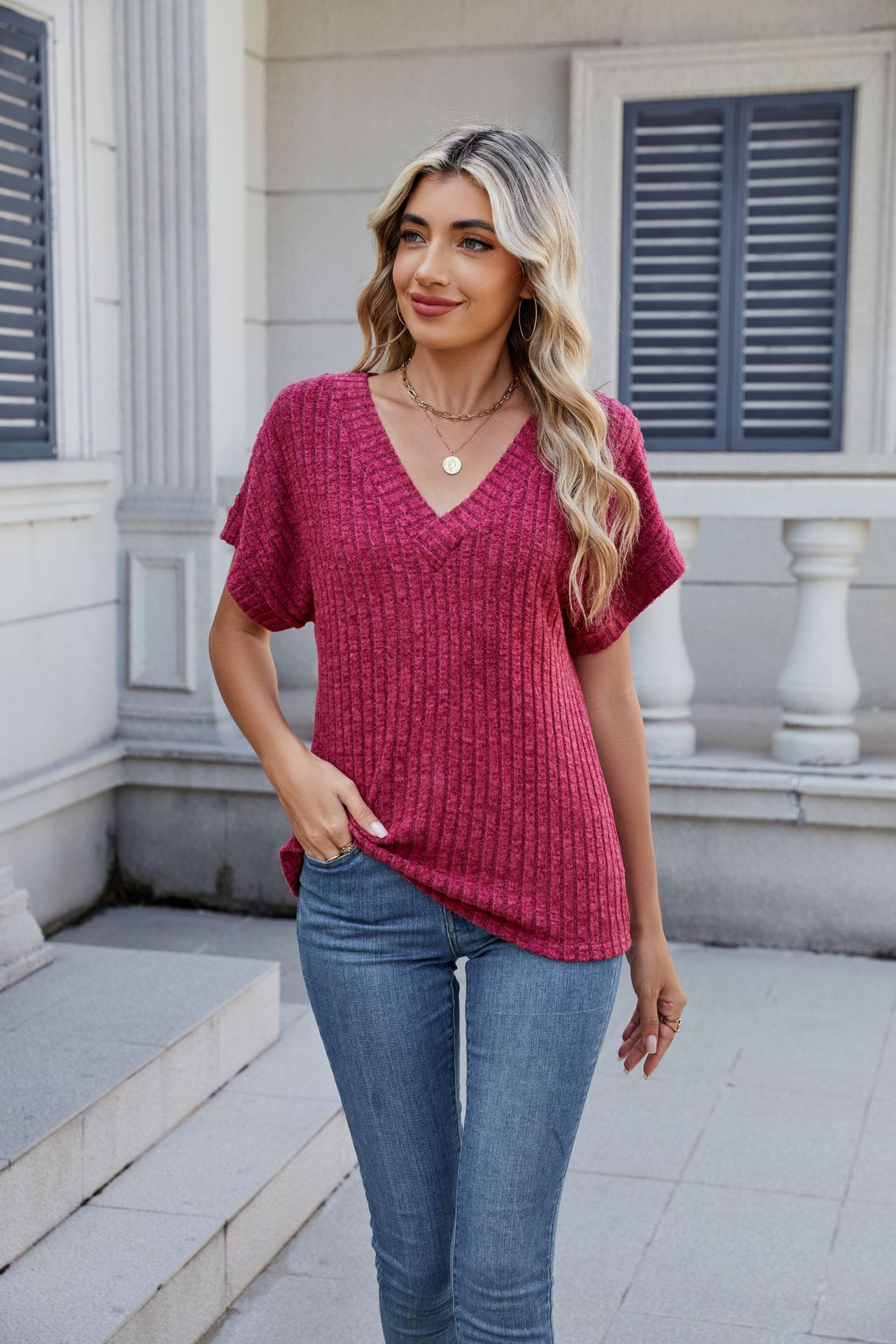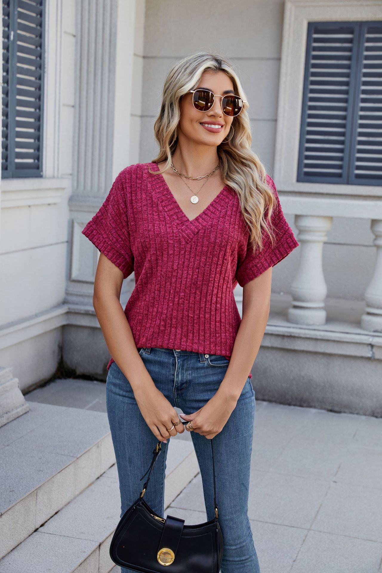 2025 봄 국경 유럽 및 미국 신제품 아마존 TEMU 폭발 여성 느슨한 캐주얼 솔리드 컬러 V 넥 티셔츠 짧은 소매