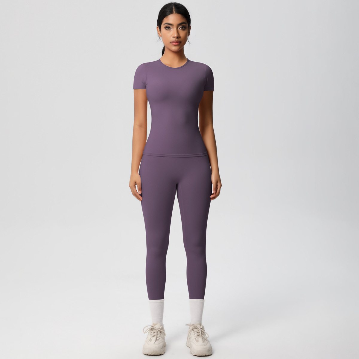 유럽과 미국의 알몸 단단한 빠른 건조 반팔 요가 세트 세트 높은 허리 엉덩이 들어 올리는 야외 훈련 달리기 피트니스 운동복
