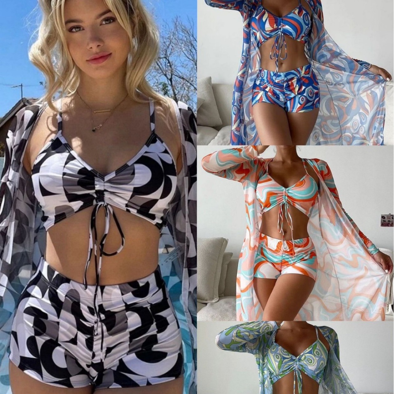 유럽과 미국 스타일의 비키니 수영복 3피스 세트, 하이웨이스트 긴팔 커버업, 자외선 차단, 크로스보더 드로스트링 수영복, 여성용 비치웨어스토어 가기