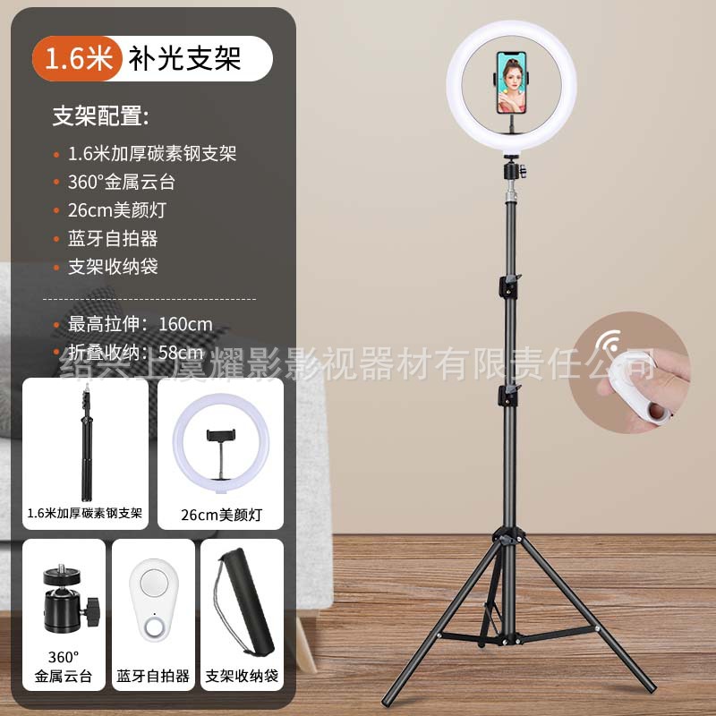 • 1.6m 탄소강 브래킷 + 금속 팬/틸트 + 휴대폰 클립 + 보관 가방 + 26cm 3색 뷰티 램프 + 블루투스