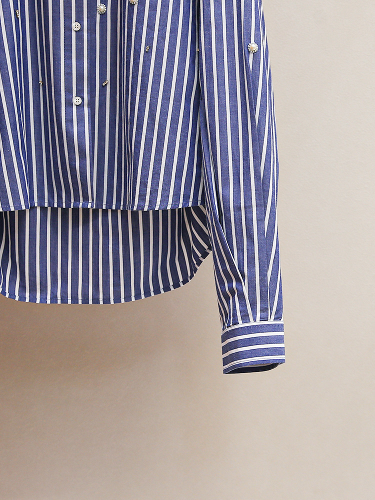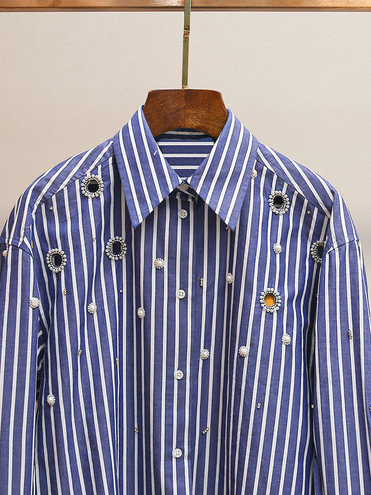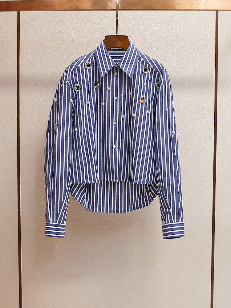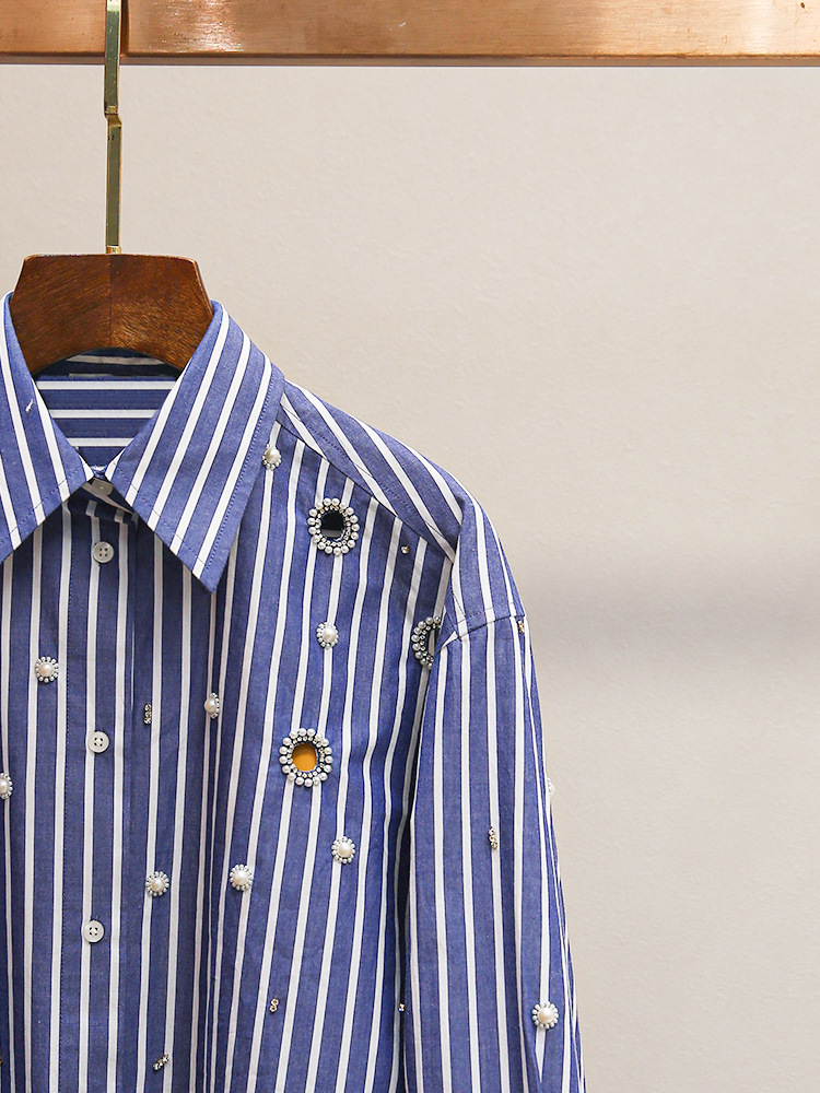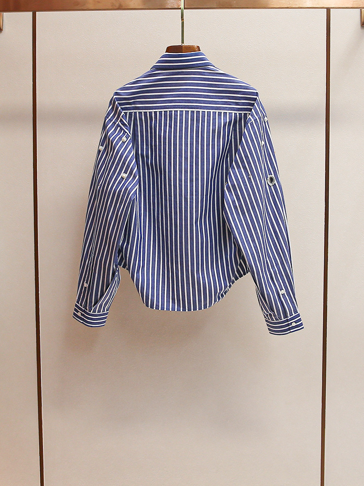 S 홈 2025 이른 봄 새로운 패션 프랑스 스타일 비즈 중공 진주 짧은 다목적 스트라이프 셔츠 탑스토어 가기