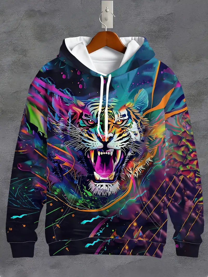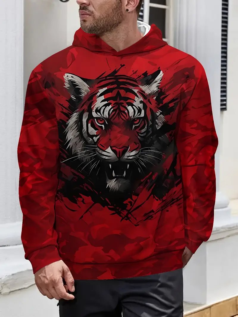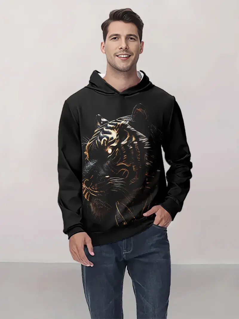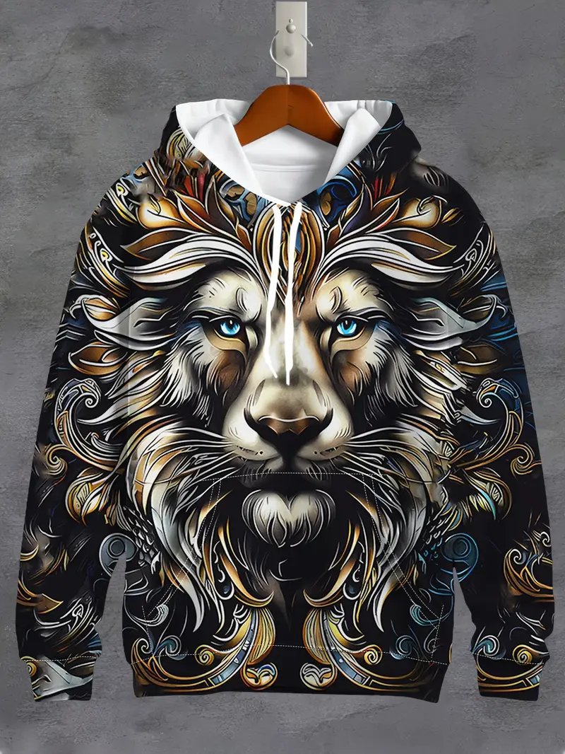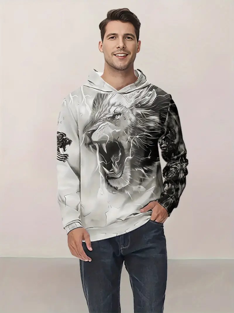 Temu 국경 남성 긴 소매 후드 3D 디지털 인쇄 사자 호랑이 늑대 프린트 스트리트 패션 스웨터