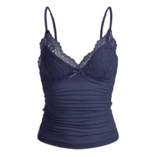 2025년 유럽 및 미국 스타일 섹시 로우컷 레이스 V넥 리본 솔리드 컬러 캐미솔 슬림핏 숏탑스토어 가기