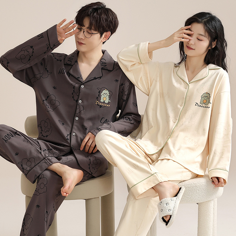 커플 잠옷 봄과 가을 긴 소매 한국 스타일 카디건 세트 가을 청소년 간단한 캐주얼 여성 남성스토어 가기