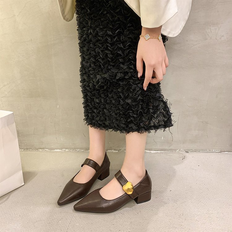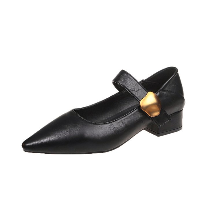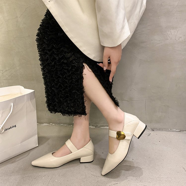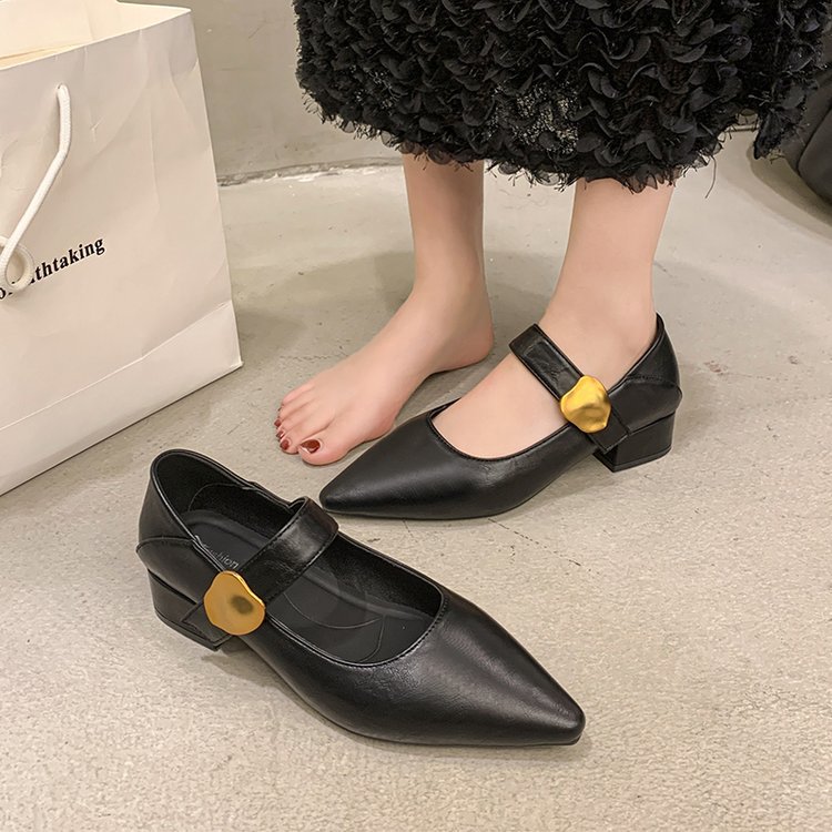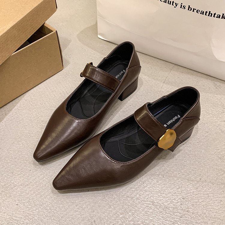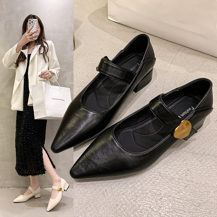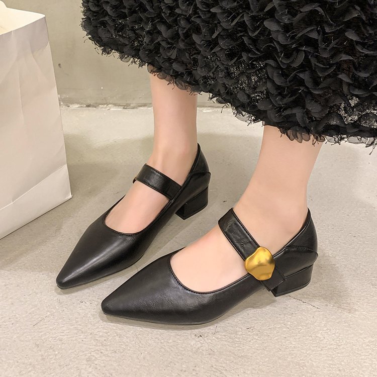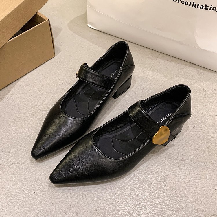 2025 봄 새 뾰족한 신발 두꺼운 굽 얕은 입 메리 제인 신발 한 단어 버클 미들 패션 여성 신발 도매스토어 가기