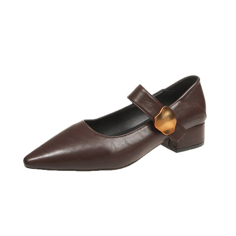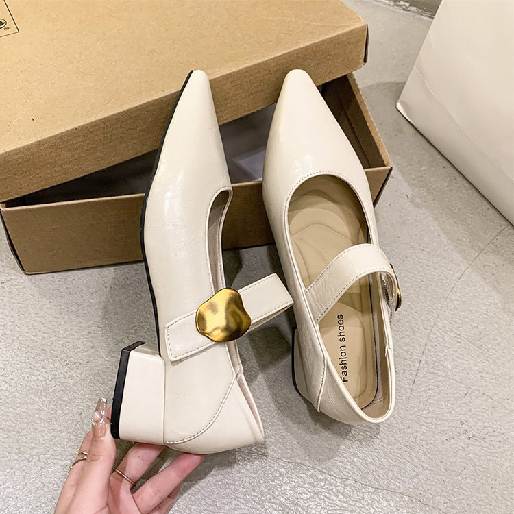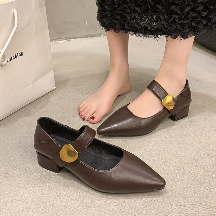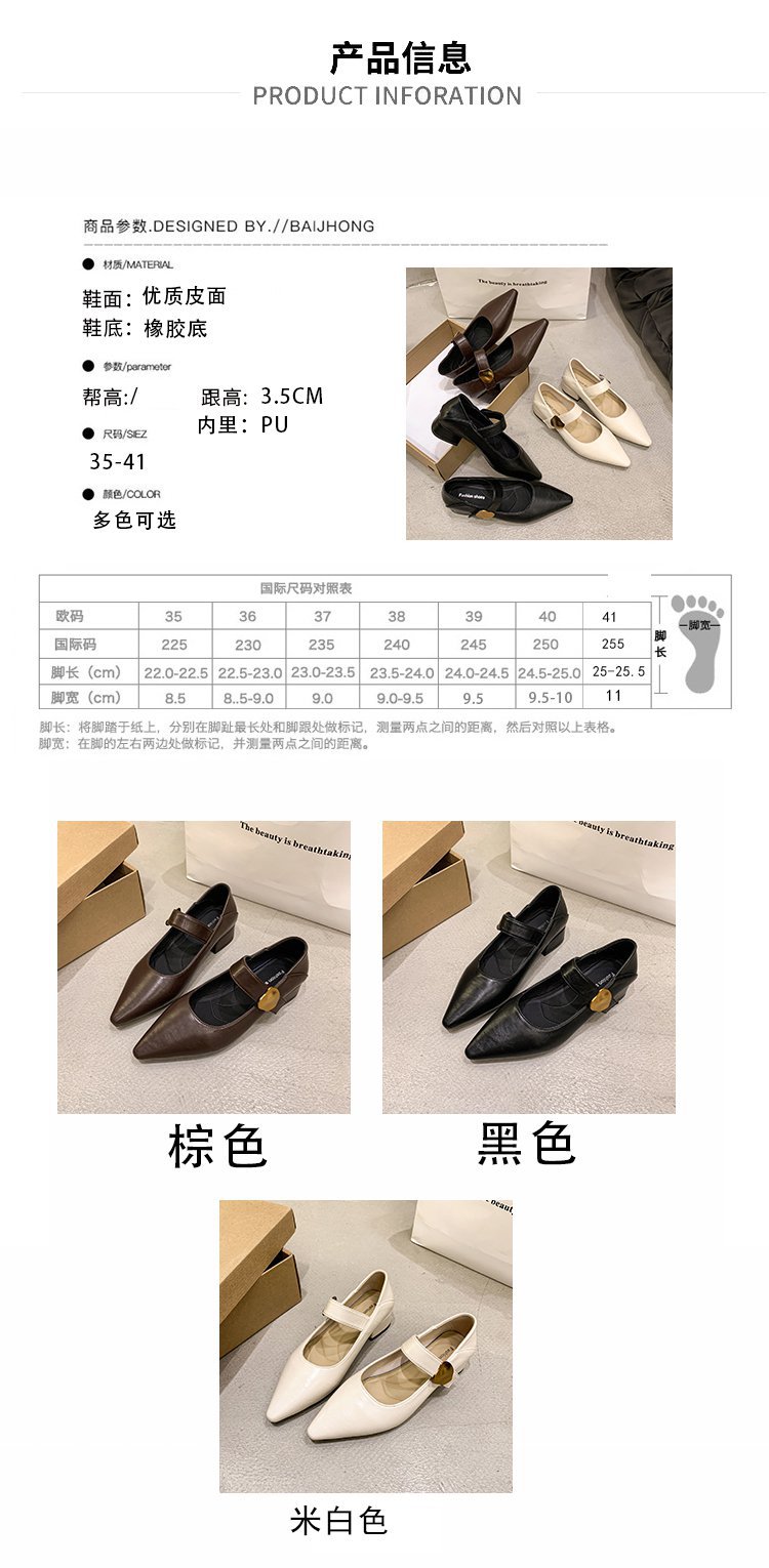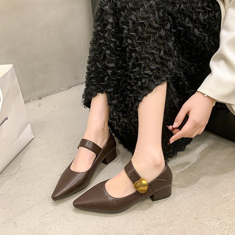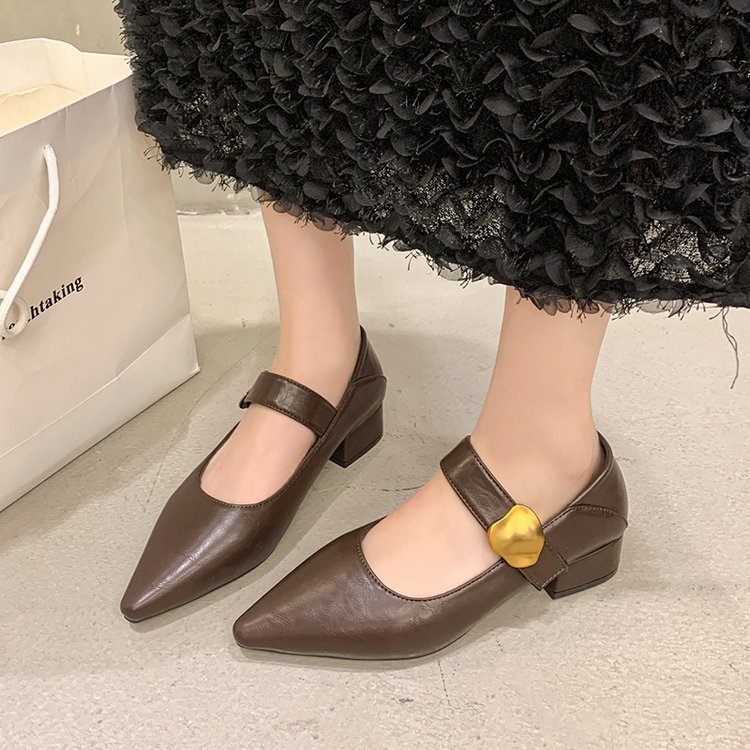 2025 봄 새 뾰족한 신발 두꺼운 굽 얕은 입 메리 제인 신발 한 단어 버클 미들 패션 여성 신발 도매스토어 가기