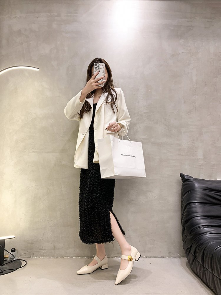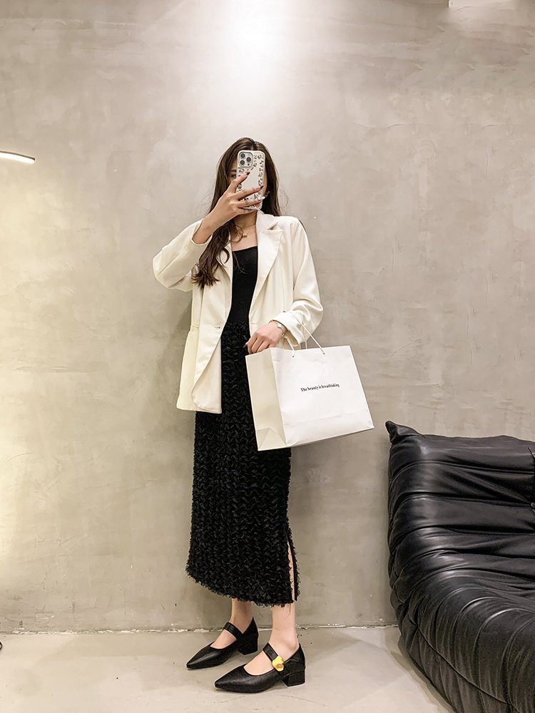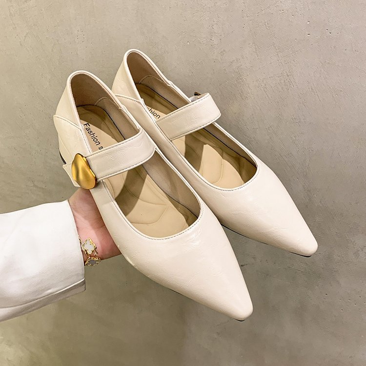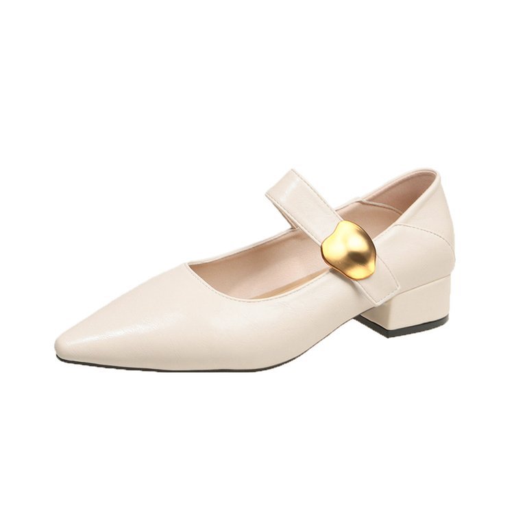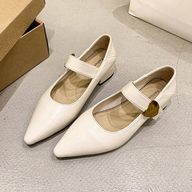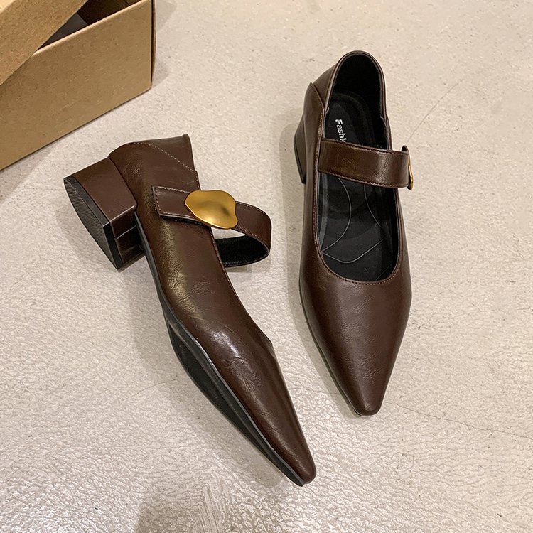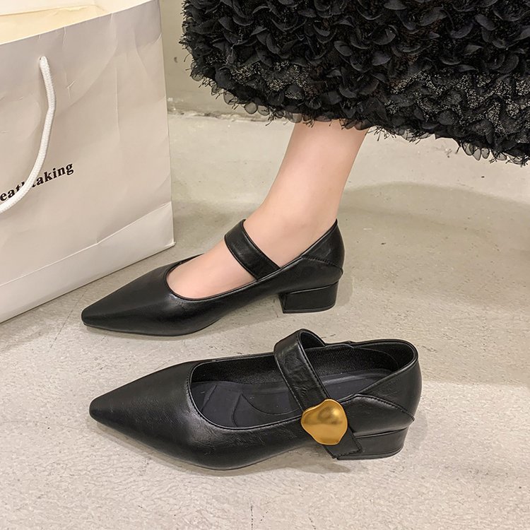 2025 봄 새 뾰족한 신발 두꺼운 굽 얕은 입 메리 제인 신발 한 단어 버클 미들 패션 여성 신발 도매스토어 가기