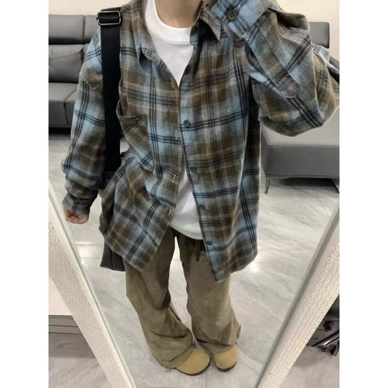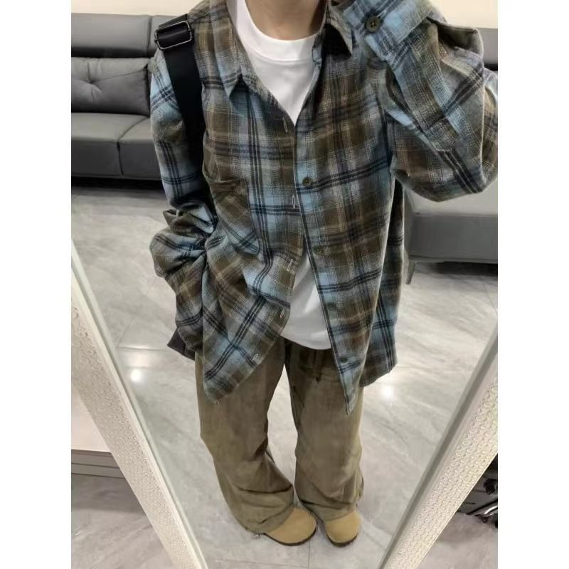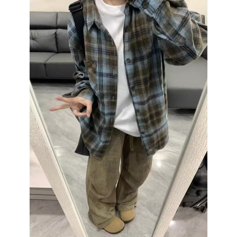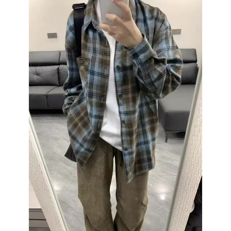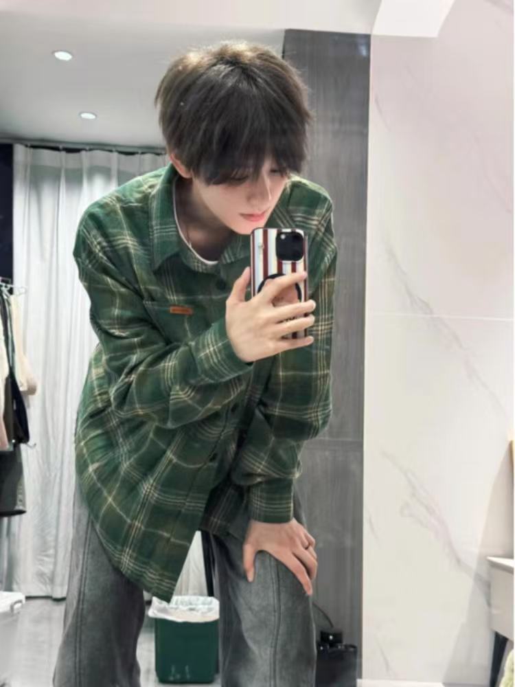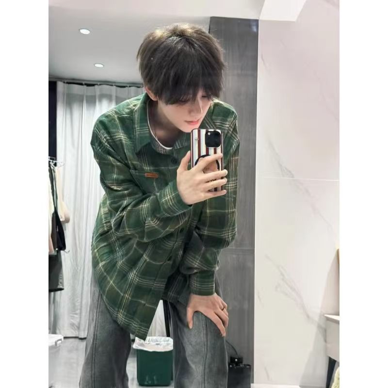 아메리칸 스타일 레트로 다크 그린 격자 무늬 셔츠 남성용 긴팔 봄과 가을 골동품 빈티지 트렌디 브랜드 격자 무늬 셔츠 트렌디스토어 가기