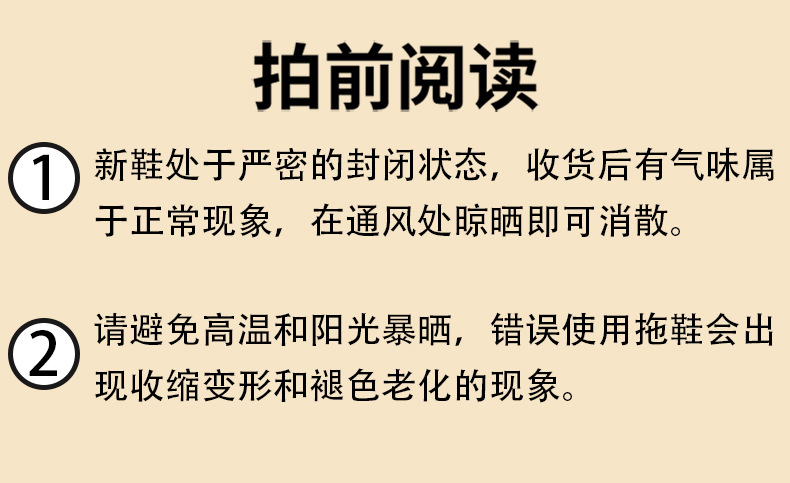我们发货前都会检查仔细,万一有落网之鱼,请及时联系客服,把有问题的拖鞋拍照留底提交给我们,我们会妥善处理,由于生产过程中鞋处于密封包装,少许新鞋气味,放置通风出些许时间即可散发,产品生产均处于严格管控中,无毒无害放心使用!希望我们的全心全意跟努力能换回你们的5星好评!