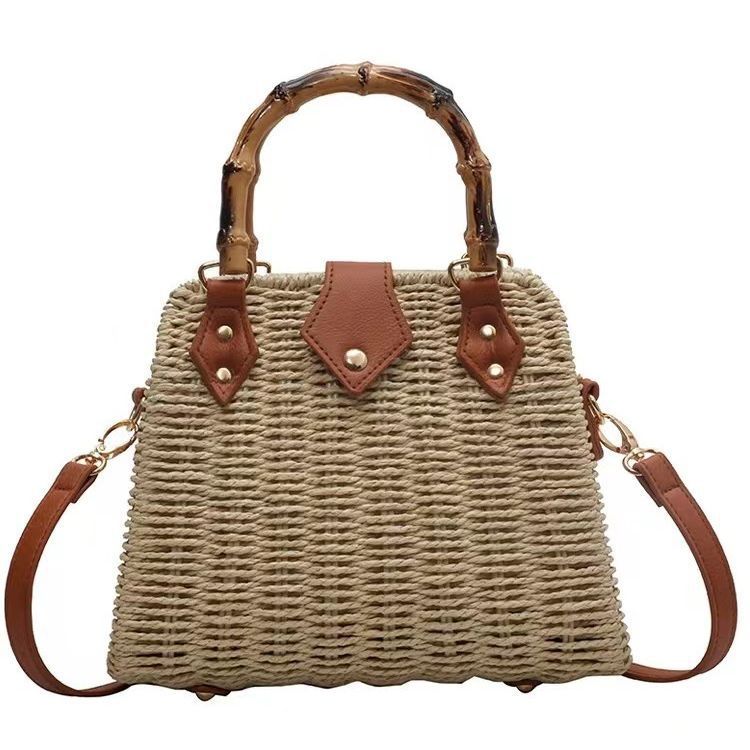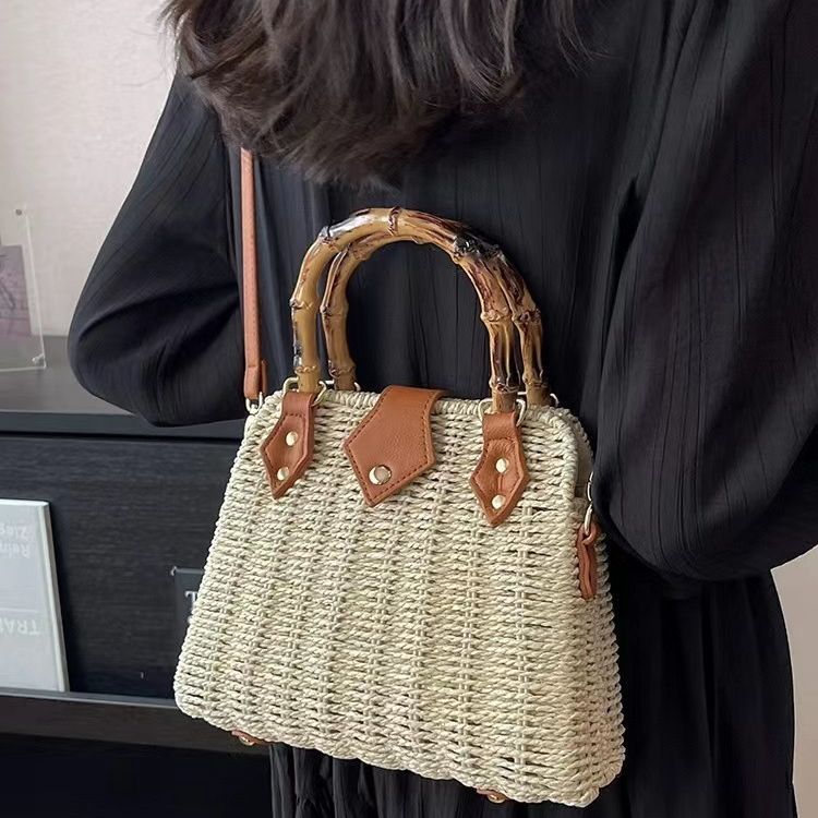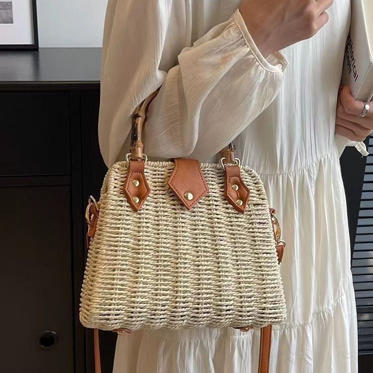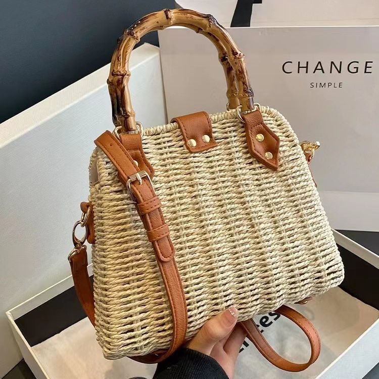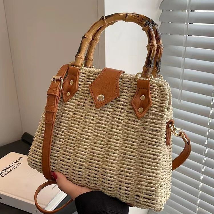목가적 인 스타일 밀짚 가방 여성의 2024 여름 새로운 복고풍 휴대용 대나무 가방 모든 경기 어깨 크로스 바디 가방 비치 백스토어 가기