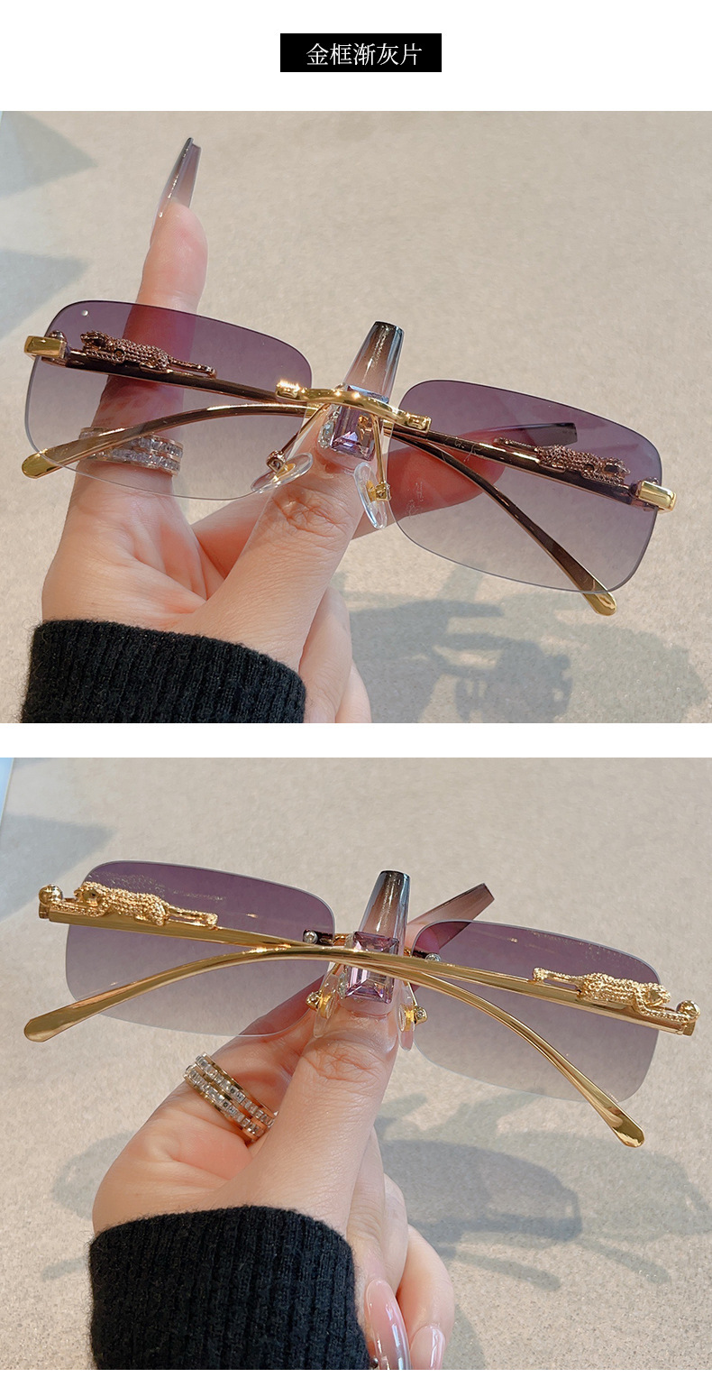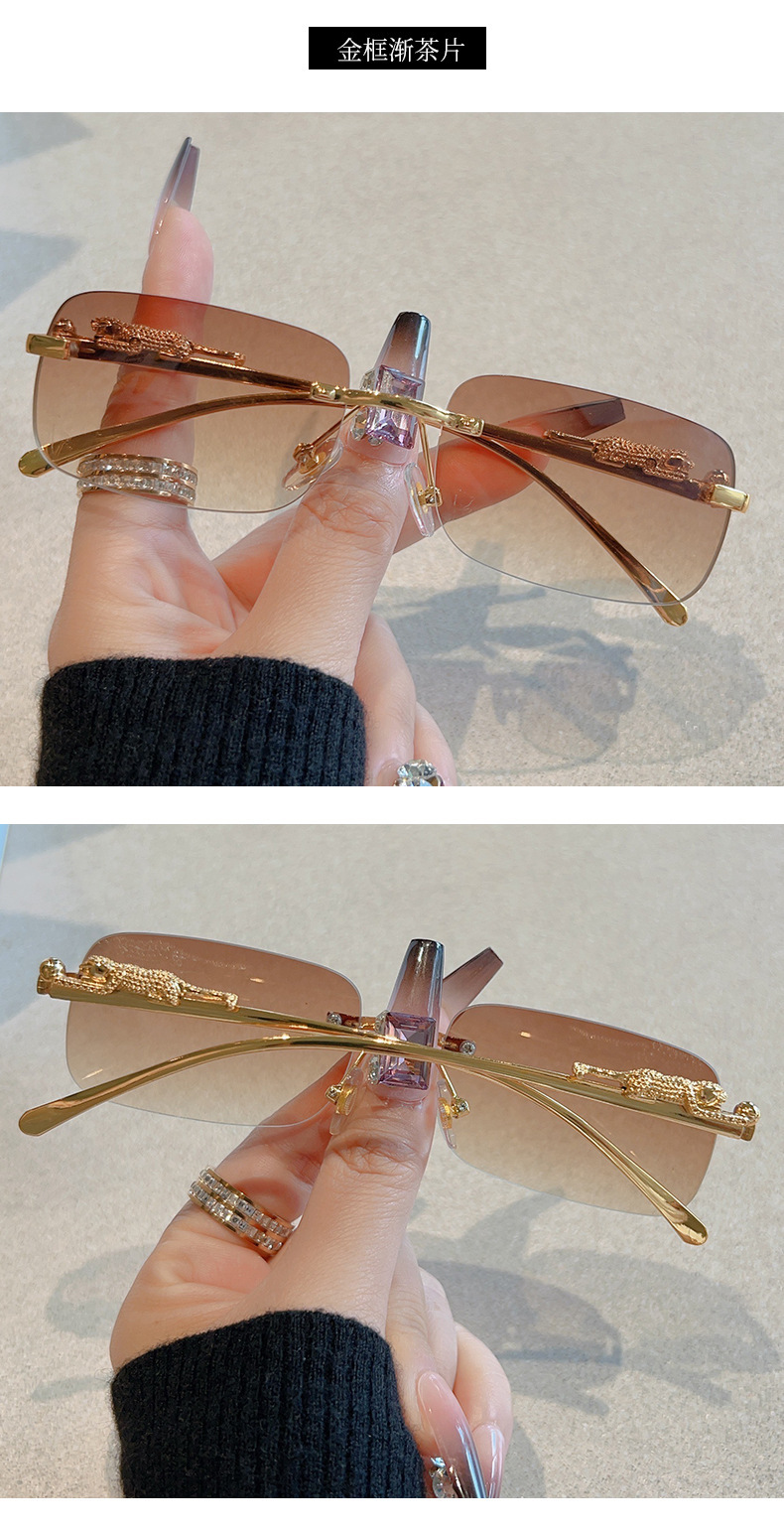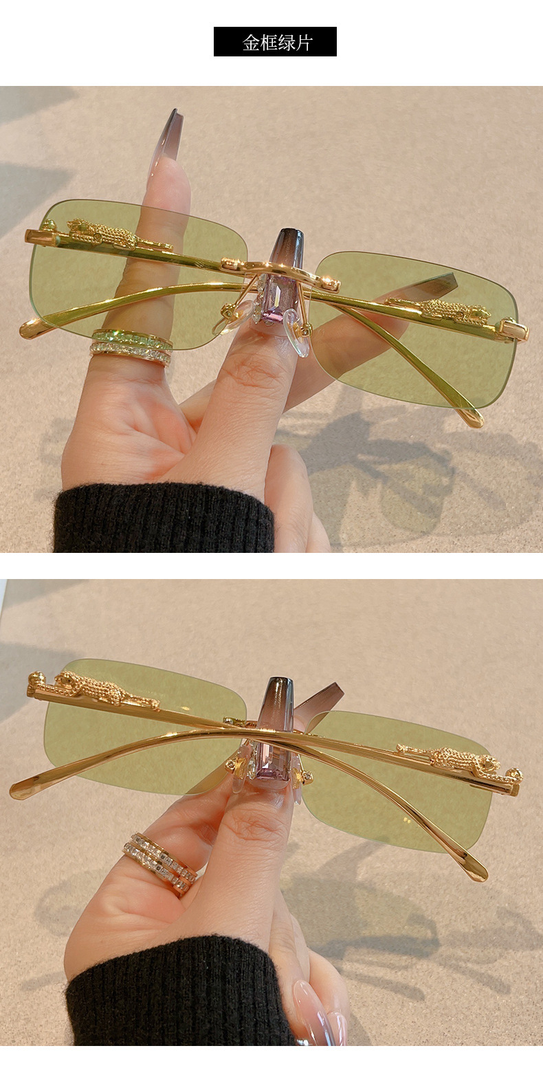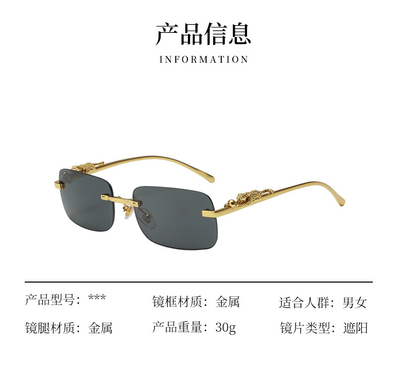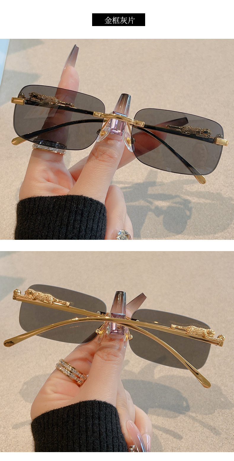 국경을 넘는 새로운 프레임없는 사각형 치타 장식 선글라스 남성과 여성 복고풍 트렌드 표범 머리 금속 선글라스 도매스토어 가기