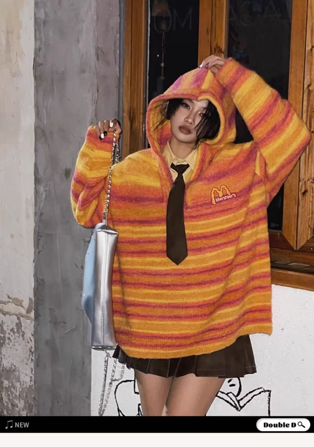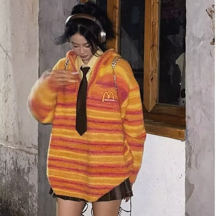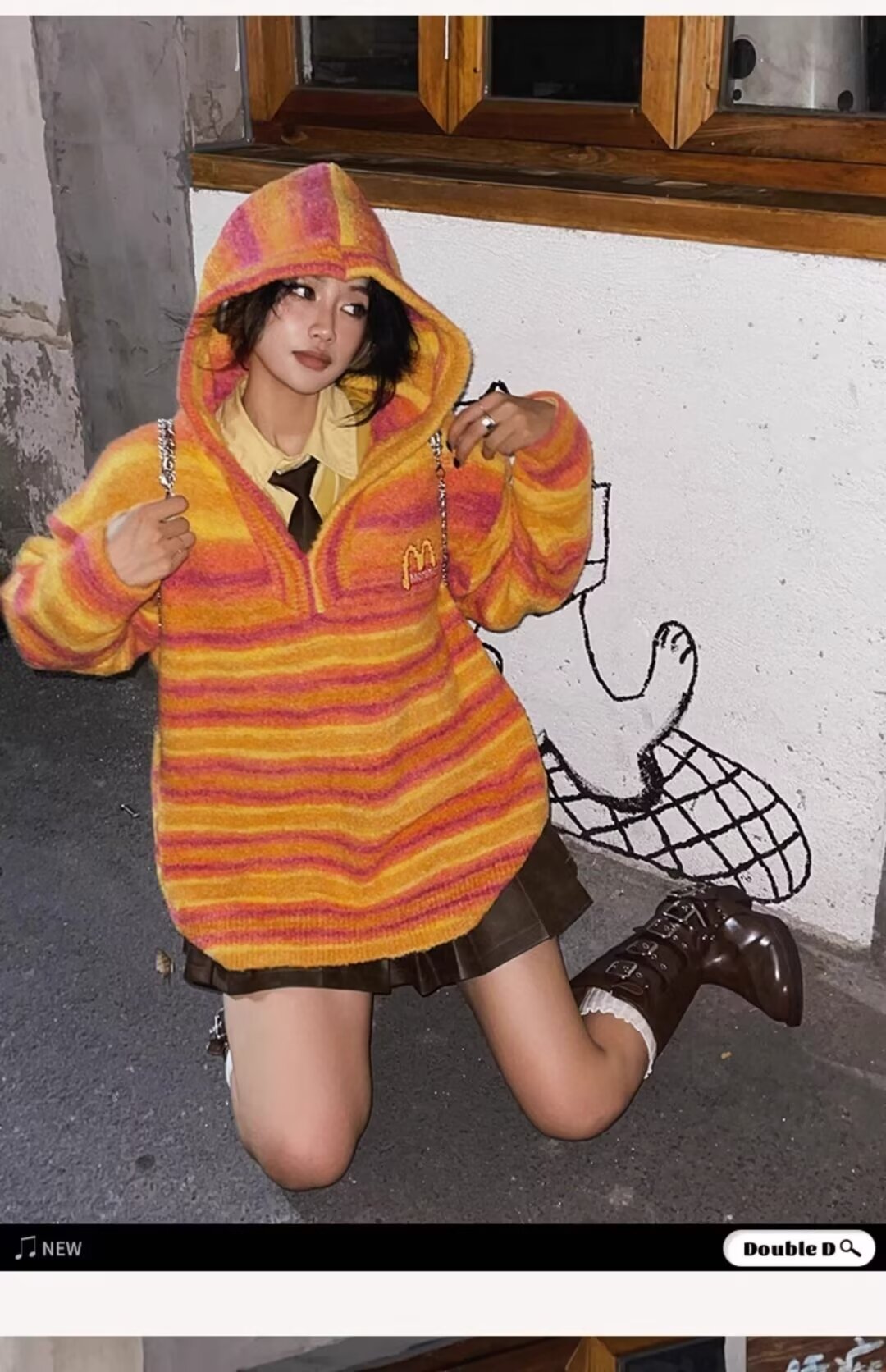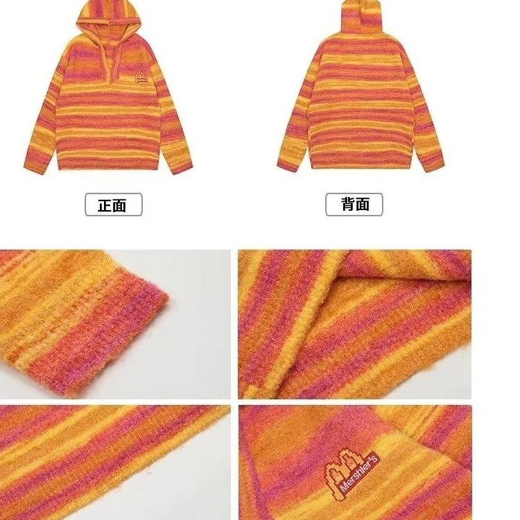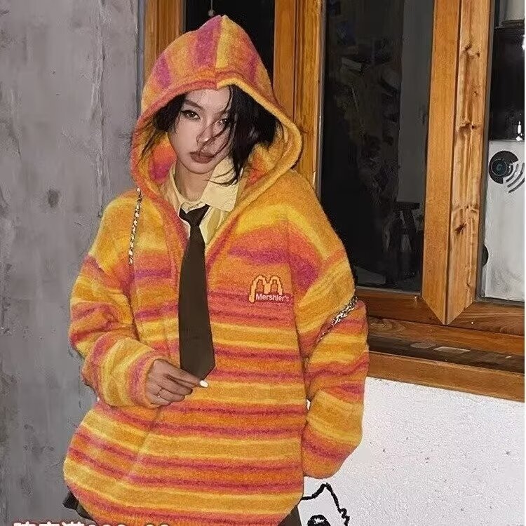 스웨터 남자 겨울 아우터 착용 게으른 감각 대비 컬러 스트라이프 패션 커플 니트웨어 후드 재킷 맥도날드의 자수