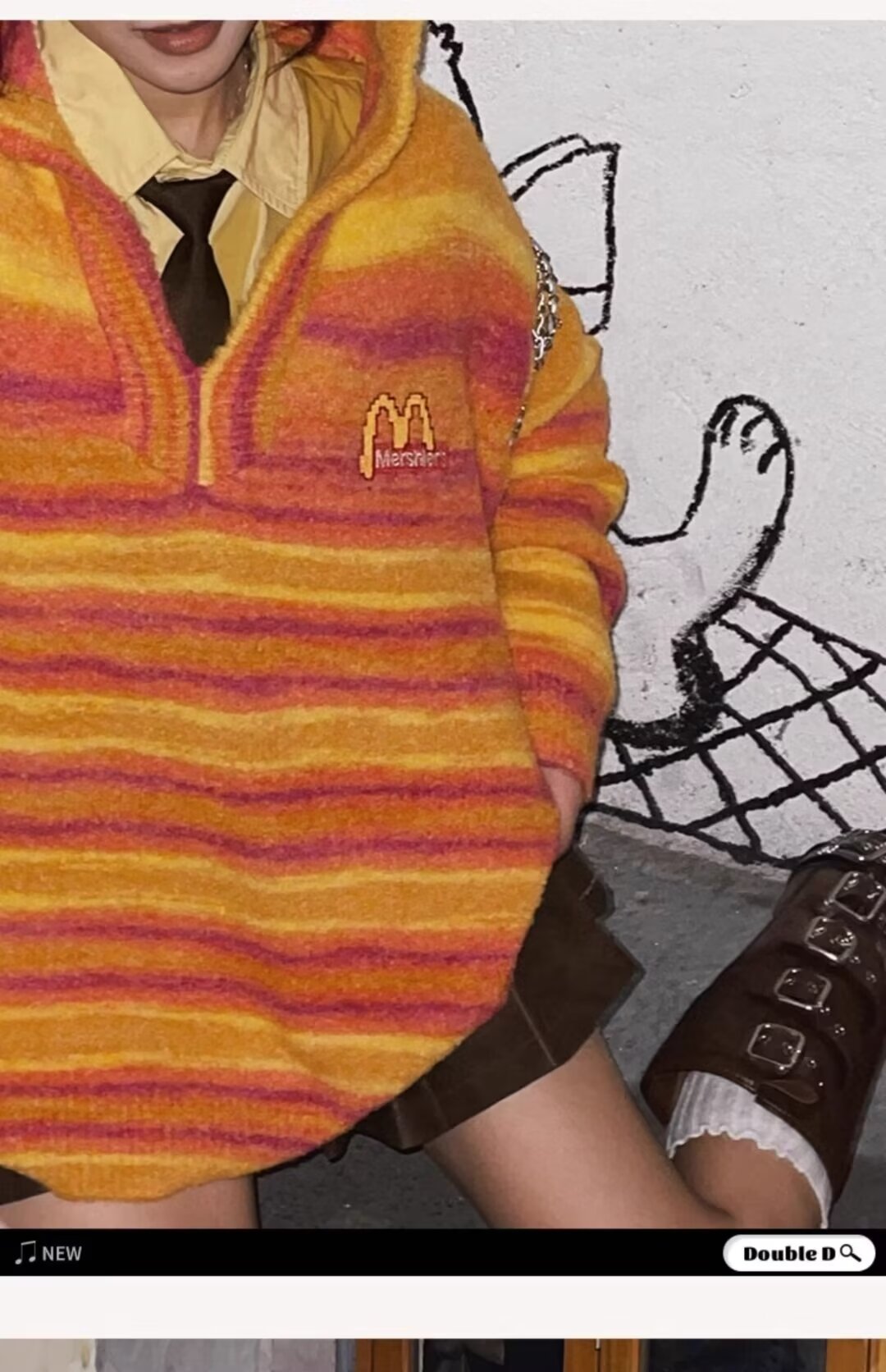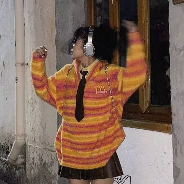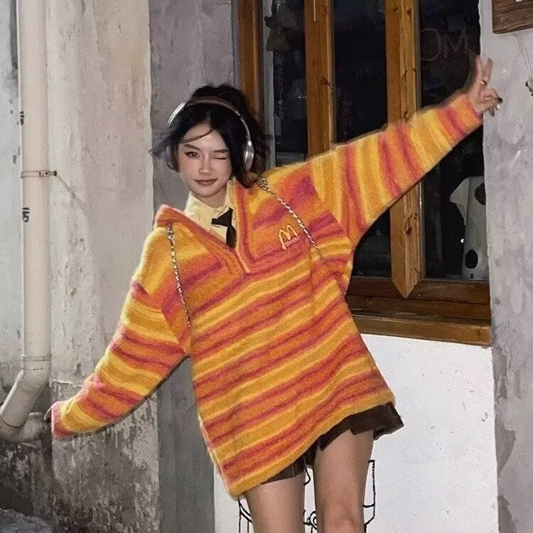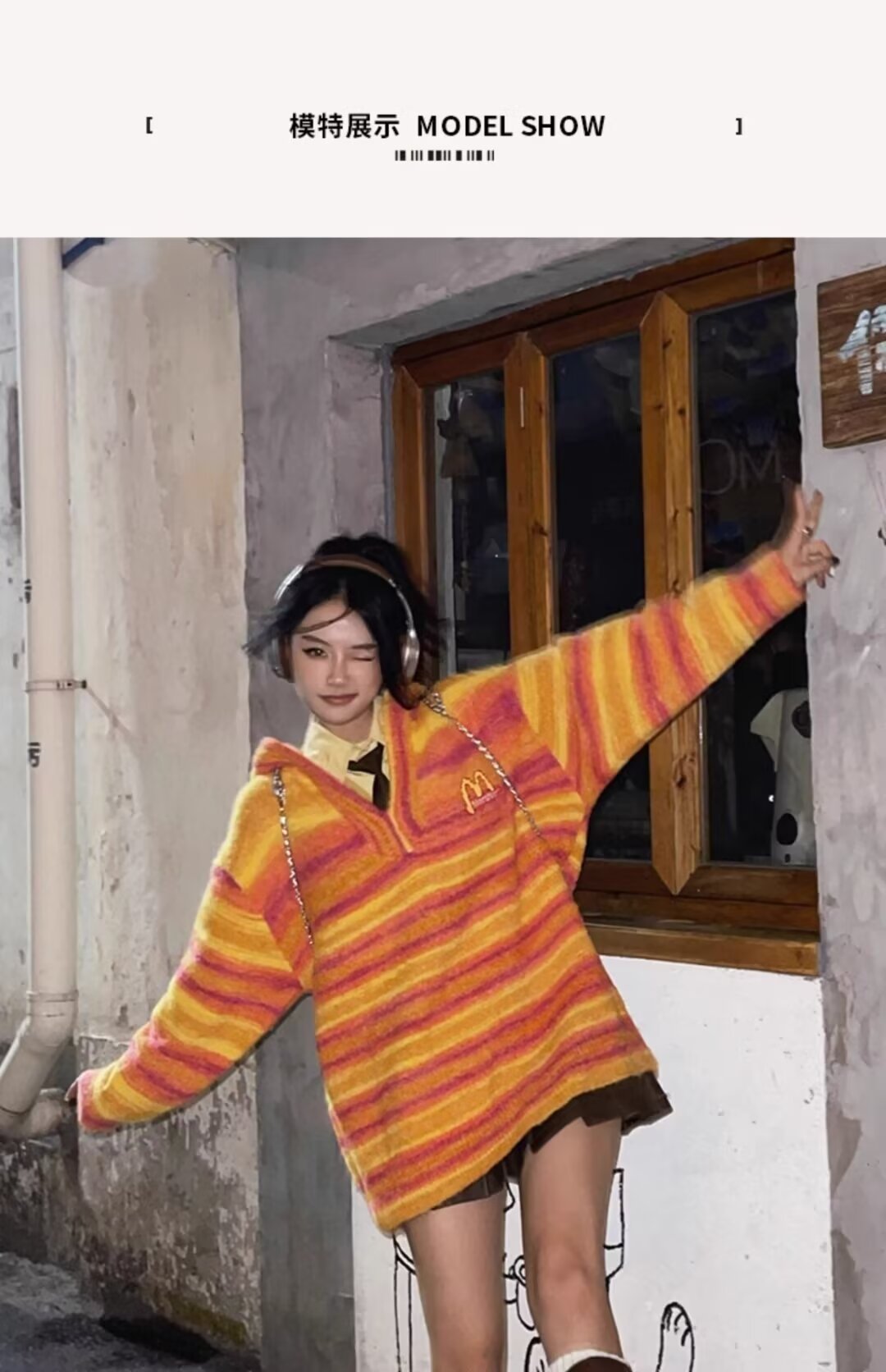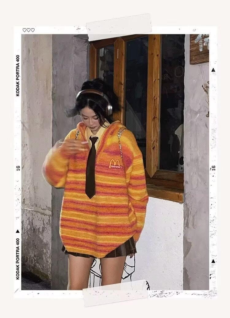 스웨터 남자 겨울 아우터 착용 게으른 감각 대비 컬러 스트라이프 패션 커플 니트웨어 후드 재킷 맥도날드의 자수