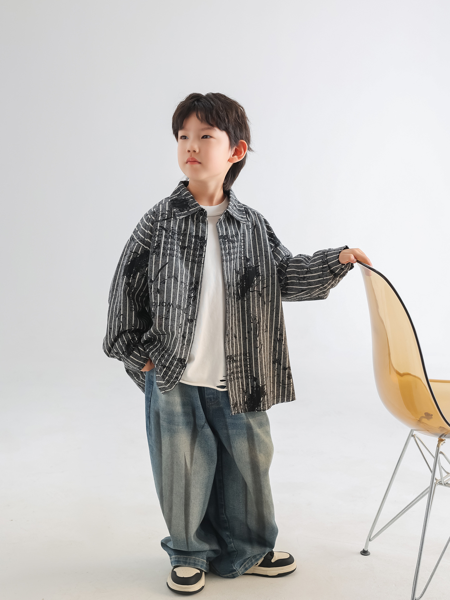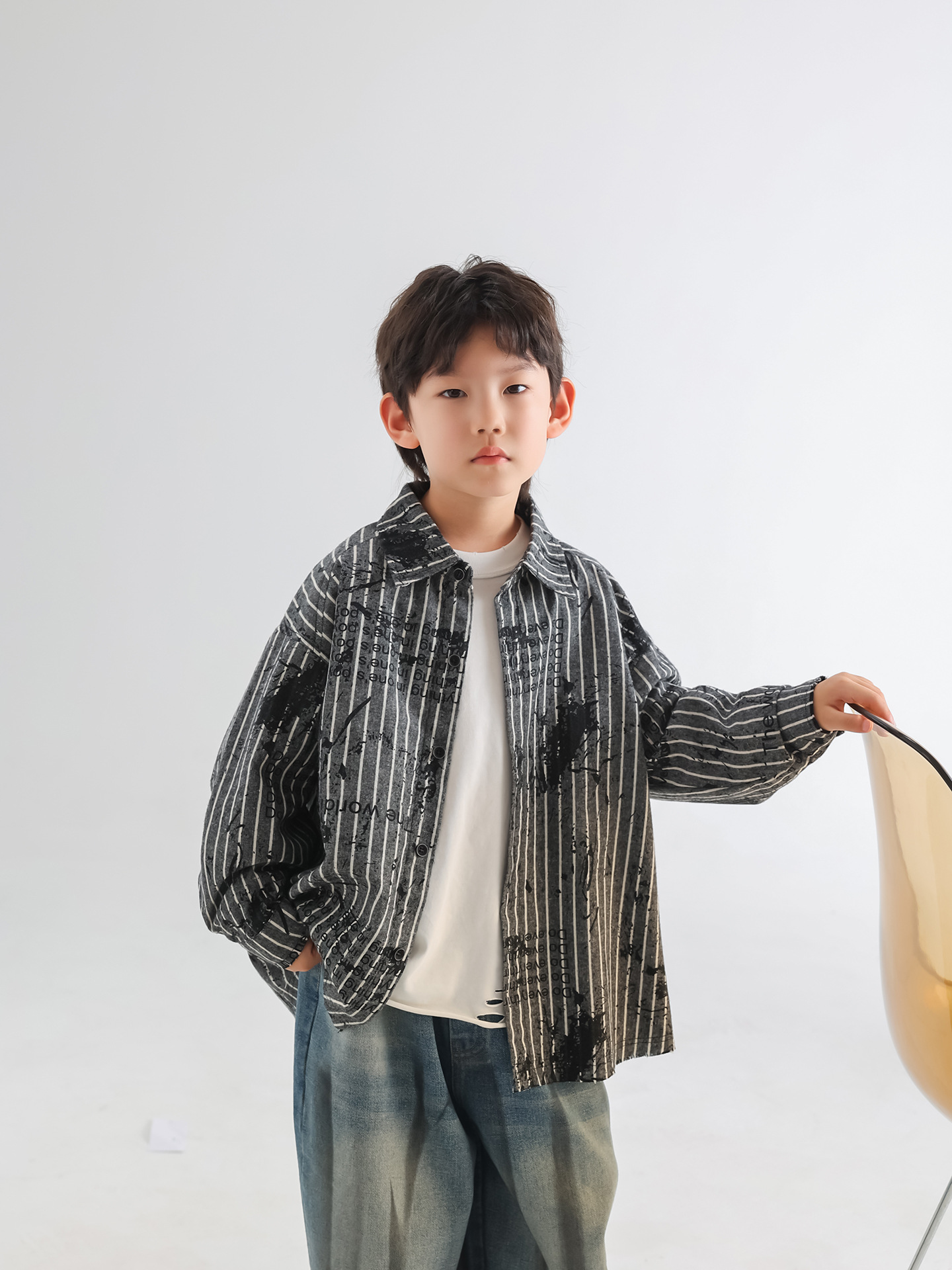 남아용 봄 셔츠 한국 스타일 아동복 2026 신상 아동 봄 스트라이프 프린트 캐주얼 심플 트렌디 셔츠 상의