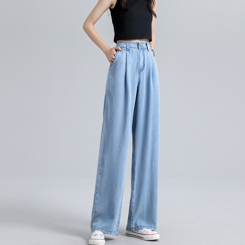 Xinyu 높은 허리 넓은 다리 모방 텐셀 청바지 여성 여름 착용 Draps 얇은 느슨한 직선 바지 인터넷 인기 여성 바지스토어 가기