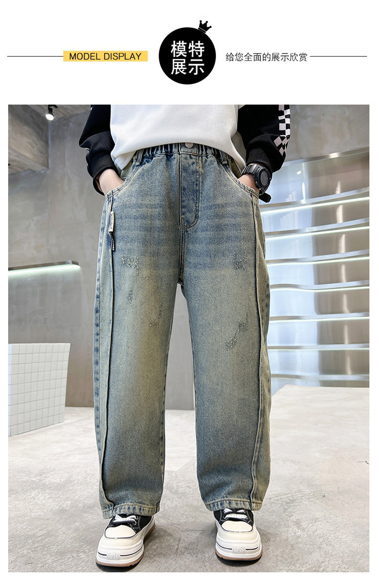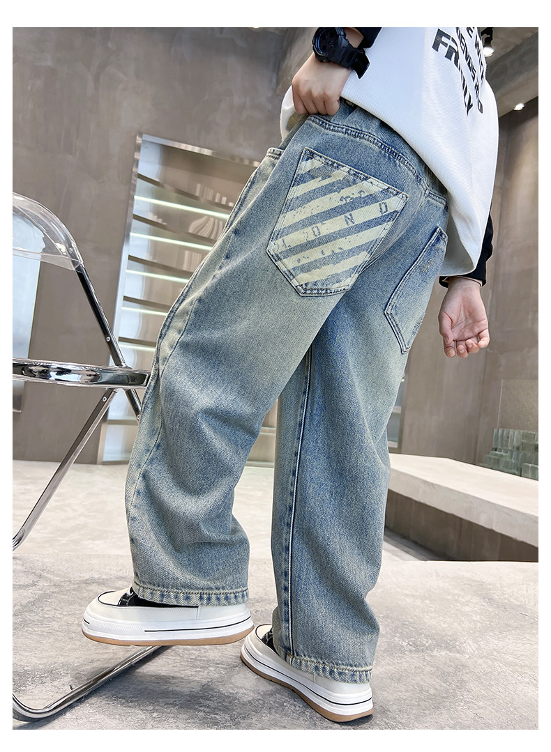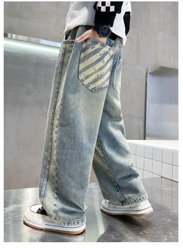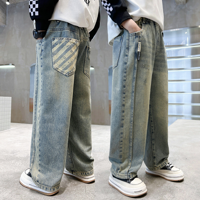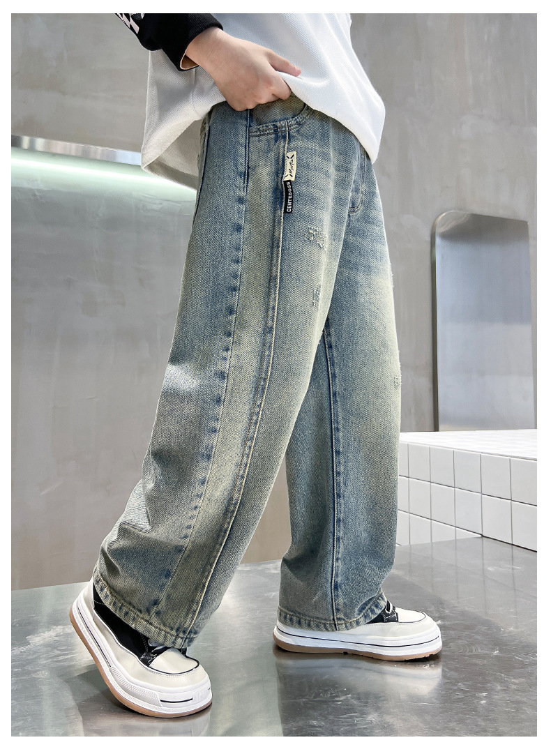 소년 데님 바지 2025 봄 새로운 스타일 중대형 어린이 봄과 가을 유행 스트레이트 바지 어린이 느슨한 넓은 다리 바지스토어 가기