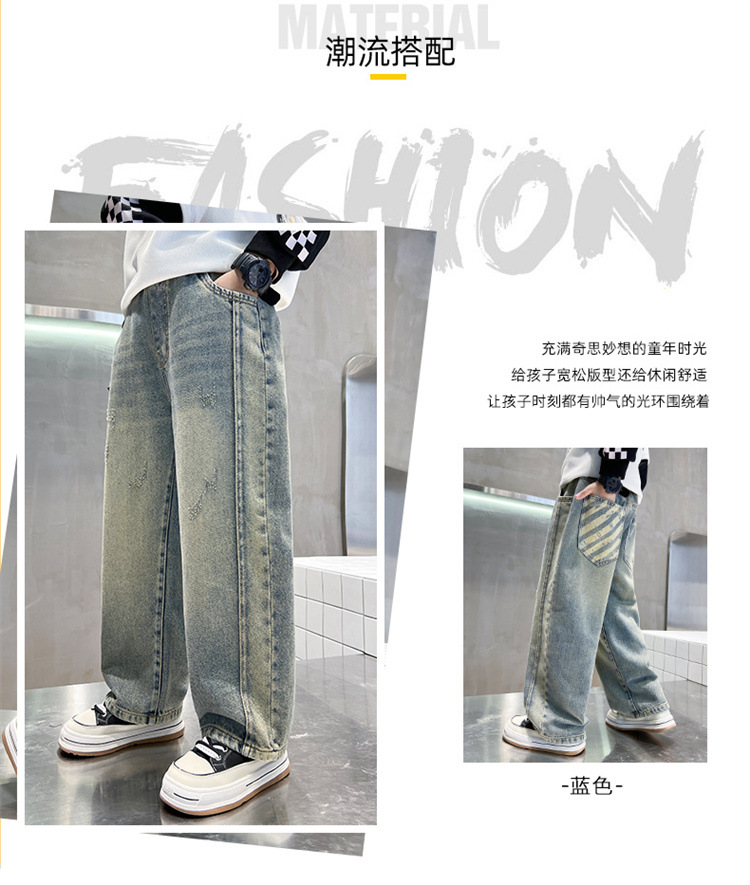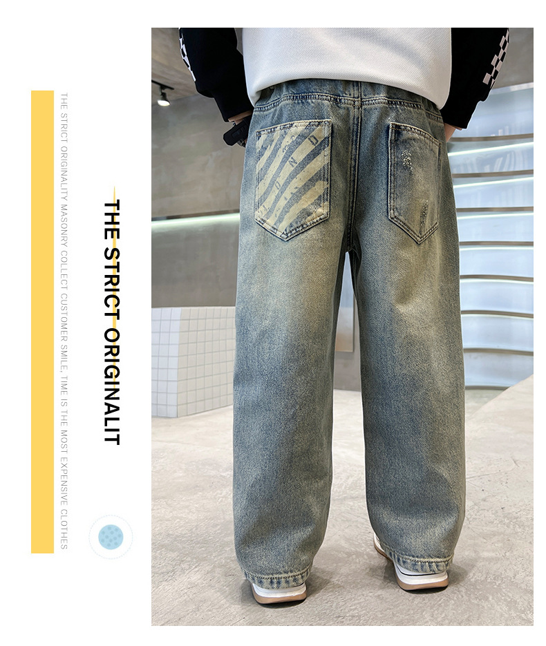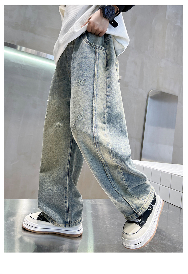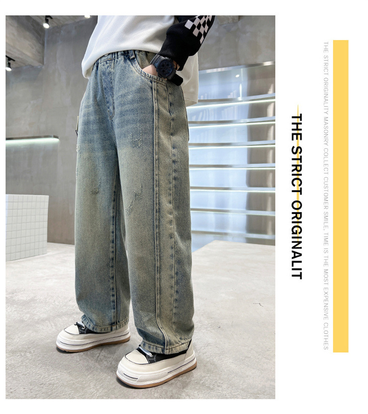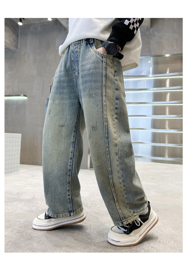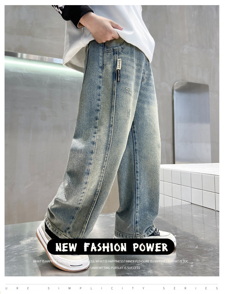 소년 데님 바지 2025 봄 새로운 스타일 중대형 어린이 봄과 가을 유행 스트레이트 바지 어린이 느슨한 넓은 다리 바지스토어 가기