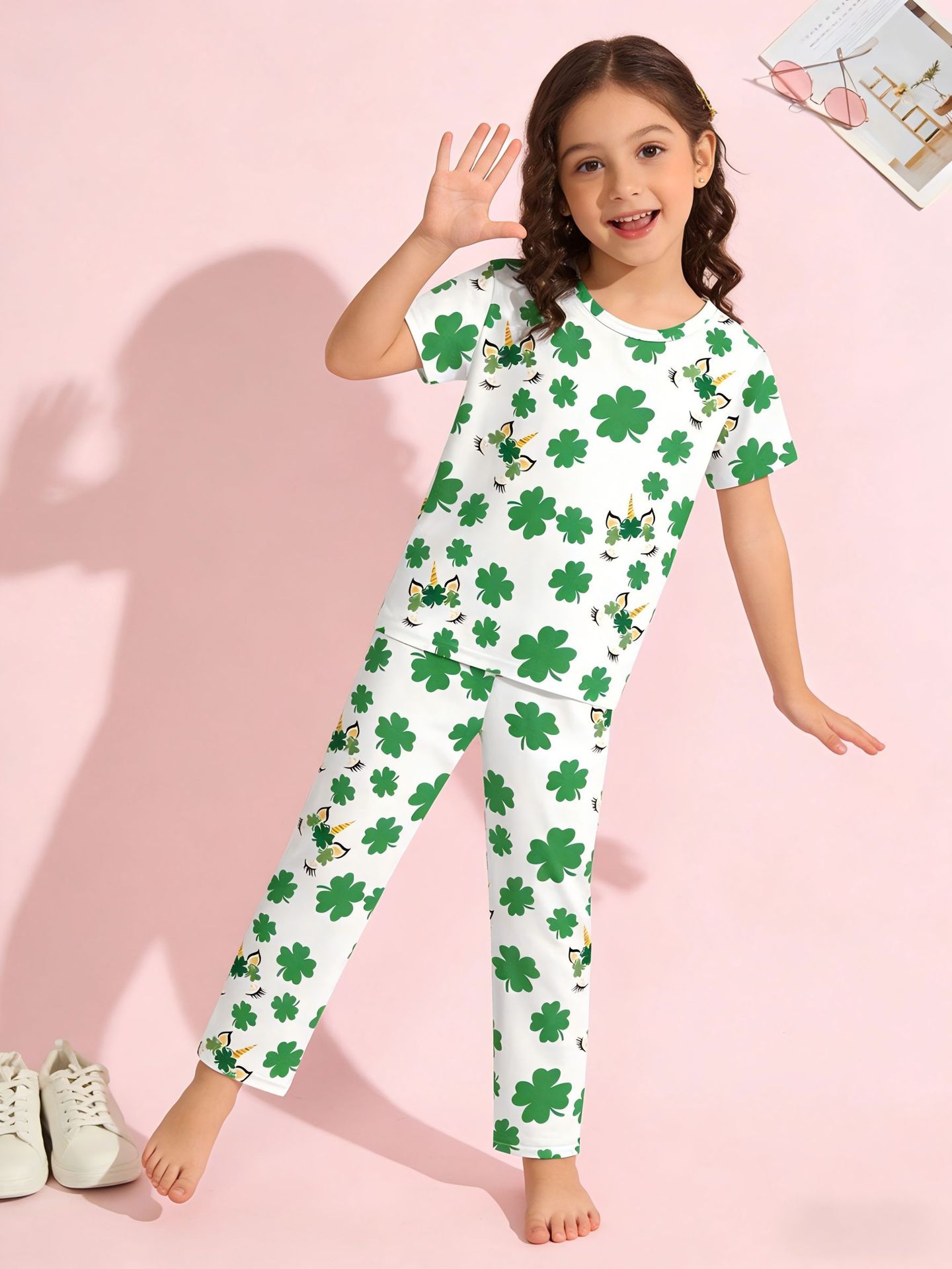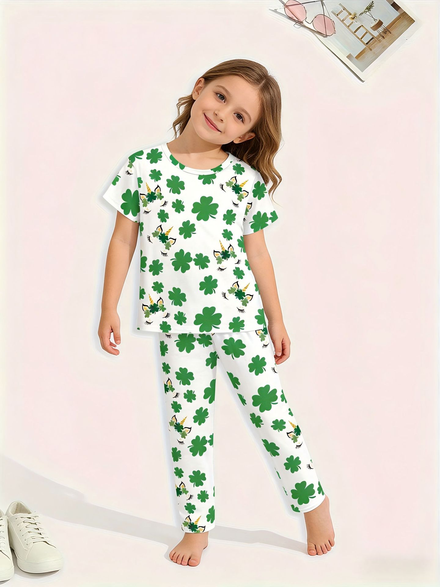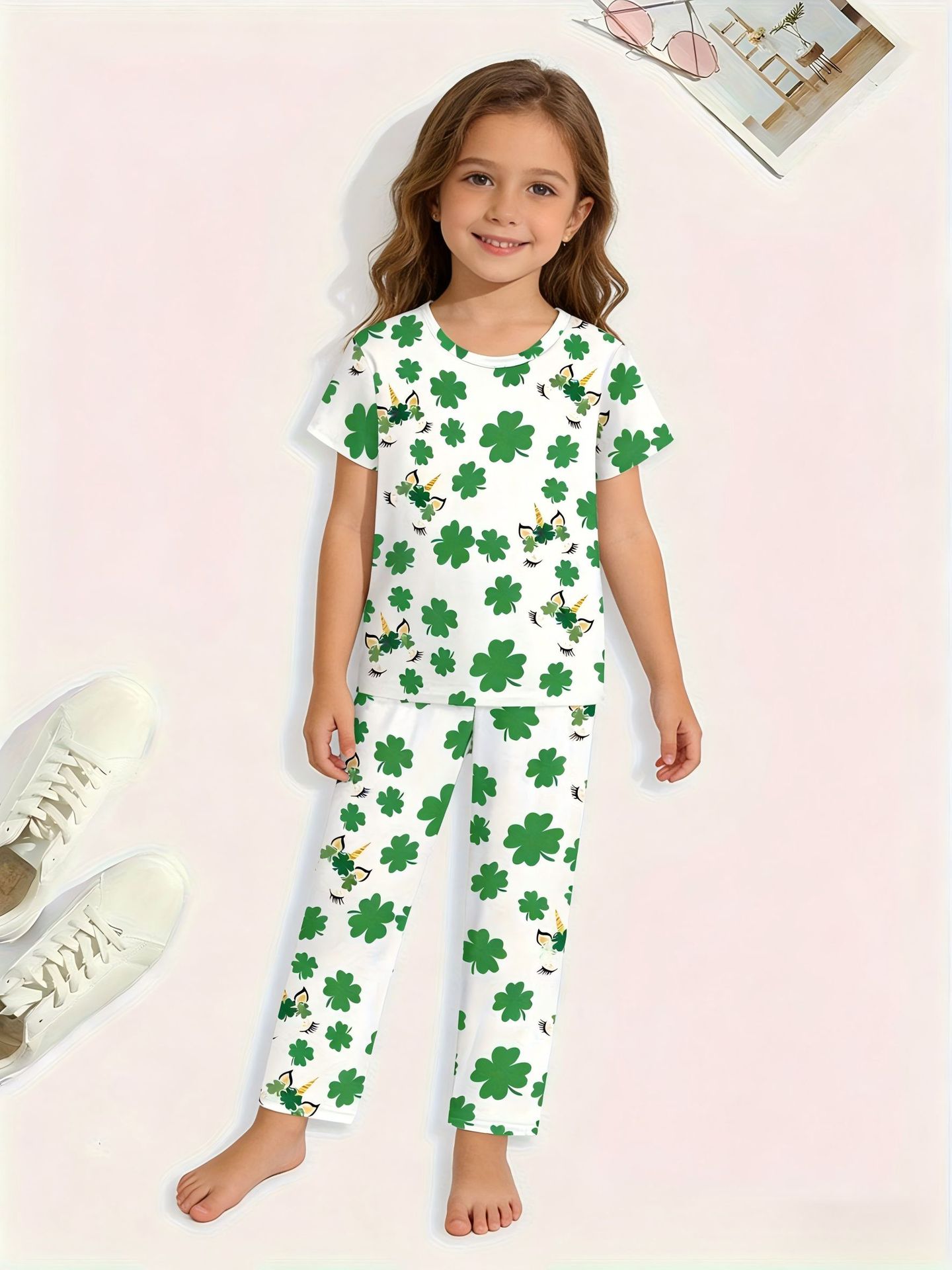어린이 의류 여름 에어컨 의류 반팔 바지 중소 및 대형 어린이 4 잎 클로버 인쇄 풀 플라워 세트 티셔츠 소년 소녀 용 파자마스토어 가기