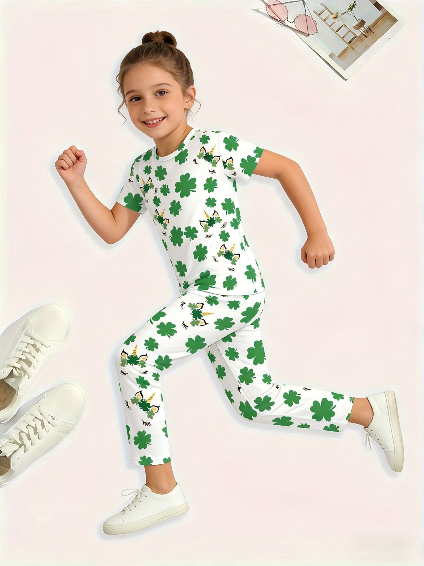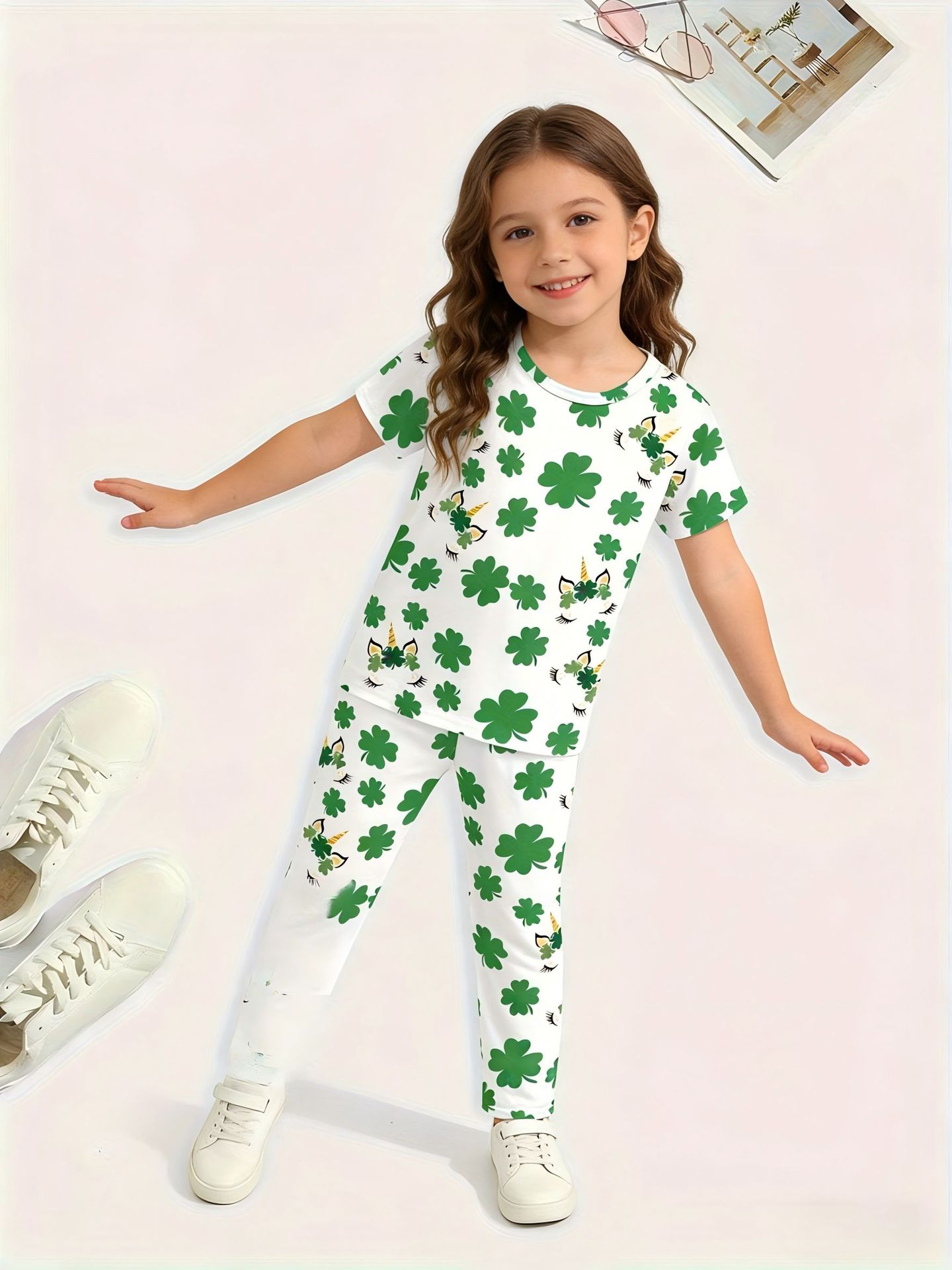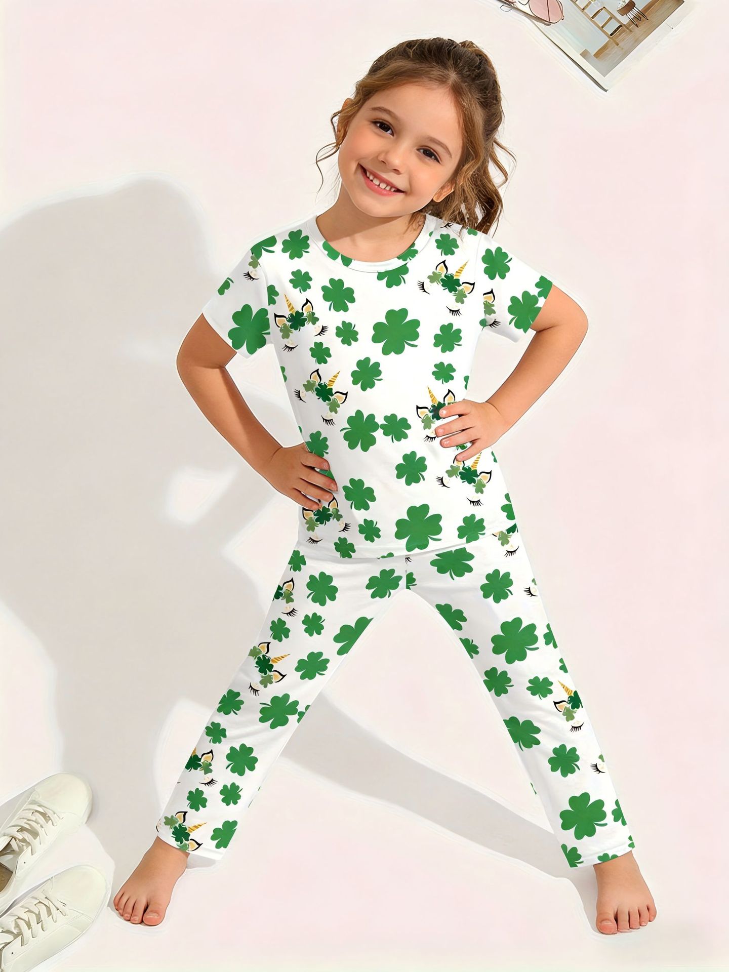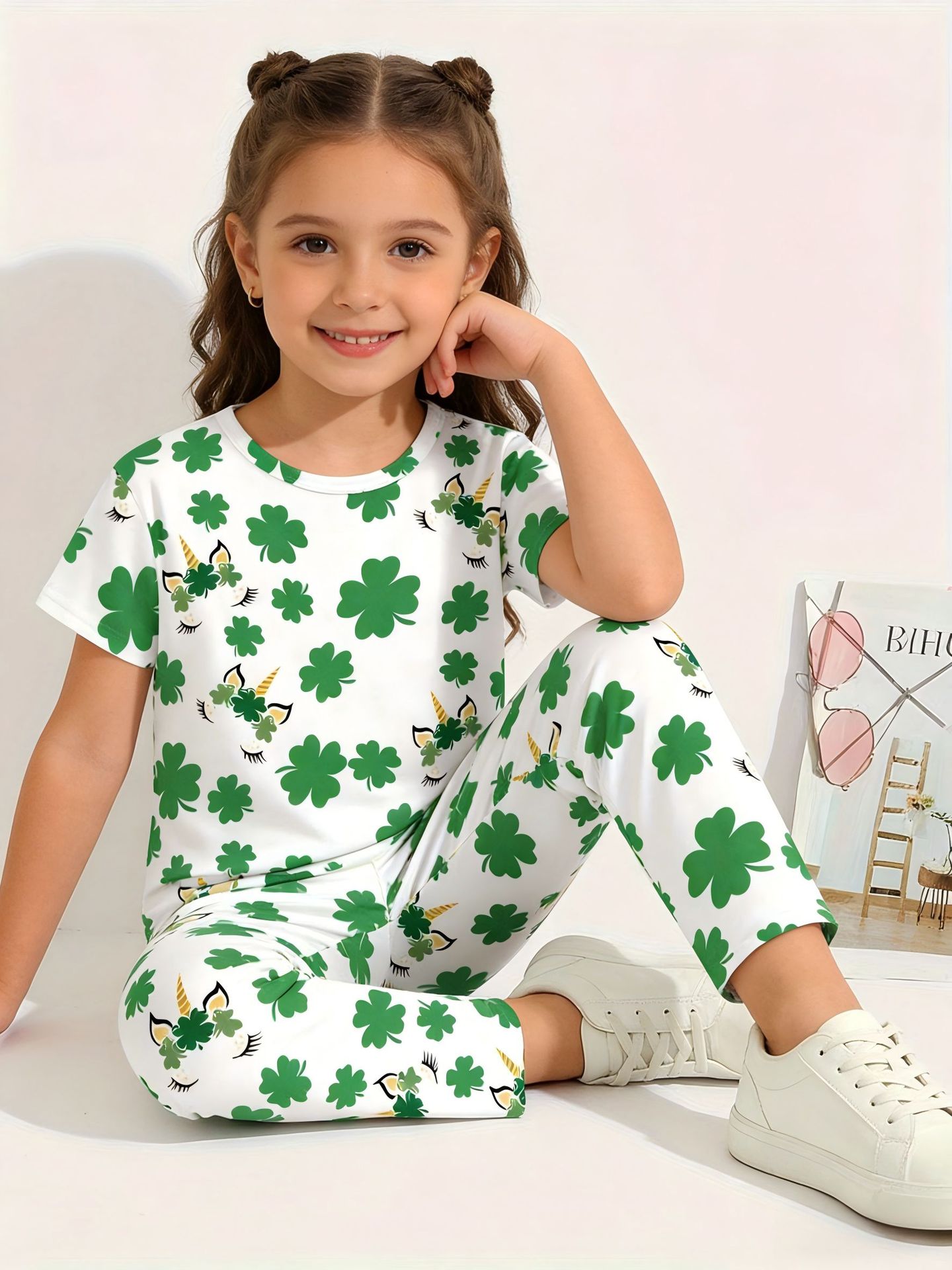 어린이 의류 여름 에어컨 의류 반팔 바지 중소 및 대형 어린이 4 잎 클로버 인쇄 풀 플라워 세트 티셔츠 소년 소녀 용 파자마스토어 가기
