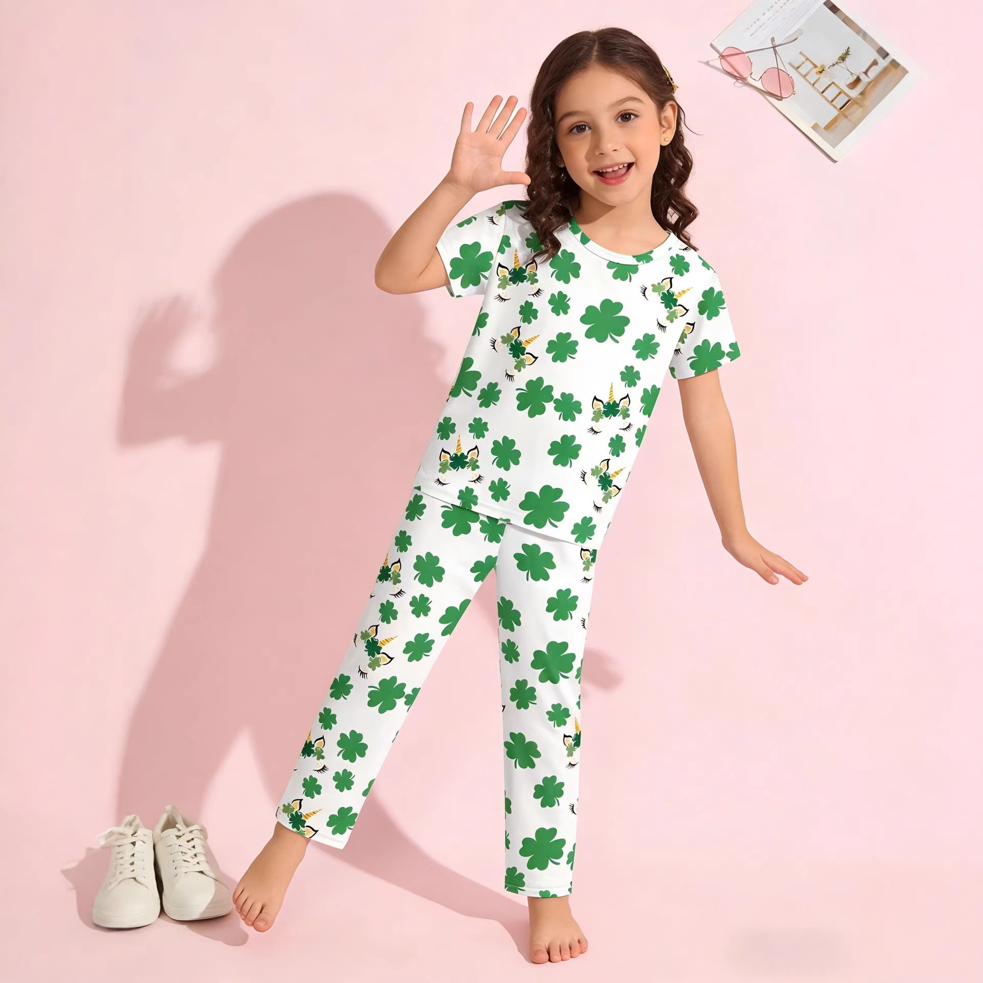 어린이 의류 여름 에어컨 의류 반팔 바지 중소 및 대형 어린이 4 잎 클로버 인쇄 풀 플라워 세트 티셔츠 소년 소녀 용 파자마
