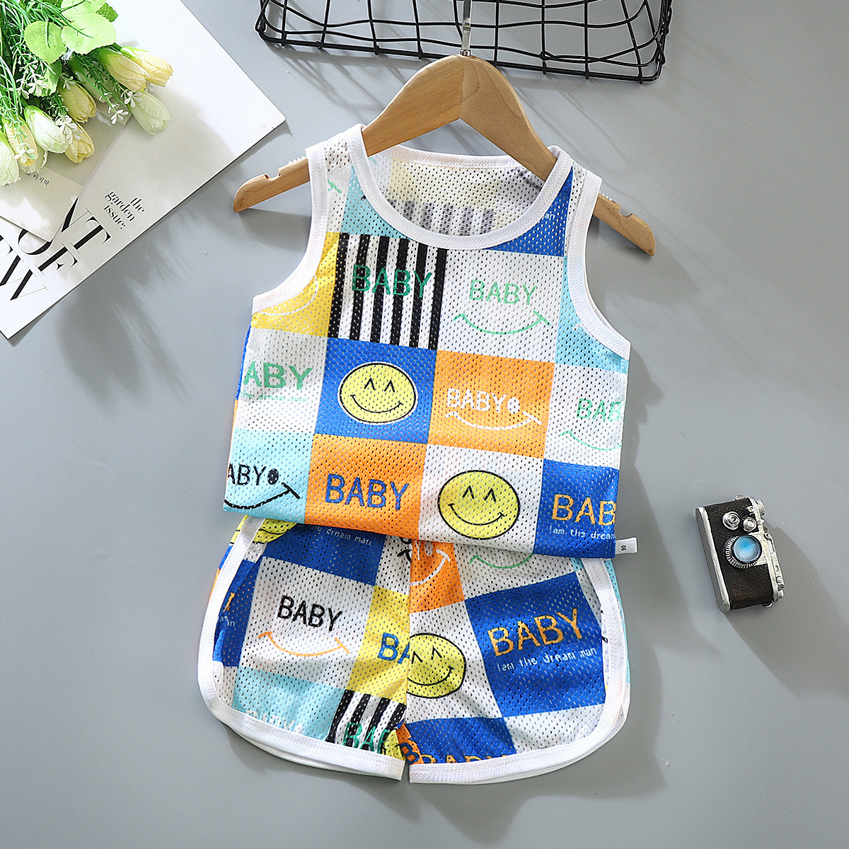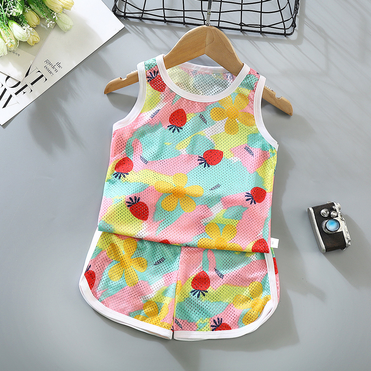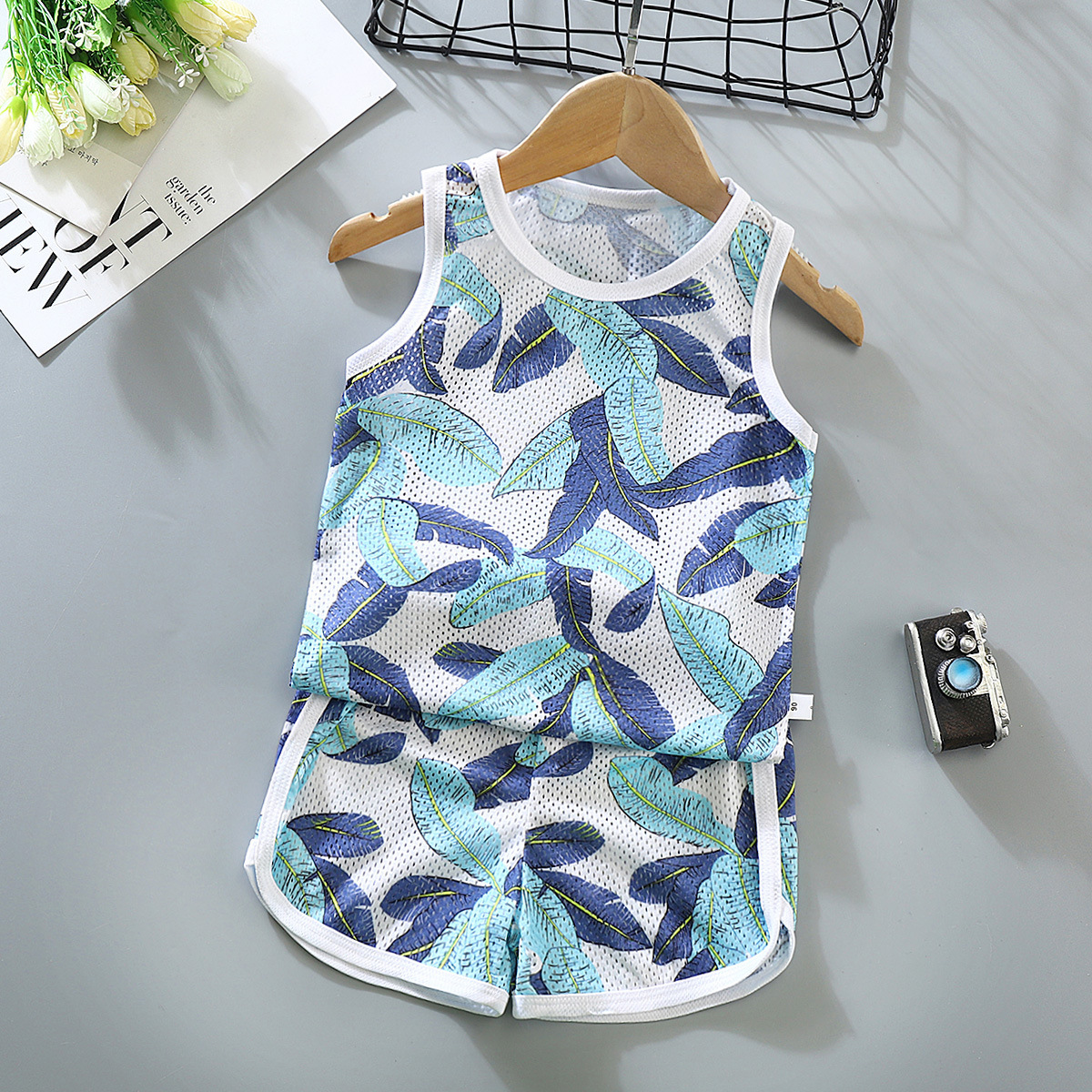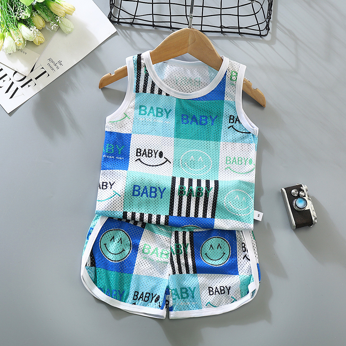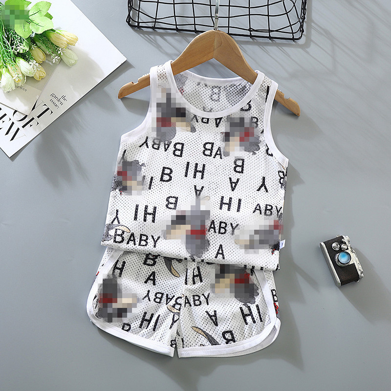 2024 새로운 어린이 얇은 중공 조끼 세트 소년 소녀 아기 여름 메쉬 통기성 민소매 투피스 세트