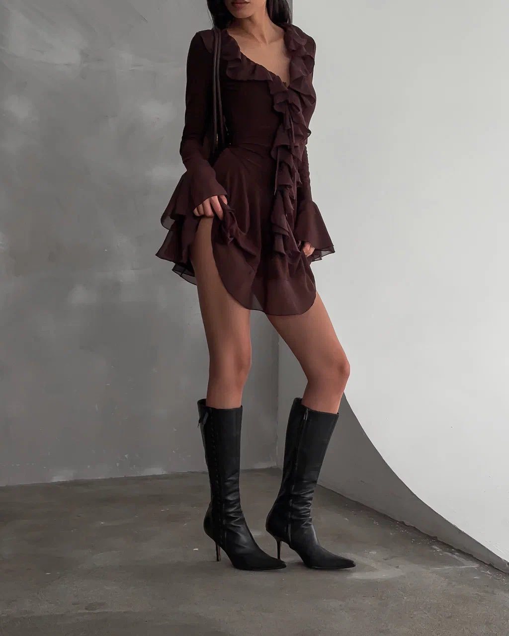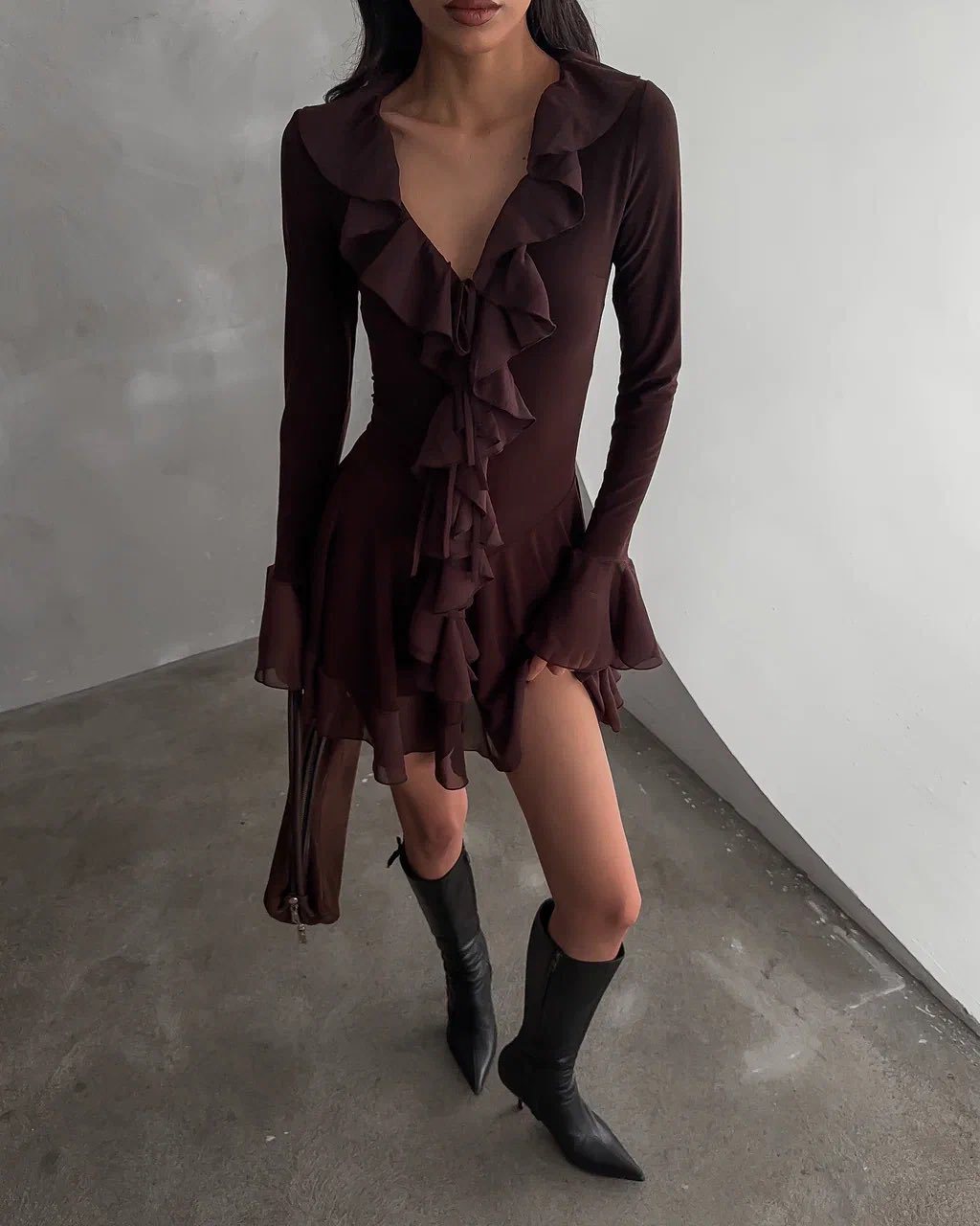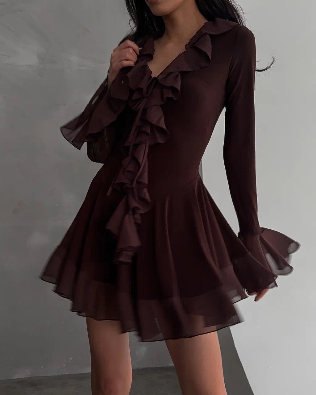 2025春季新品轻熟气质纯色深v荷叶花边拼接喇叭袖网纱短款连衣裙