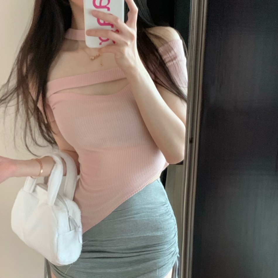 뜨거운 소녀 순수한 욕망 스타일 한 캐릭터 칼라 걸이 목 할로우 어깨 짧은 티셔츠 여성 디자인 센스 타이트베이스 탑