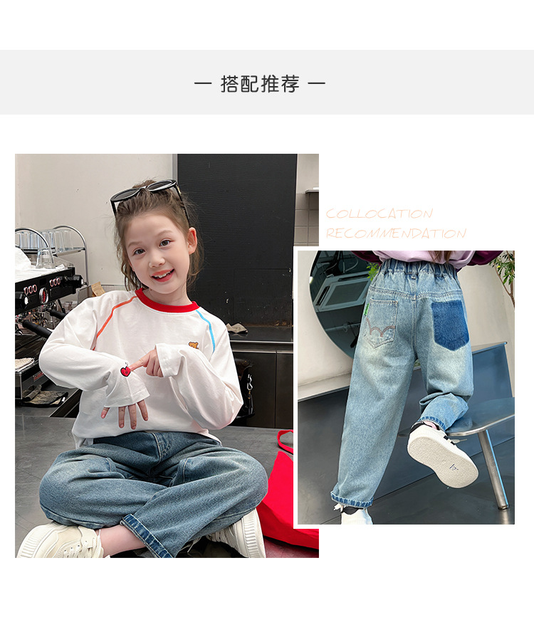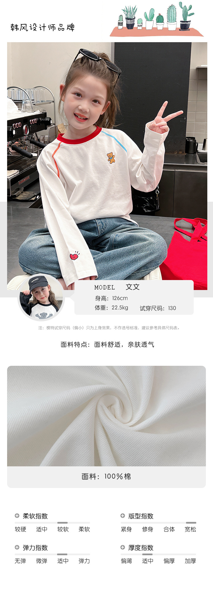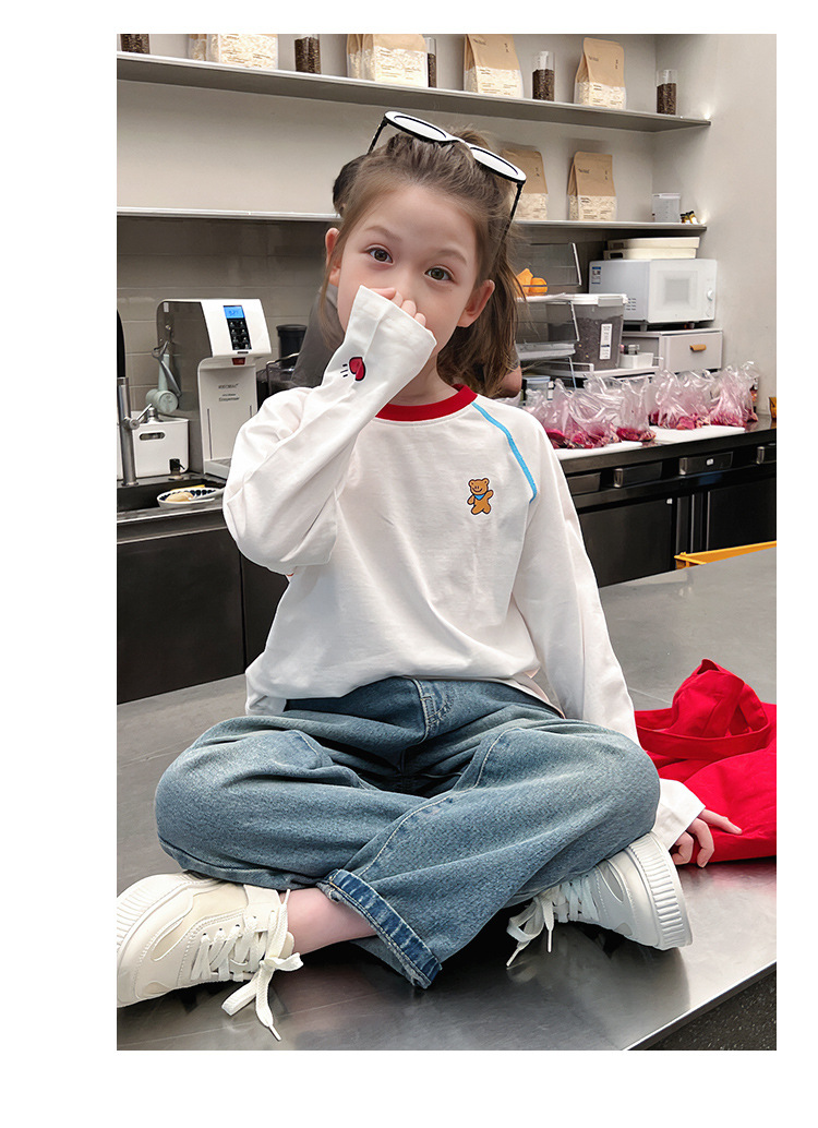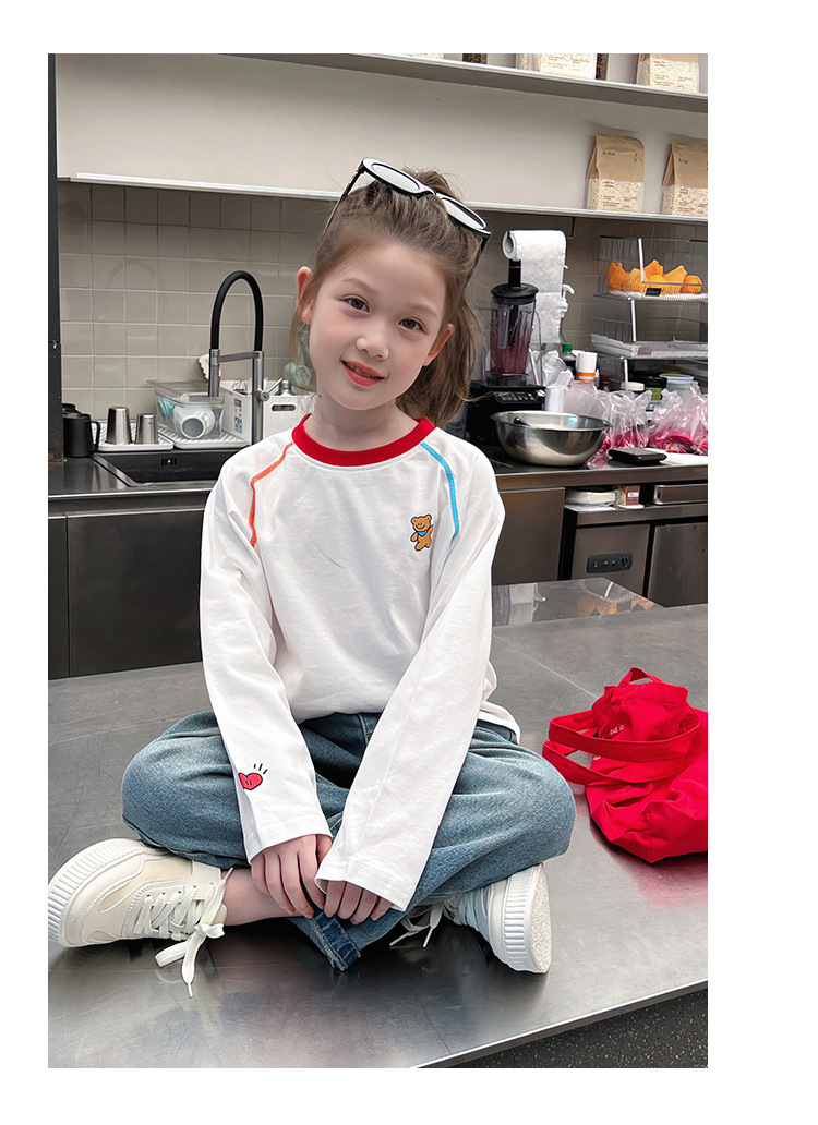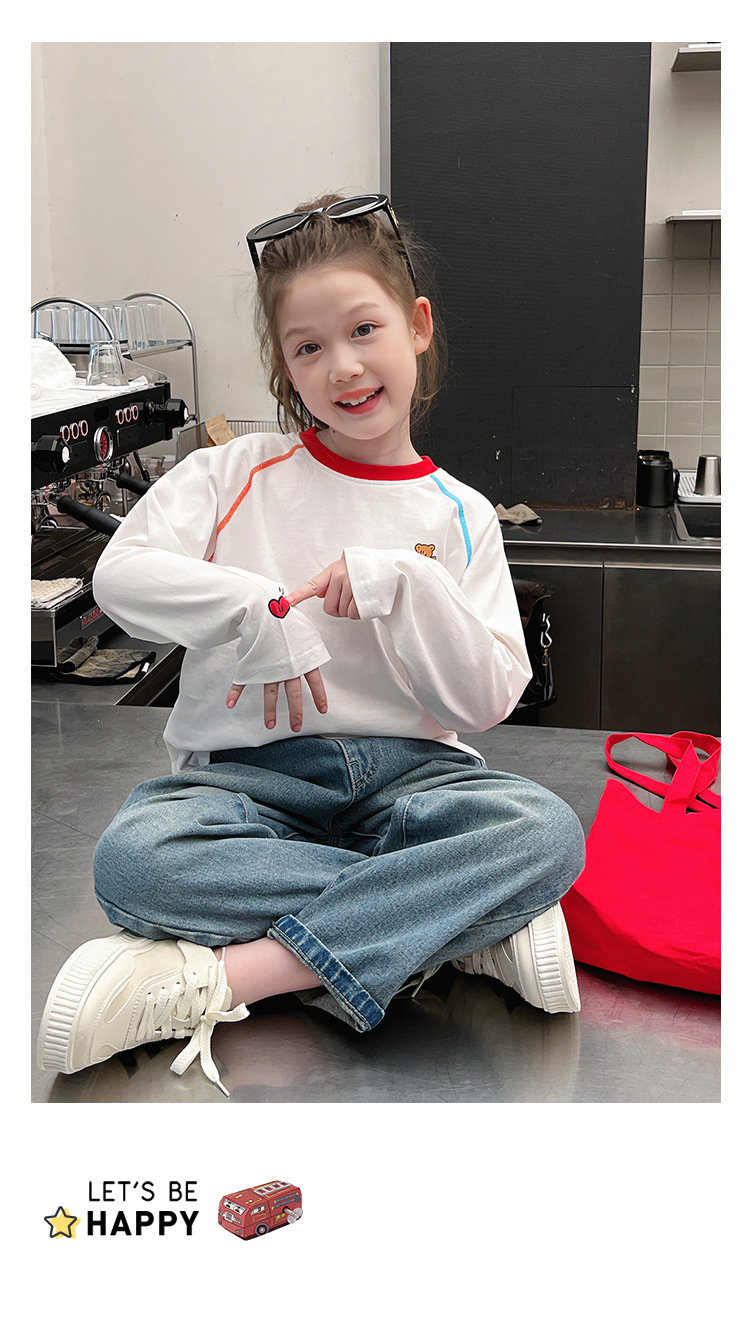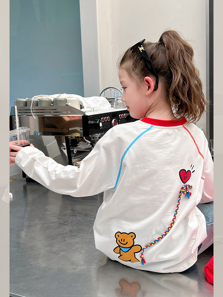 퓨어 코튼 어린이 사이버 연예인 명암 흰색 티셔츠 소녀 서양식 베이스 셔츠 큰 아동복 긴 소매 2025 봄 새로운 스타일스토어 가기